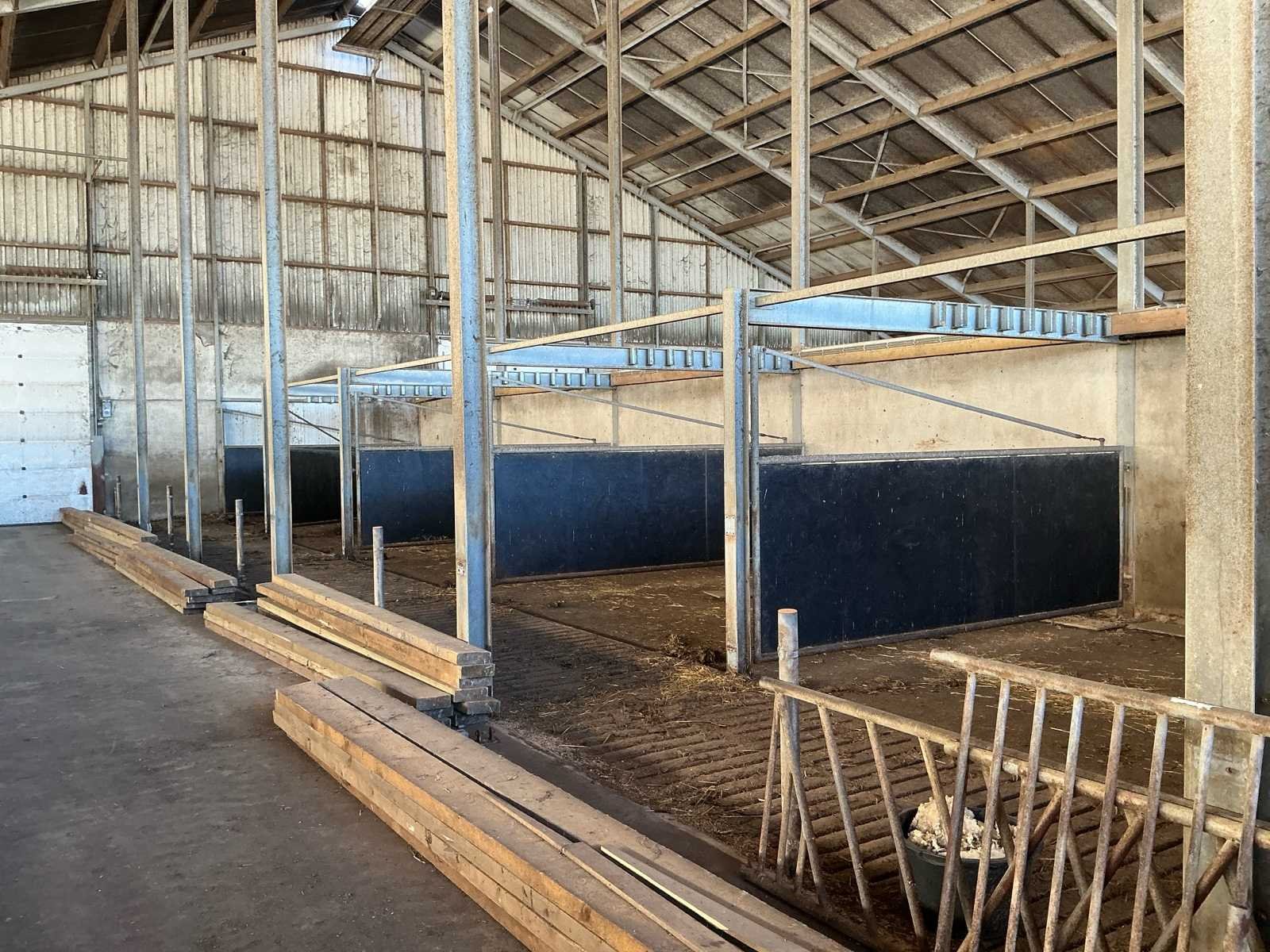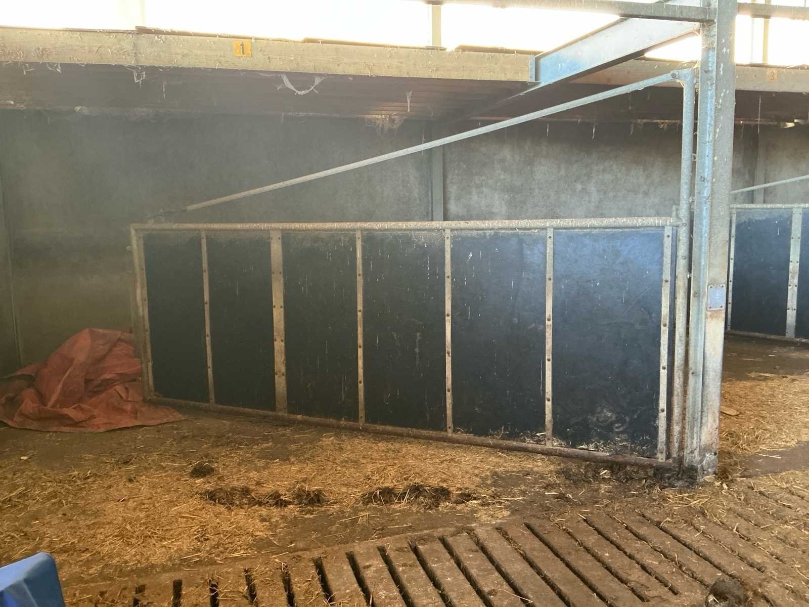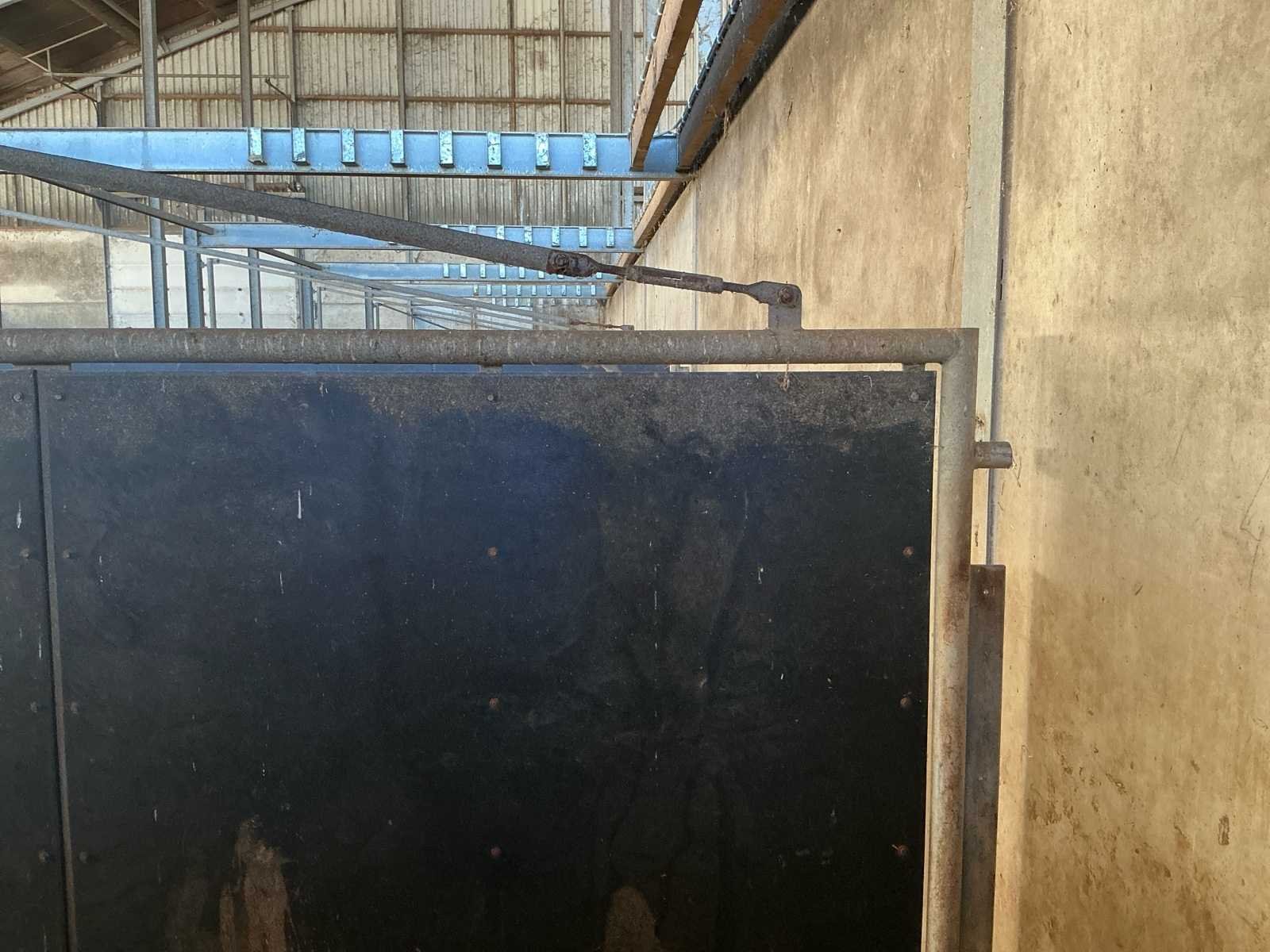 Bestaat uit: 12 stuks, stalen draaipoorten, uitgevoerd in zware agrarische kwaliteit, afmetingen per poort: breedte: 4.800 mm, hoogte: 1.650 mm, hoogte buisconstructie: 2.500 mm, scharnieren: 4 per poort, scharnierstift: Ø ca. 100 mm, lengte: 2.500 mm, bevestigd met 10 bouten per scharnieropstelling, Merk: Schotten / poort