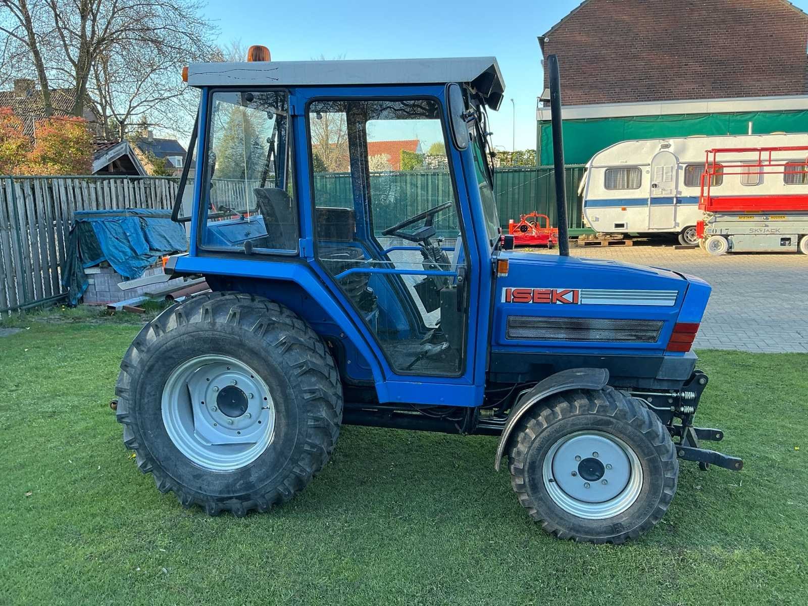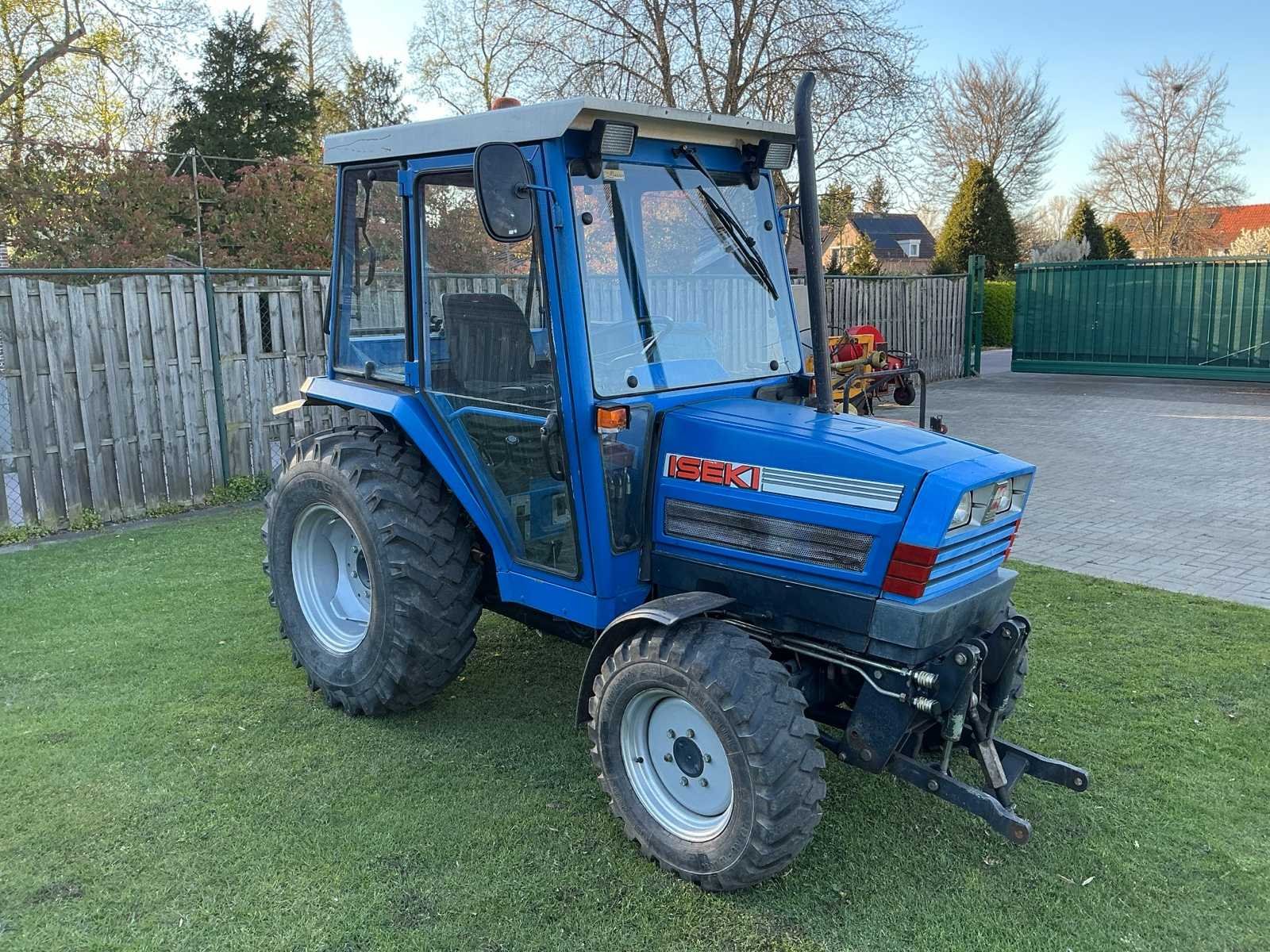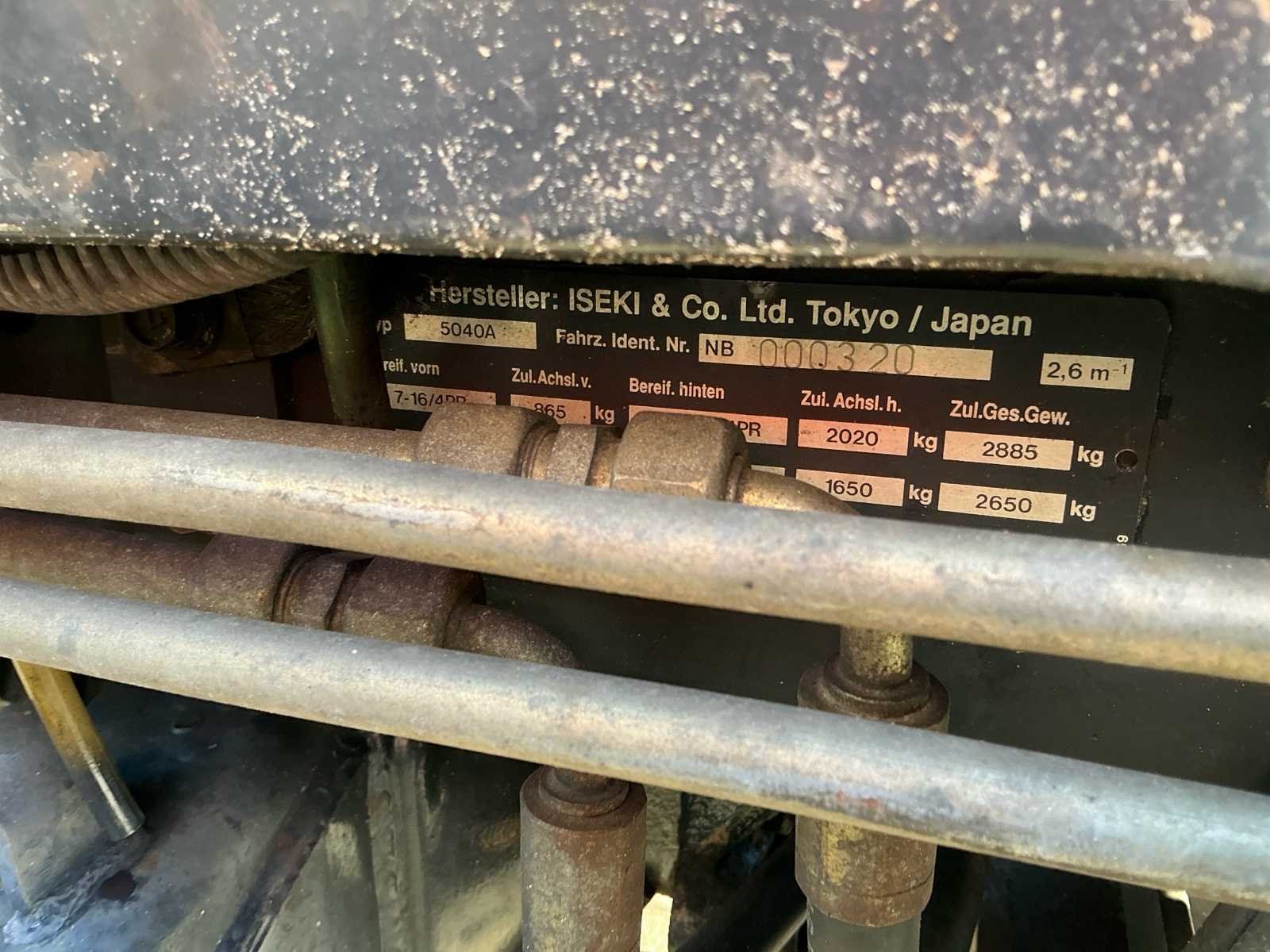 Voorzien van: 4WD, fronthef Cat 1, frontaftakas, hydr.ventiel voorzijde, cabine, verwarming, aftakas 540-1000, Cat 1 hefinrichting achter, 1300kg hefvermogen, 1 hydr.ventiel achter, vrije retour, aftakas, voorbanden 28x9.00-15, achterbanden 14.5-20, zwaailamp, 7 polige stekker achterzijde, lucht geveerde stoel, 16x16 versnellingsbak, shuttle-shift. Merk: Iseki Type: 5040A Bouwjaar: 1996 Motorvermogen (kW): 29kW Afgelezen urenstand: 1936 Aftakastoerental: 540-1000rpm Aantal hydraulische ventielen voor: 1 Aantal hydraulische ventielen achter: 2 Bandenmaat voor: 28x9.00-15 Bandenmaat achter: 14.5-20 Fronthefinrichting: true Frontaftakas: true Cabine: true Luchtgeveerde stoel: true Totale afmeting L: 3050mm Totale afmeting Breedte: 1380mm Totale afmeting Hoogte: 2100mm Kentekenpapieren compleet?: true Chassisnummer: NB000320 Nationaliteit documenten: Duits Zelf rijdend exporteren: Mogelijk