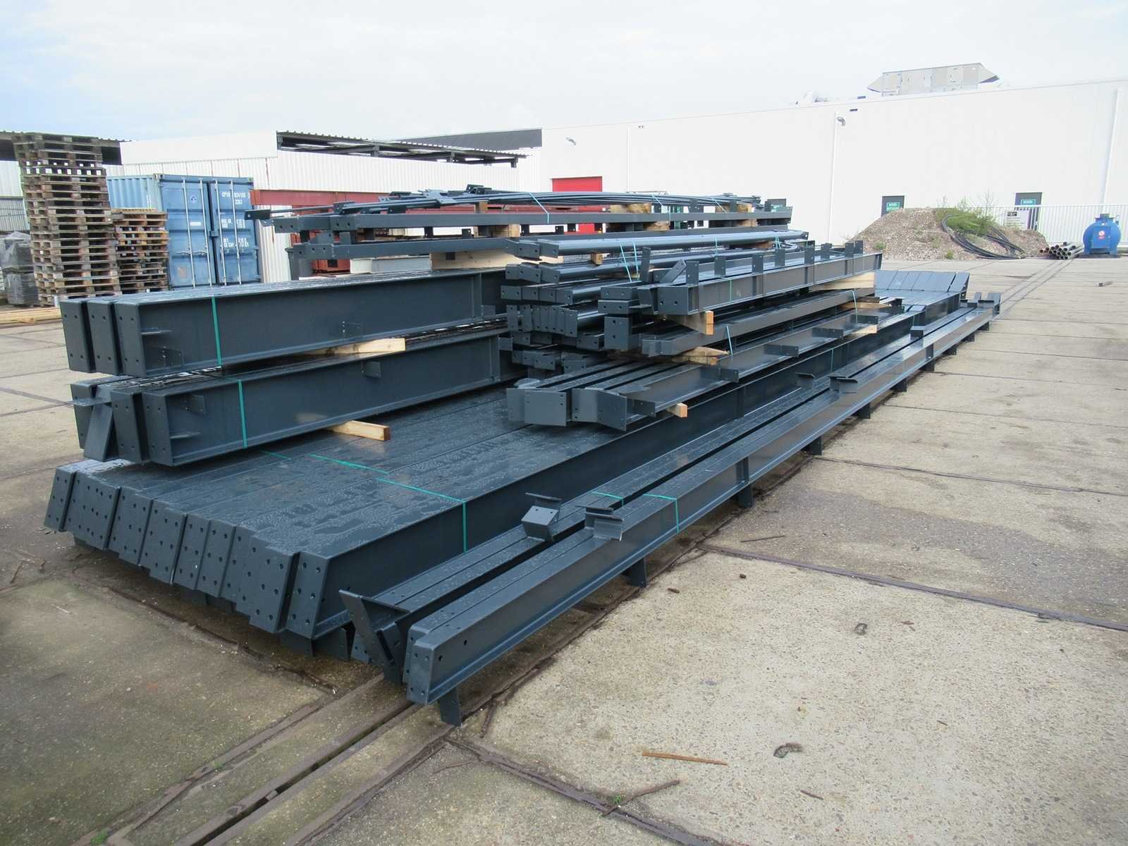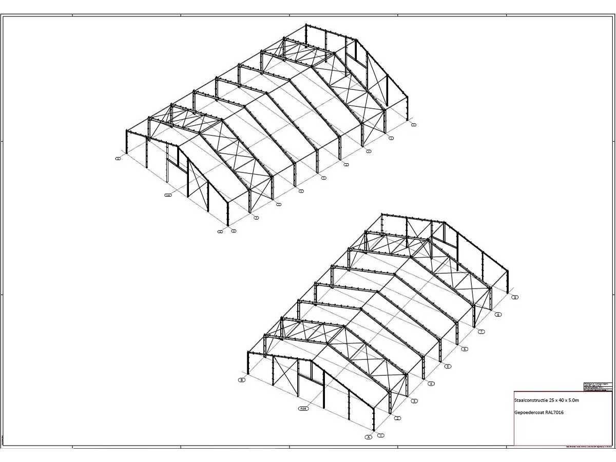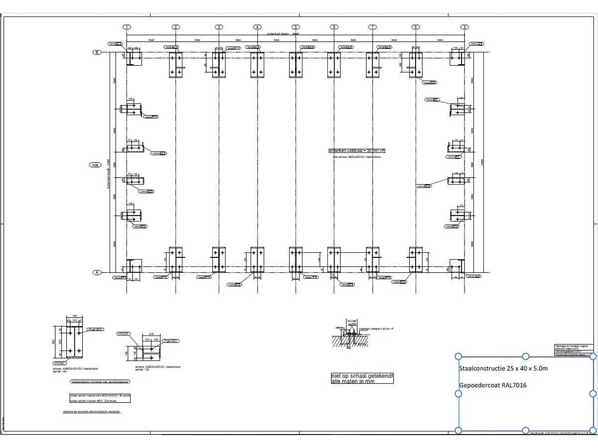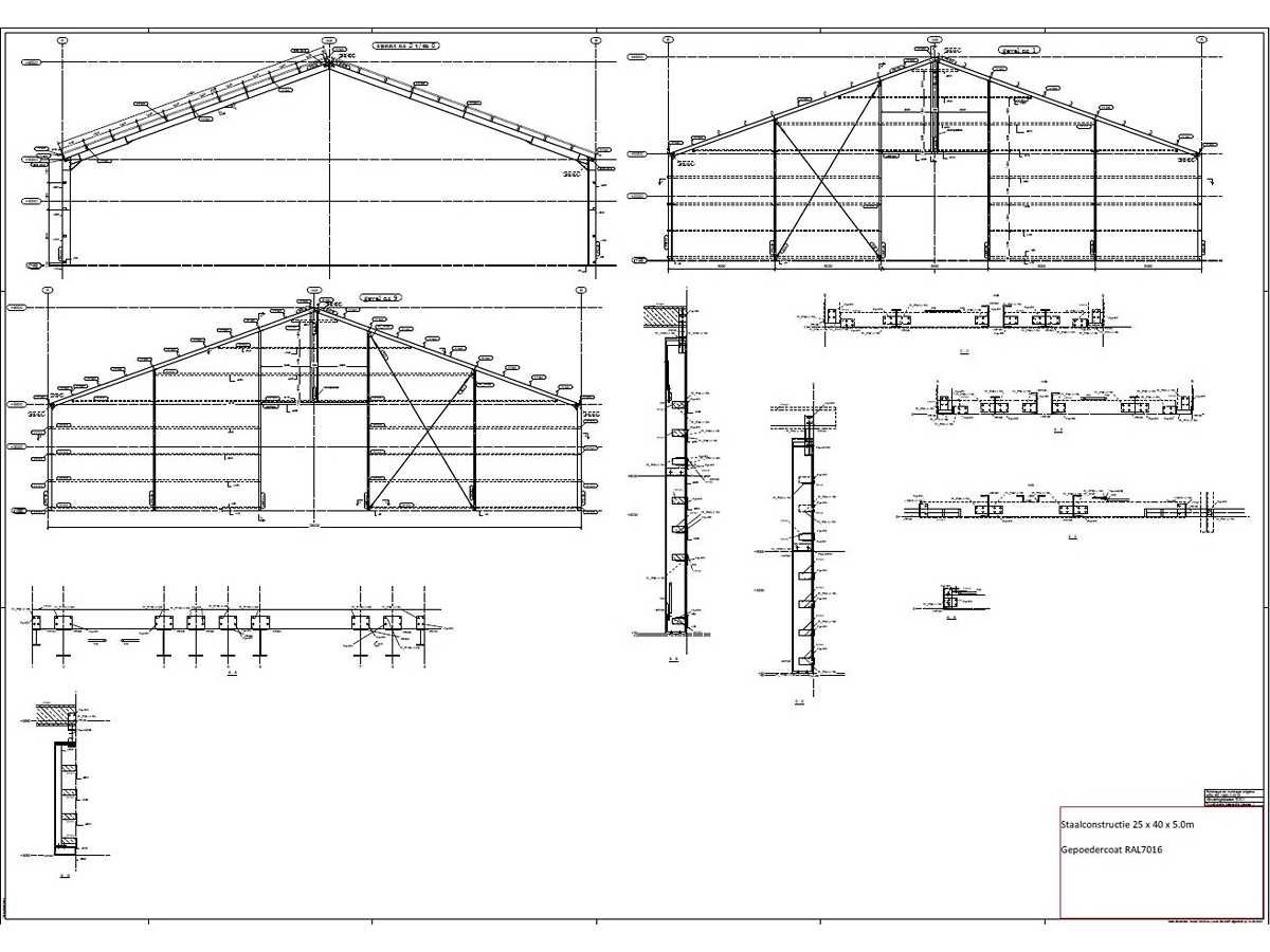 Nederlandse productie; vrije overspanning; spanten h.o.h. 5000mm; staalberekeningen; staaltekeningen; montagetekeningen; ankerplan; staal genummerd volgens montageplan; dakhelling 20 graden; 7 sets tussenspanten IPE360/300; 2 sets eindspanten IPE 200/180 met windstijlen waarvan 1 set voorzien is van een deursparing; voorzien van drukkokers; windverbanden; gordinglippen; bouten en moeren; meestort ankers; staalconstructie volgens productnorm EN1090 (Certificaat na aankoop verkrijgbaar); kavel ligt netjes transportklaar en dient met 1 trailer opgehaald te worden; kavel wordt gratis met een heftruck geladen Materiaal: Gepoedercoat staal antraciet Bouwjaar: 2026 Totaal oppervlakte: 1000m² Nok hoogte: 9550mm Goot hoogte: 5000mm Totale afmeting L: 40000mm Totale afmeting Breedte: 25000mm