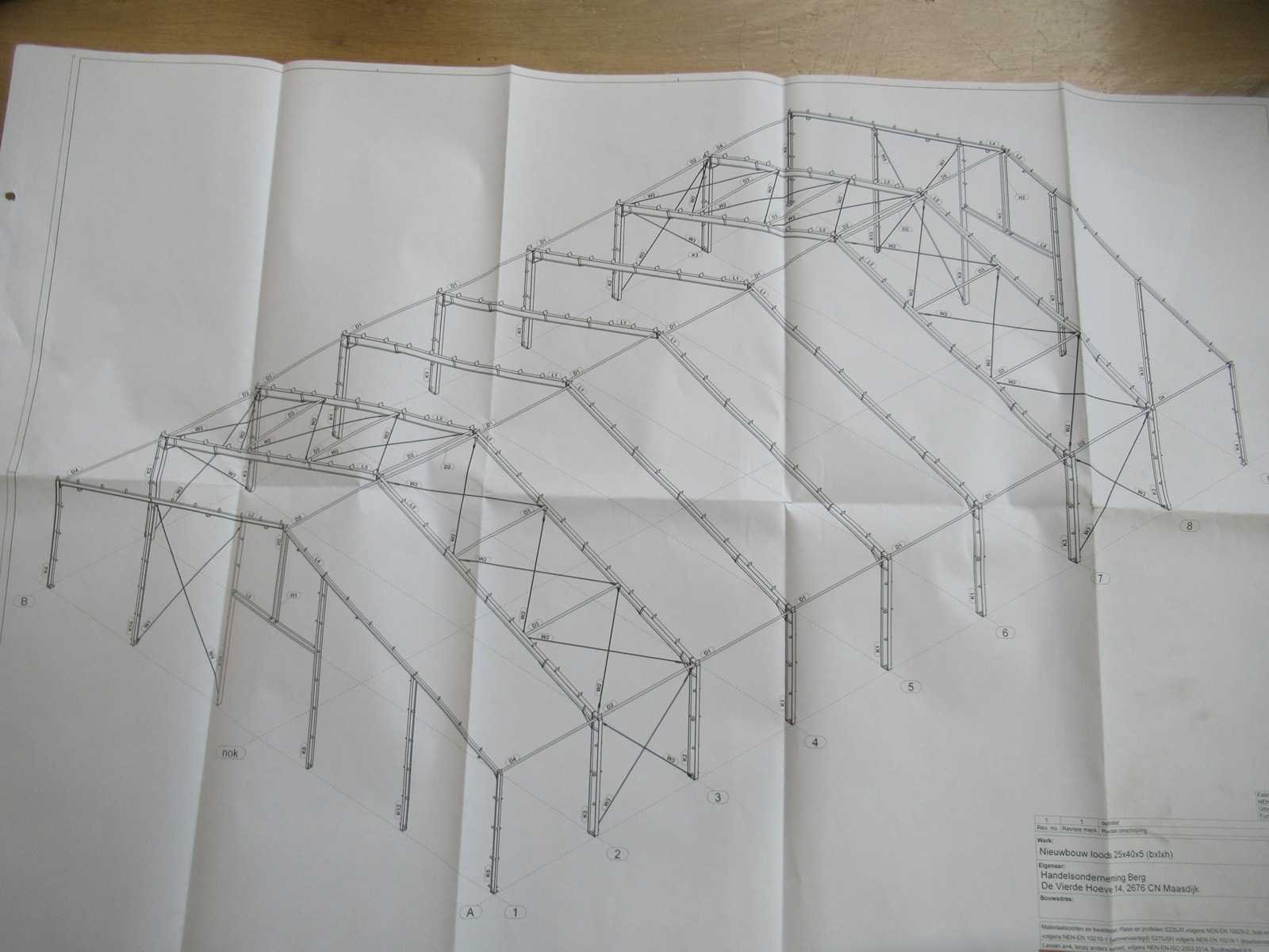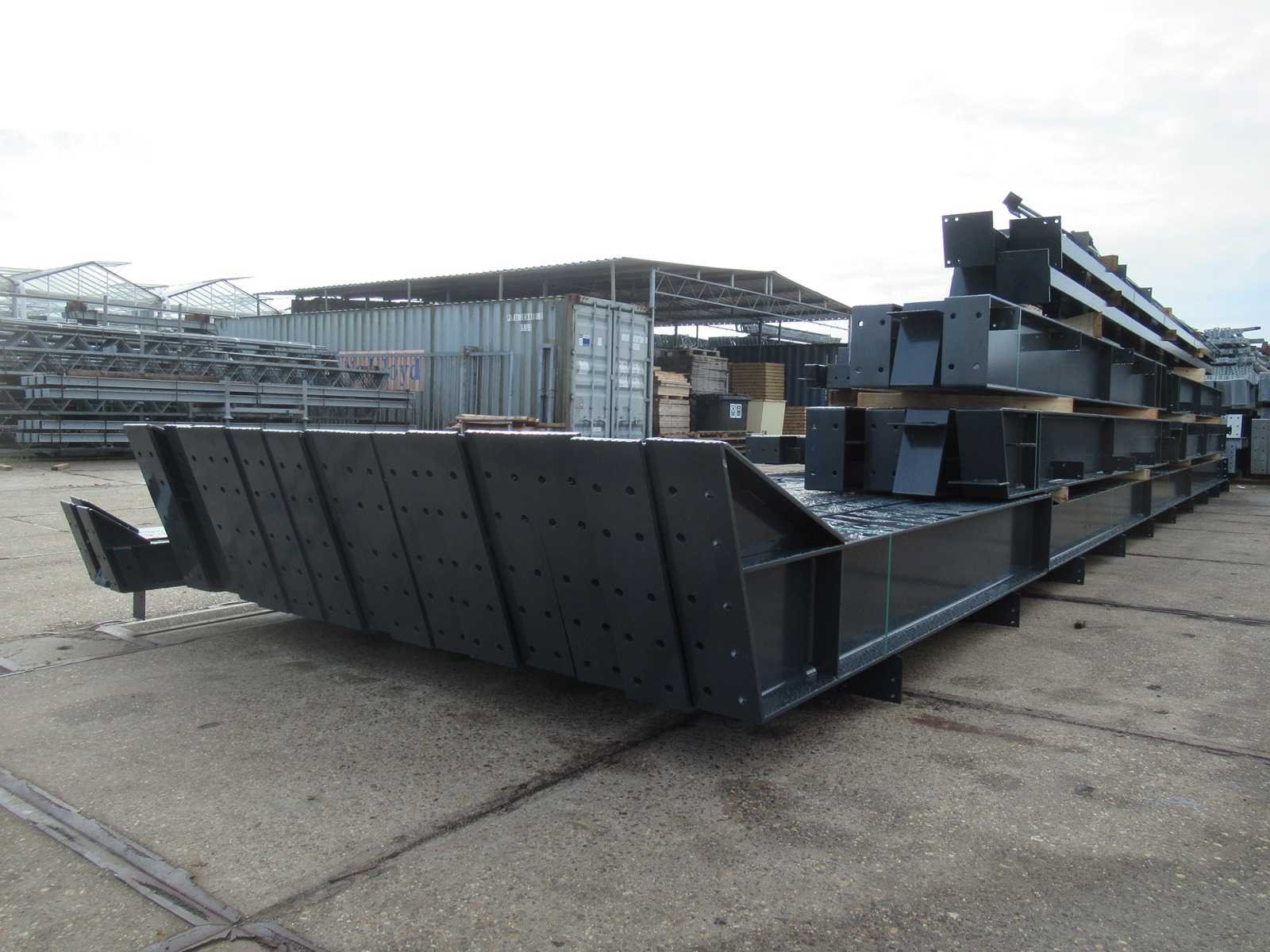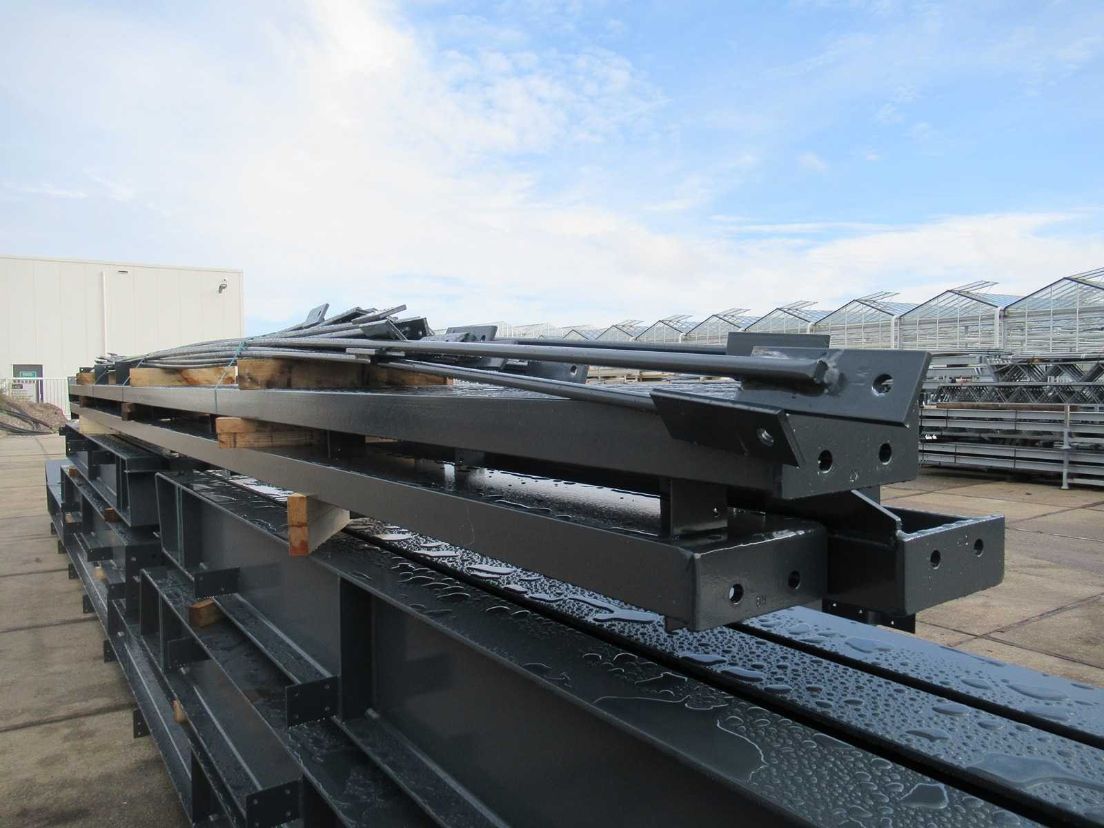 Nederlandse productie; vrije overspanning; spanten h.o.h. 5000mm; staalberekeningen; staaltekeningen; montagetekeningen; ankerplan; staal genummerd volgens montageplan; dakhelling 20 graden; 7 sets tussenspanten IPE360/300; 2 sets eindspanten IPE 200/180 met windstijlen waarvan 1 set voorzien is van een deursparing; voorzien van drukkokers; windverbanden; gordinglippen; bouten en moeren; meestort ankers; staalconstructie volgens productnorm EN1090 (Certificaat na aankoop verkrijgbaar); kavel ligt netjes transportklaar en dient met 1 trailer opgehaald te worden; kavel wordt gratis met een heftruck geladen Materiaal: Gepoedercoat staal antraciet Bouwjaar: 2026 Totaal oppervlakte: 1000m² Nok hoogte: 9550mm Goot hoogte: 5000mm Totale afmeting L: 40000mm Totale afmeting Breedte: 25000mm