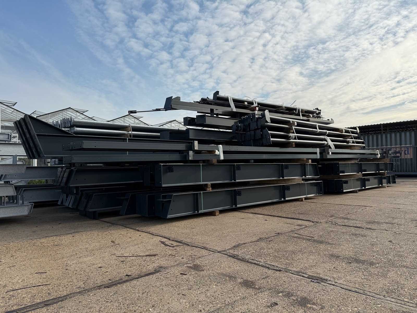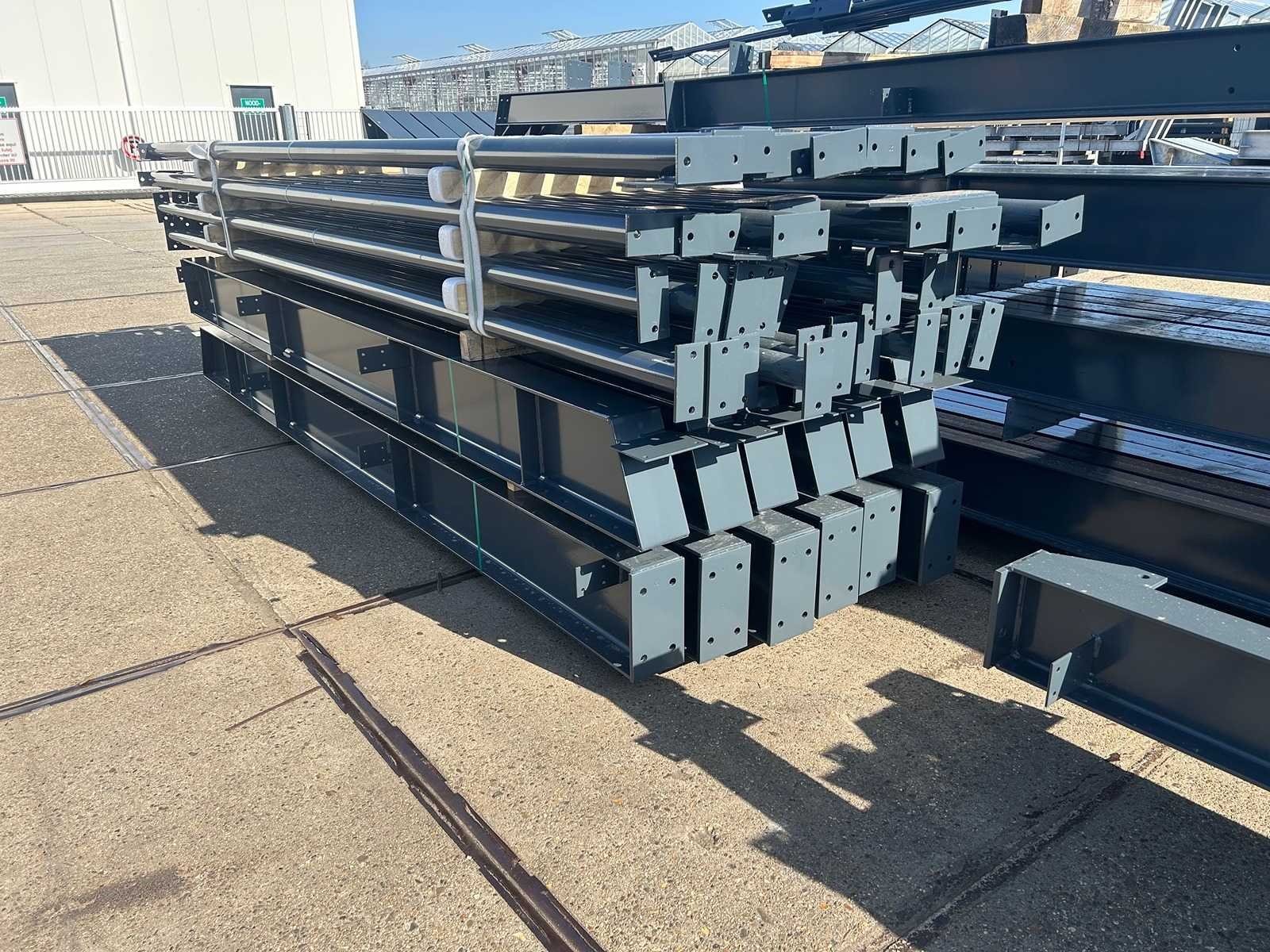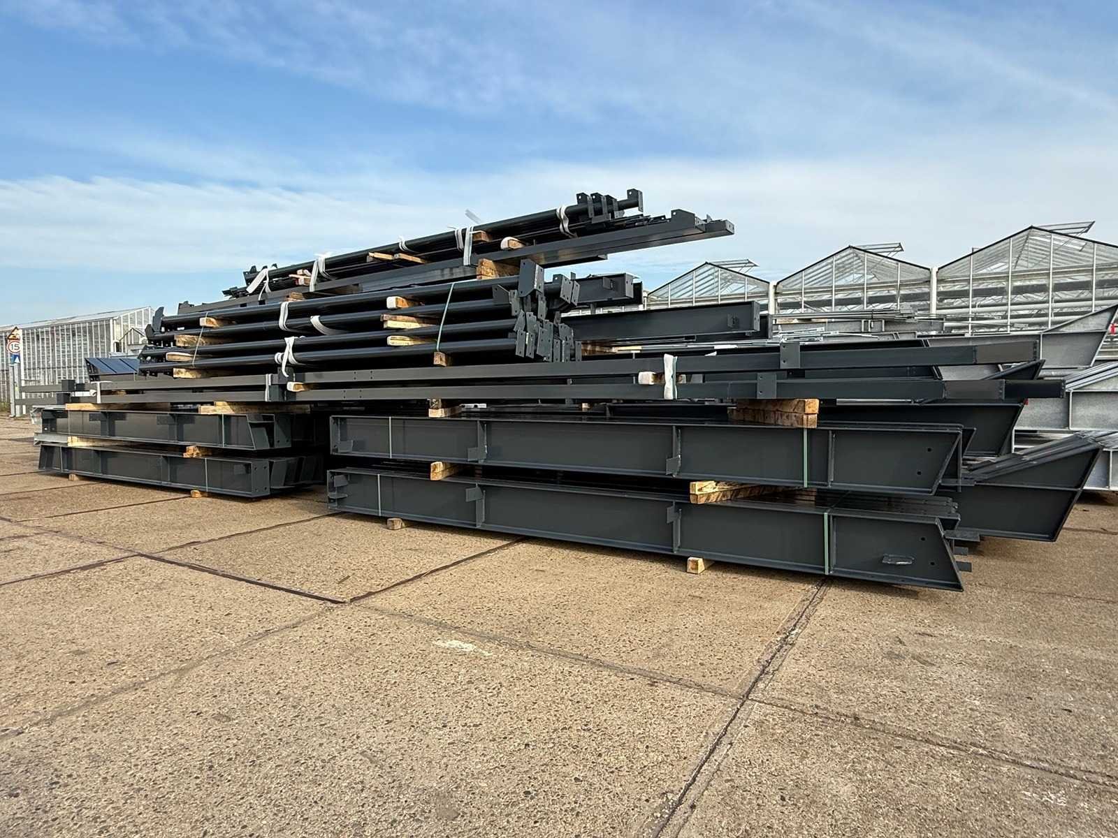Nederlandse productie; vrije overspanning; spanten h.o.h. 5000mm; staalberekeningen; staaltekeningen; montagetekeningen; ankerplan; staal genummerd volgens montageplan; dakhelling 20 graden; 9 sets tussenspanten IPE330/270; 2 sets eindspanten IPE 220/200/180 met windstijlen waarvan 1 set voorzien is van een deursparing UNP220; voorzien van drukkokers; windverbanden; gordinglippen; bouten en moeren; meestort ankers; staalconstructie volgens productnorm EN1090 (Certificaat na aankoop verkrijgbaar); kavel ligt netjes transportklaar en dient met 1 trailer opgehaald te worden; kavel wordt gratis met een heftruck geladen Materiaal: Gepoedercoat staal antraciet Bouwjaar: 2026 Totaal oppervlakte: 1100m² Nok hoogte: 8504mm Goot hoogte: 4500mm Totale afmeting L: 50000mm Totale afmeting Breedte: 22000mm