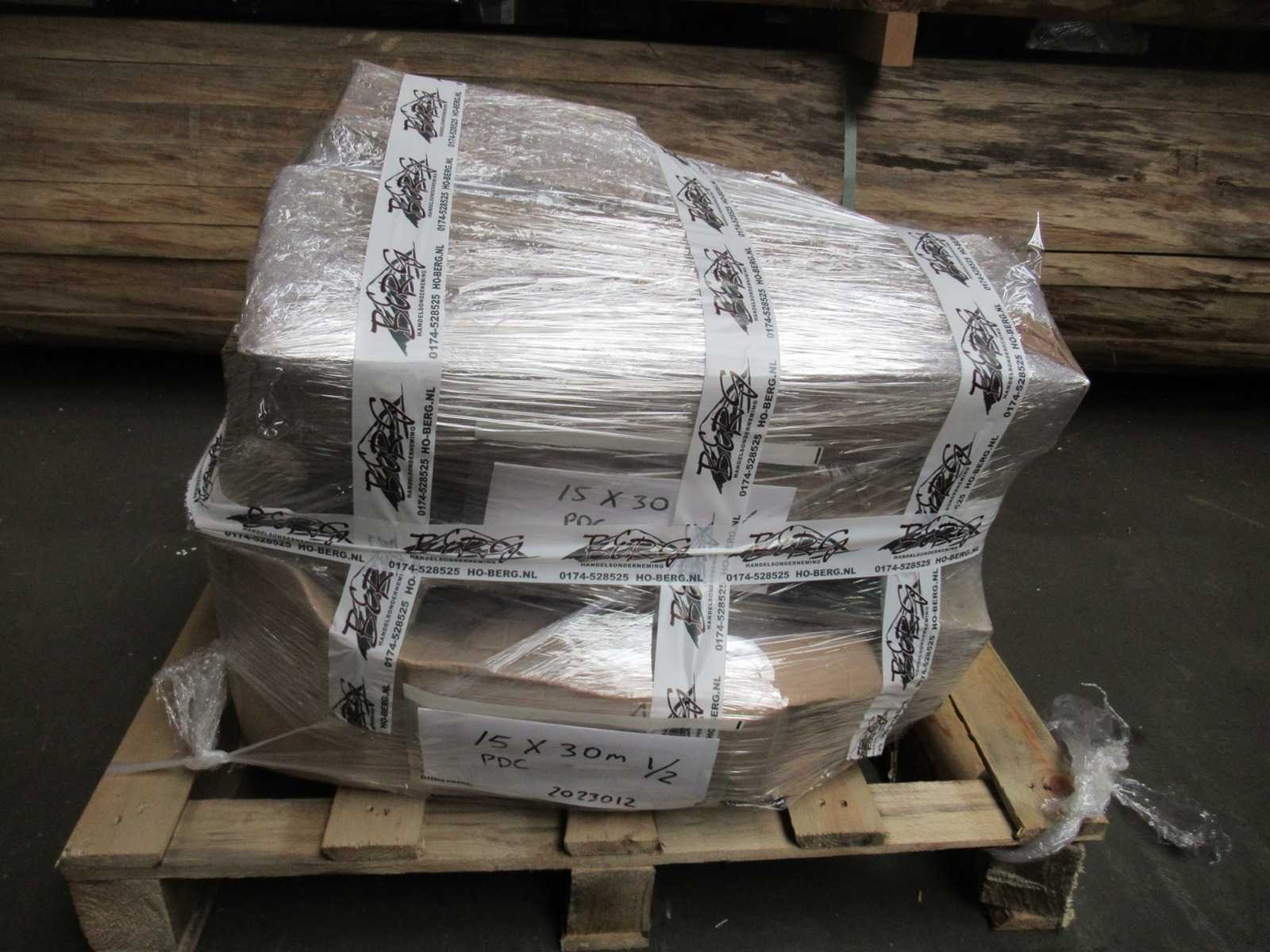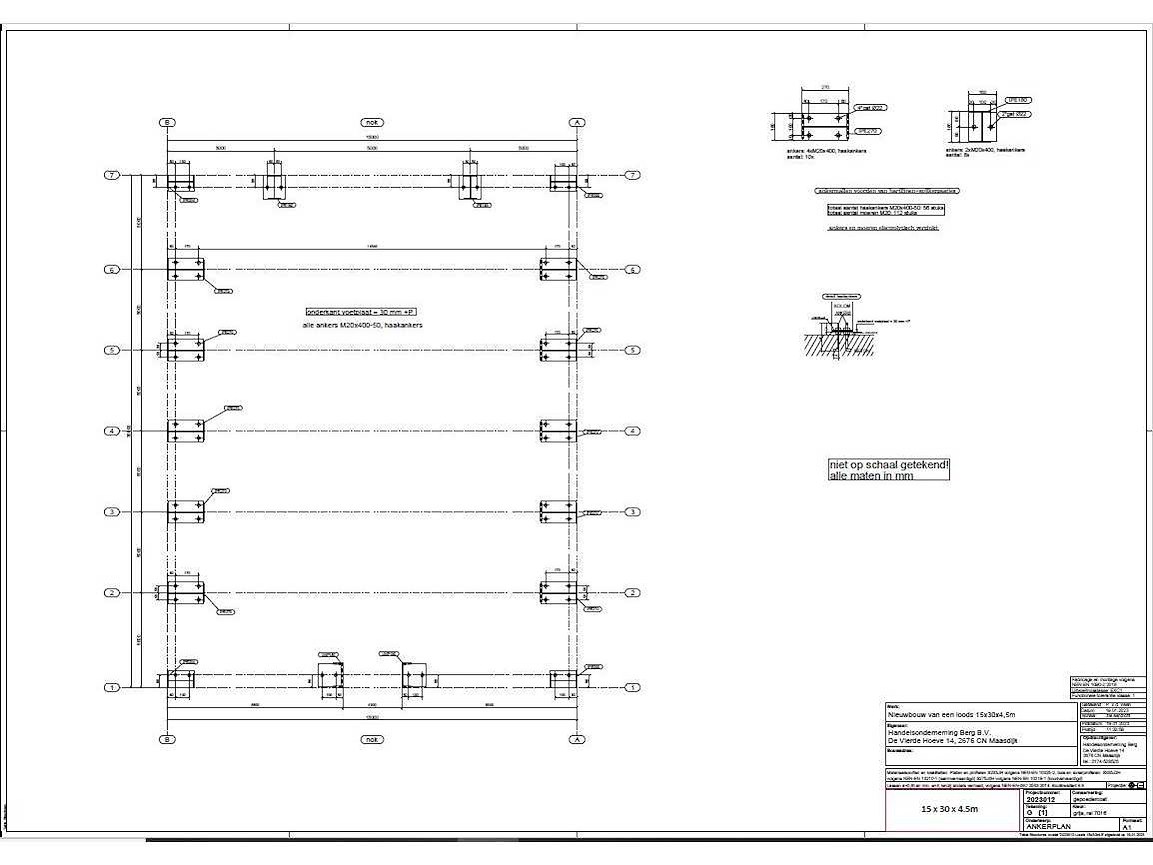Nederlandse productie; vrije overspanning; spanten h.o.h. 5000mm; staalberekeningen; staaltekeningen; montagetekeningen; ankerplan; staal genummerd volgens montageplan; dakhelling 20 graden; 5 sets tussenspanten IPE 270/240; 2 sets eindspanten IPE 200/180 met windstijlen waarvan 1 set voorzien is van een deursparing; voorzien van drukkokers; windverbanden; gordinglippen; bouten en moeren; meestort ankers; staalconstructie volgens productnorm EN1090 (Certificaat na aankoop verkrijgbaar); kavel ligt netjes transportklaar en dient met 1 trailer opgehaald te worden; kavel wordt gratis met een heftruck geladen Materiaal: gepoedercoat staal kleur antraciet Bouwjaar: 2026 Totaal oppervlakte: 450m² Nok hoogte: 7230mm Goot hoogte: 4500mm Totale afmeting L: 30000mm Totale afmeting Breedte: 15000mm