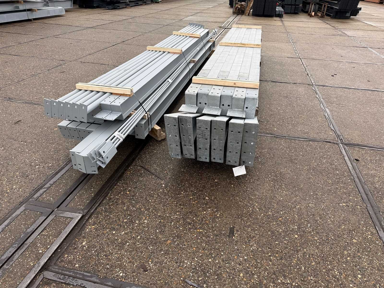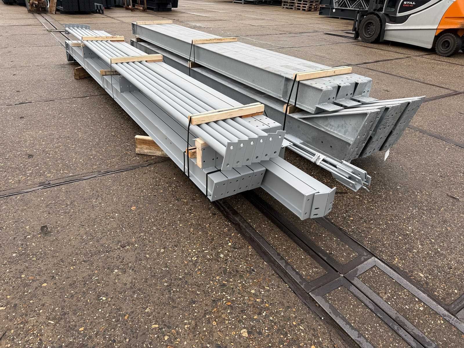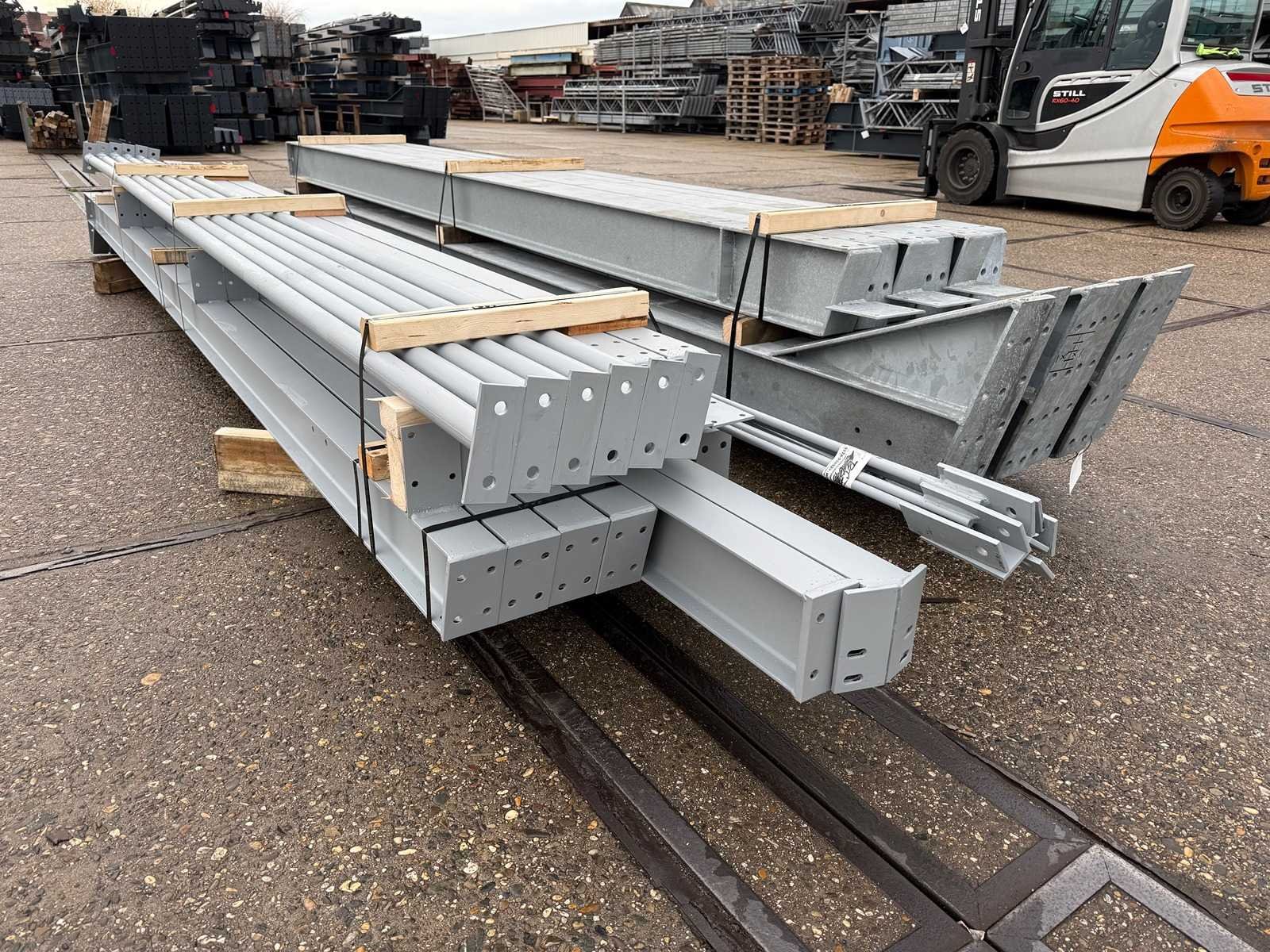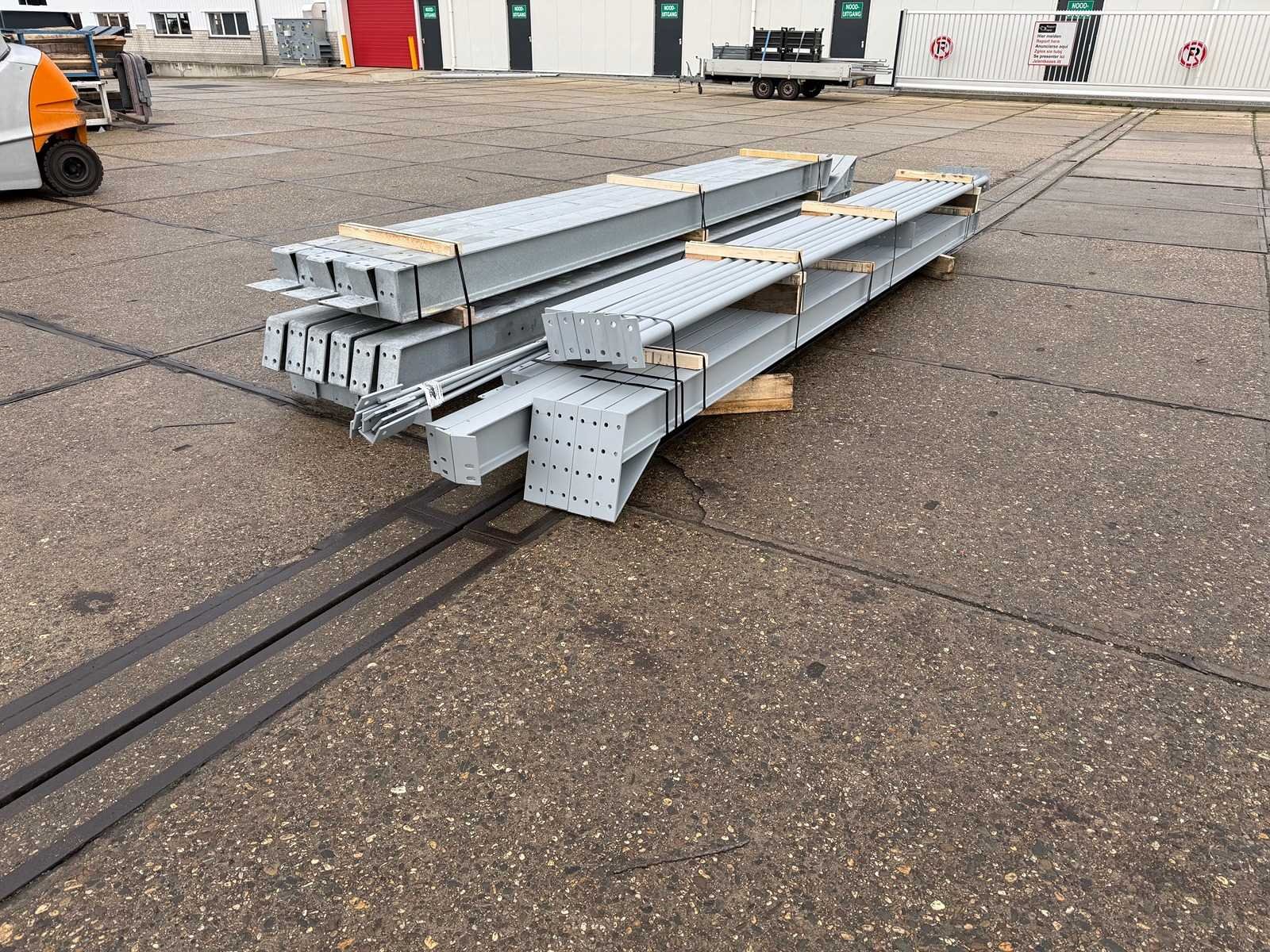 Vrije overspanning, spanten h.o.h. 5000mm, bestaande uit 3 sets tussenspanten IPE200, 2 sets eindspanten met windstijlen IPE160, voorzien van windverbanden, drukkokers, gordinglippen op de spanten, detailtekening tussenspanten, staalconstructie ligt netjes transportklaar en dient met 1 trailer opgehaald te worden, kavel wordt gratis geladen met een heftruck Materiaal: Thermisch verzinkt en geschilder staal Totaal oppervlakte: 200m² Nok hoogte: 5875mm Goot hoogte: 4500mm Totale afmeting L: 2000mm Totale afmeting Breedte: 10000mm