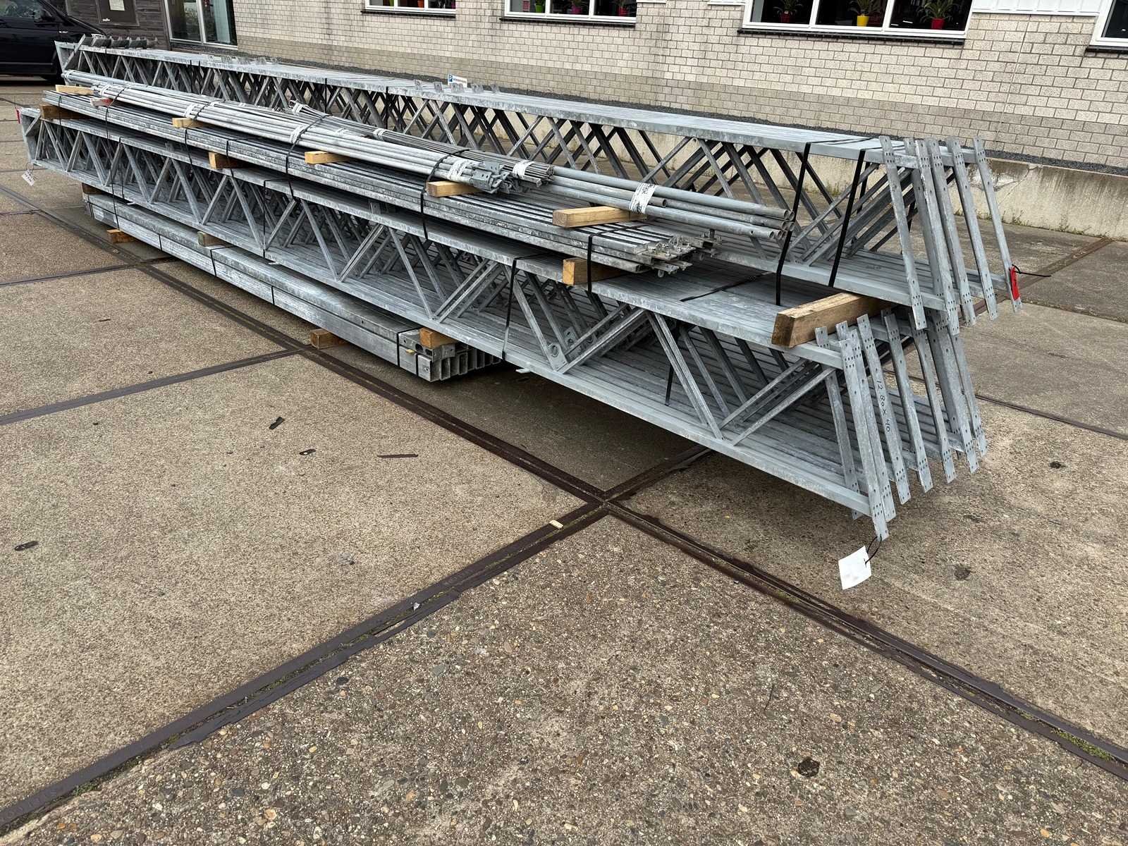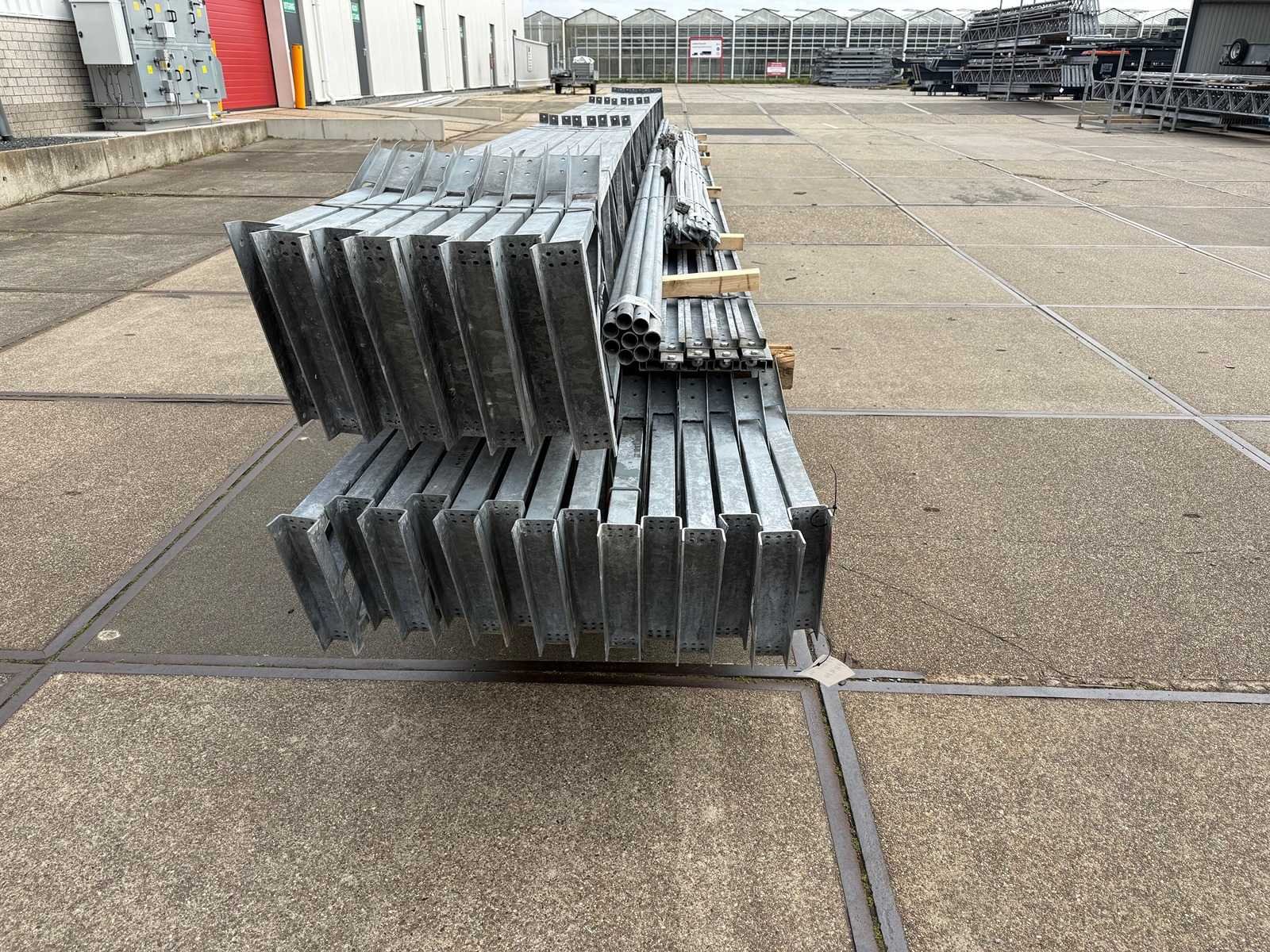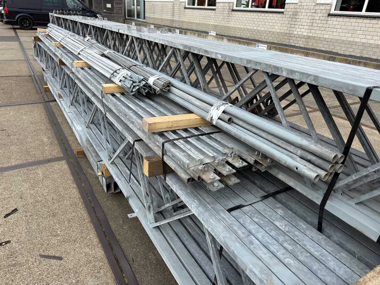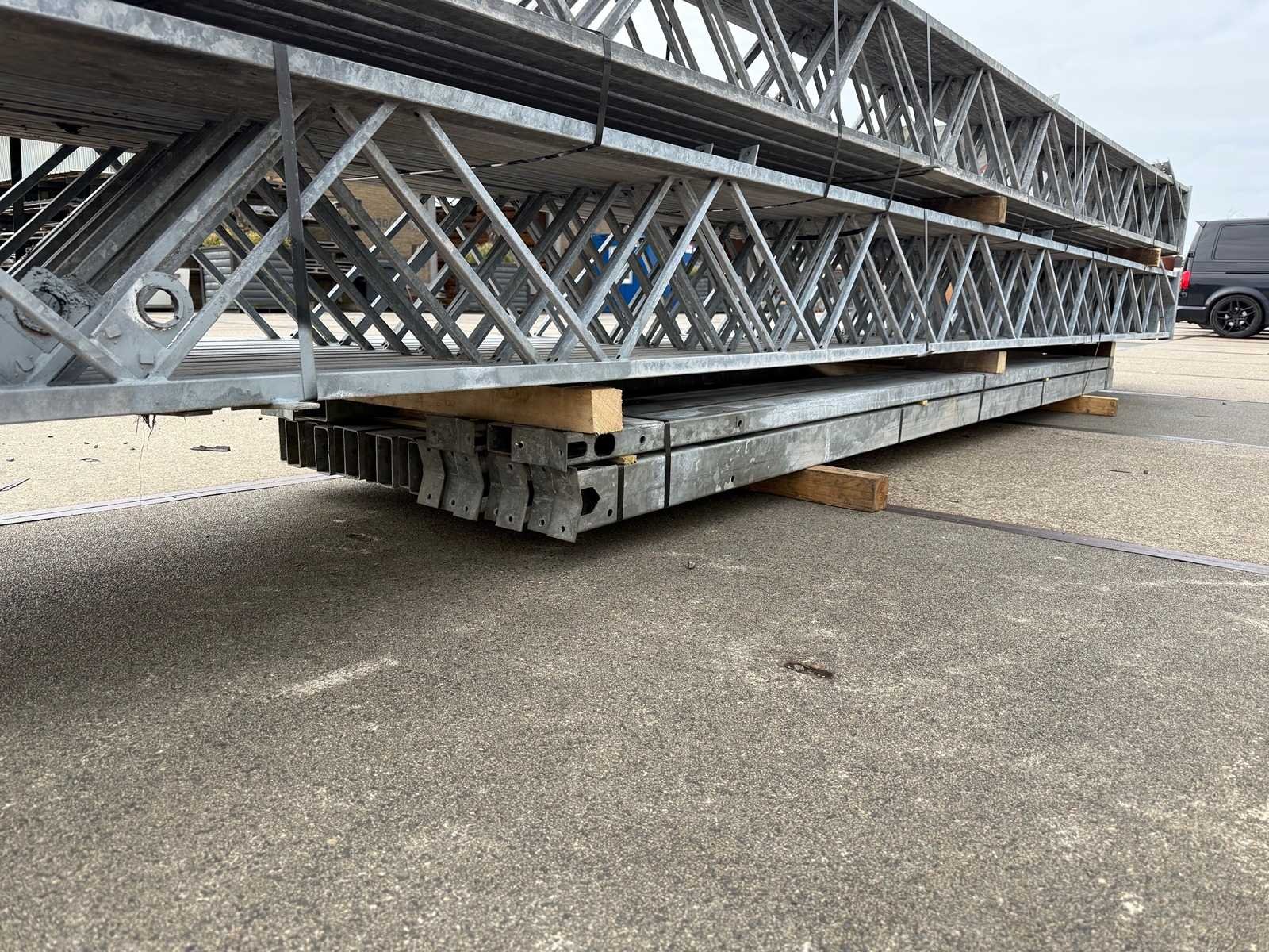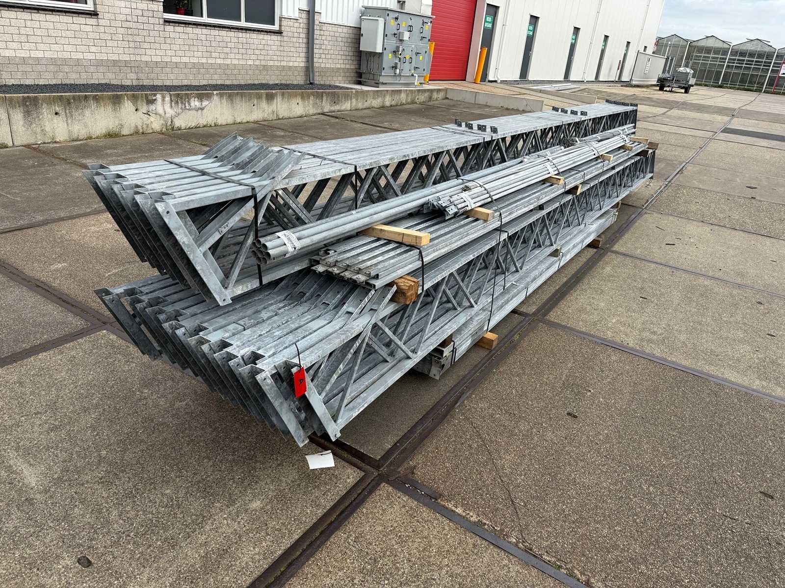 Overspanning trekstang tussen de spanten; spanten h.o.h. 4000mm; kokerprofiel als staanders en traliespanten; staaltekening; 3D-tekening; dakhelling 25 graden; 11 sets tussenspanten; voorzien van trekstangen met ophangstrips; windverbanden en kruisschoren; kavel ligt netjes transportklaar en dient met 1 trailer opgehaald te worden; kavel wordt gratis met een heftruck geladen Materiaal: Gegalvaniseerd staal Totaal oppervlakte: 512m² Nok hoogte: 6600mm Goot hoogte: 4100mm Totale afmeting L: 40000mm Totale afmeting Breedte: 12800mm