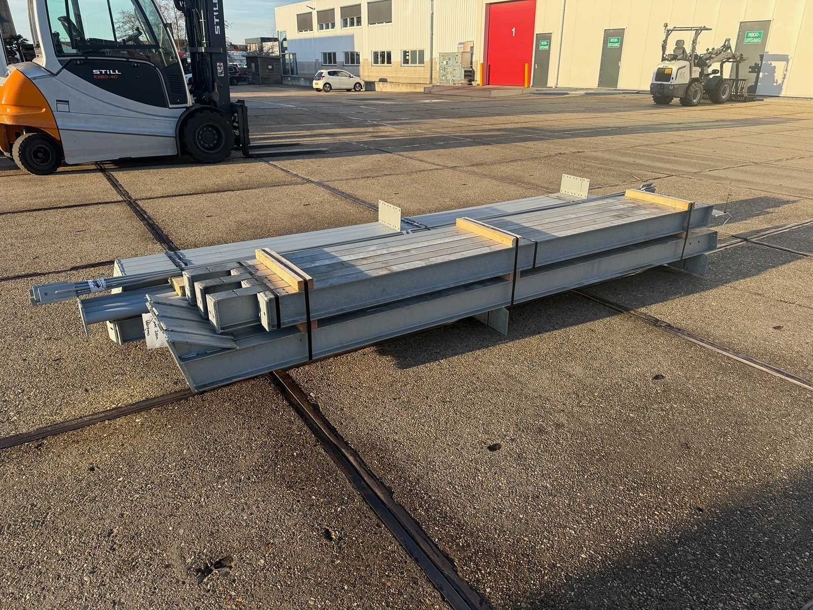 Vrije overspanning, spanten h.o.h. 4000mm, bestaande uit 3 sets tussenspanten IPE140, 2 sets eindspanten met windstijlen IPE120, voorzien van windverbanden, drukkokers, gordinglippen op de spanten, detailtekening tussenspanten, staalconstructie ligt netjes transportklaar en dient met 1 trailer opgehaald te worden, kavel wordt gratis geladen met een heftruck Materiaal: Thermisch verzinkt en geschilderd staal Totaal oppervlakte: 112m² Nok hoogte: 3900mm Goot hoogte: 3000mm Totale afmeting L: 16000mm Totale afmeting Breedte: 7000mm