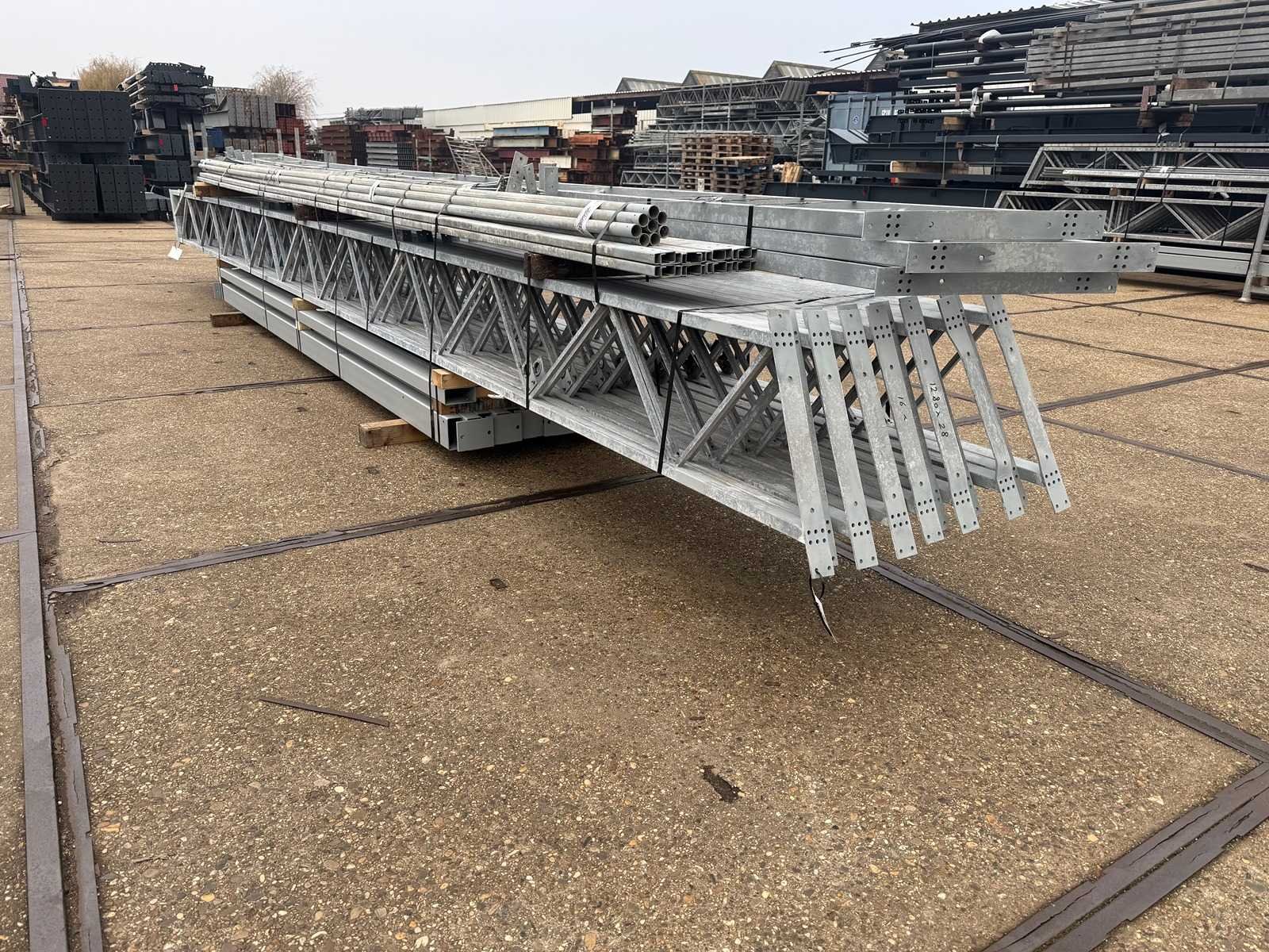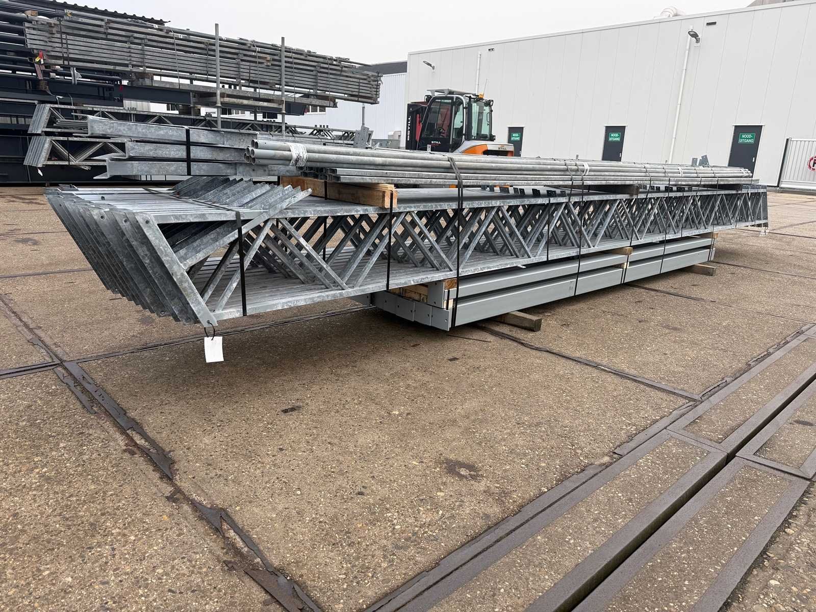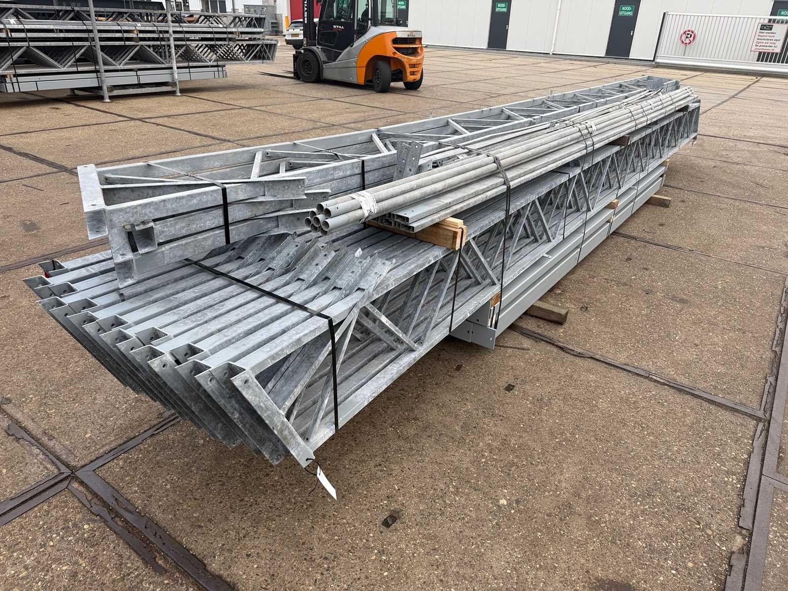 Overspanning trekstang tussen de spanten; spanten h.o.h. 4000mm; kokerprofiel als staanders en traliespanten; staaltekening; 3D-tekening; dakhelling 25 graden; 8 sets tussenspanten; voorzien van trekstangen met ophangstrips; windverbanden en kruisschoren; kavel ligt netjes transportklaar en dient met 1 trailer opgehaald te worden; kavel wordt gratis met een heftruck geladen Materiaal: Gegalvaniseerd en geschilderd staal Totaal oppervlakte: 358m² Nok hoogte: 6500mm Goot hoogte: 4000mm Totale afmeting L: 28000mm Totale afmeting Breedte: 12800mm