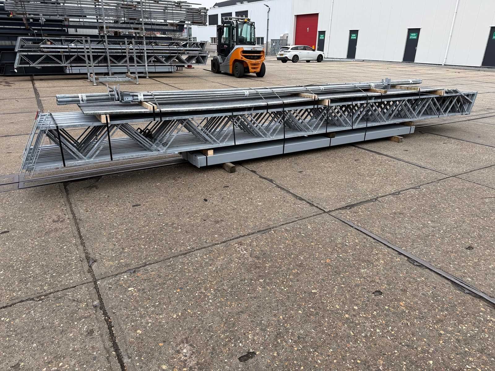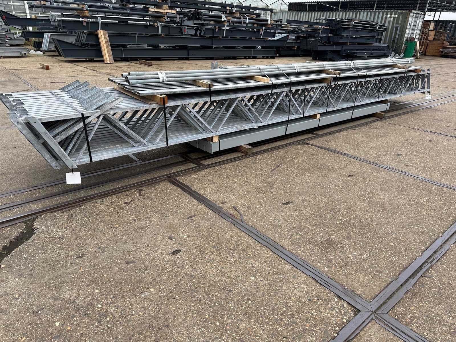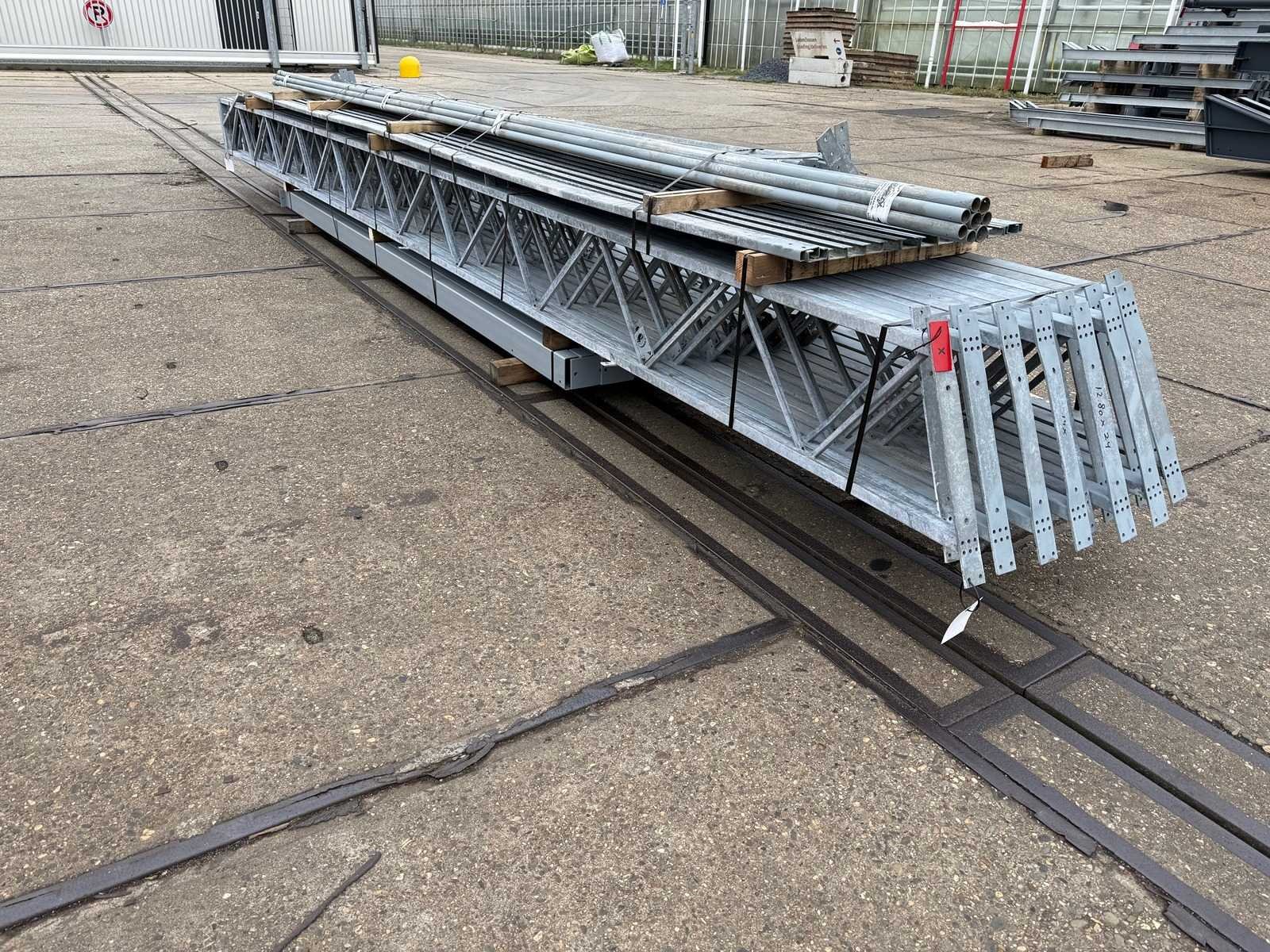 Overspanning trekstang tussen de spanten; spanten h.o.h. 4000mm; kokerprofiel als staanders en traliespanten; staaltekening; 3D-tekening; dakhelling 25 graden; 7 sets tussenspanten; voorzien van trekstangen met ophangstrips; windverbanden en kruisschoren; kavel ligt netjes transportklaar en dient met 1 trailer opgehaald te worden; kavel wordt gratis met een heftruck geladen Materiaal: Gegalvaniseerd en geschilderd staal Totaal oppervlakte: 307m² Nok hoogte: 6500mm Goot hoogte: 4000mm Totale afmeting L: 24000mm Totale afmeting Breedte: 12800mm
