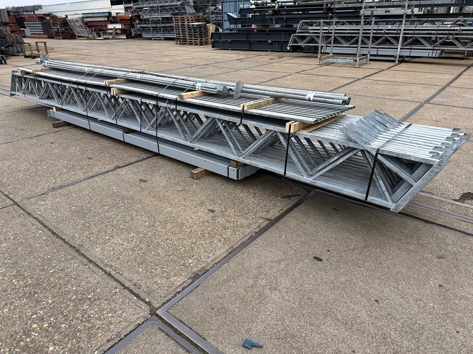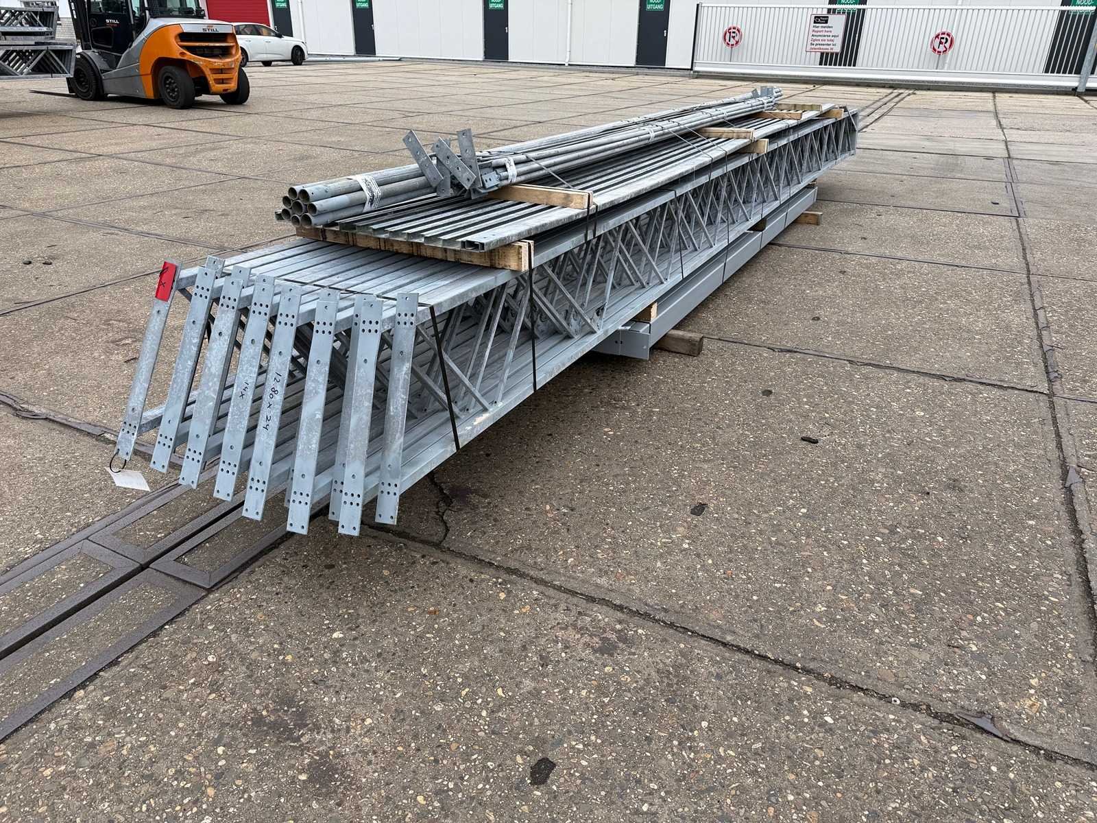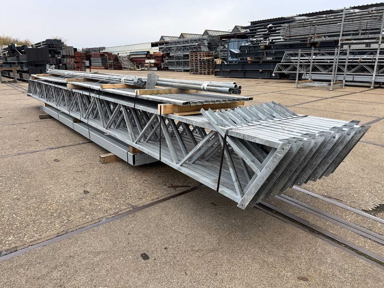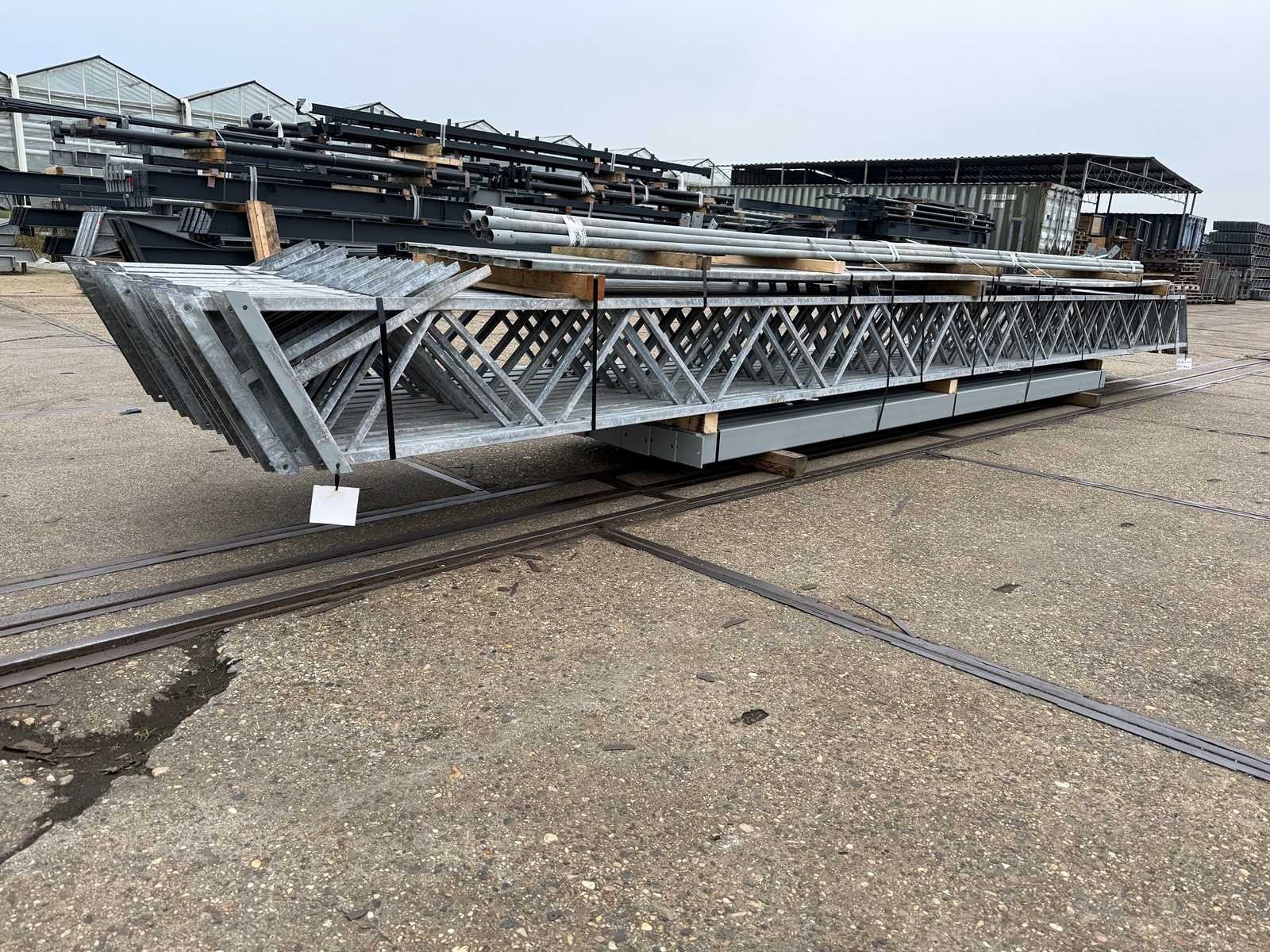 Overspanning trekstang tussen de spanten; spanten h.o.h. 4000mm; kokerprofiel als staanders en traliespanten; staaltekening; 3D-tekening; dakhelling 25 graden; 7 sets tussenspanten; voorzien van trekstangen met ophangstrips; windverbanden en kruisschoren; kavel ligt netjes transportklaar en dient met 1 trailer opgehaald te worden; kavel wordt gratis met een heftruck geladen Materiaal: Gegalvaniseerd en geschilderd staal Totaal oppervlakte: 307m² Nok hoogte: 6500mm Goot hoogte: 4000mm Totale afmeting L: 24000mm Totale afmeting Breedte: 12800mm