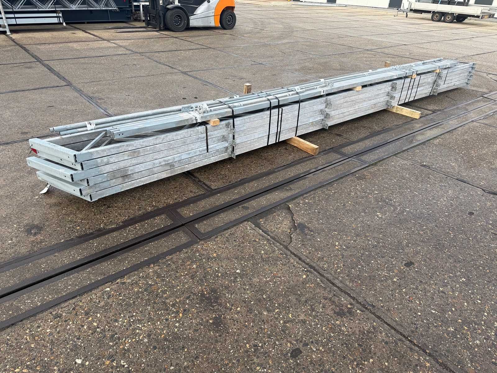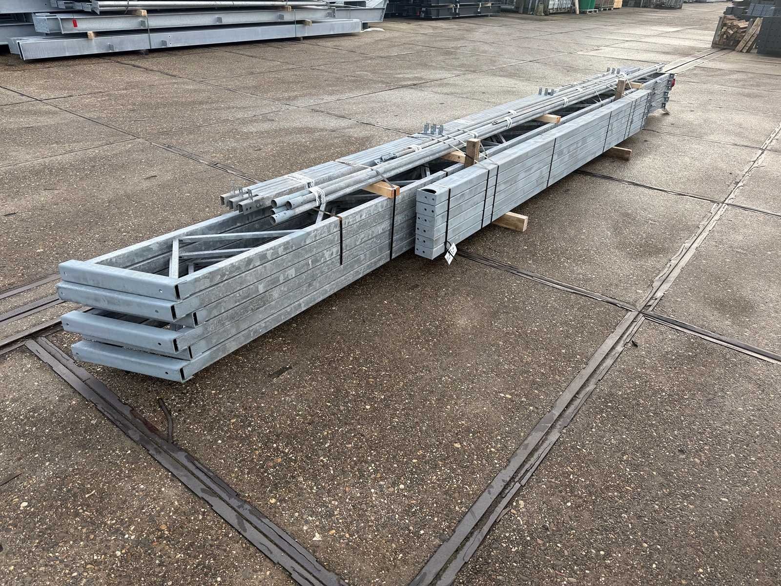 Overspanning trekstang tussen de spanten; spanten h.o.h. 4000mm; kokerprofiel als staanders en traliespanten; dakhelling 25 graden; 3 sets tussenspanten; voorzien van trekstangen met ophangstrips; windverbanden en kruisschoren; kavel ligt netjes transportklaar en dient met 1 trailer opgehaald te worden; kavel wordt gratis met een heftruck geladen Materiaal: Gegalvaniseerd staal Totaal oppervlakte: 102m² Nok hoogte: 6400mm Goot hoogte: 3900mm Totale afmeting L: 8000mm Totale afmeting Breedte: 12800mm