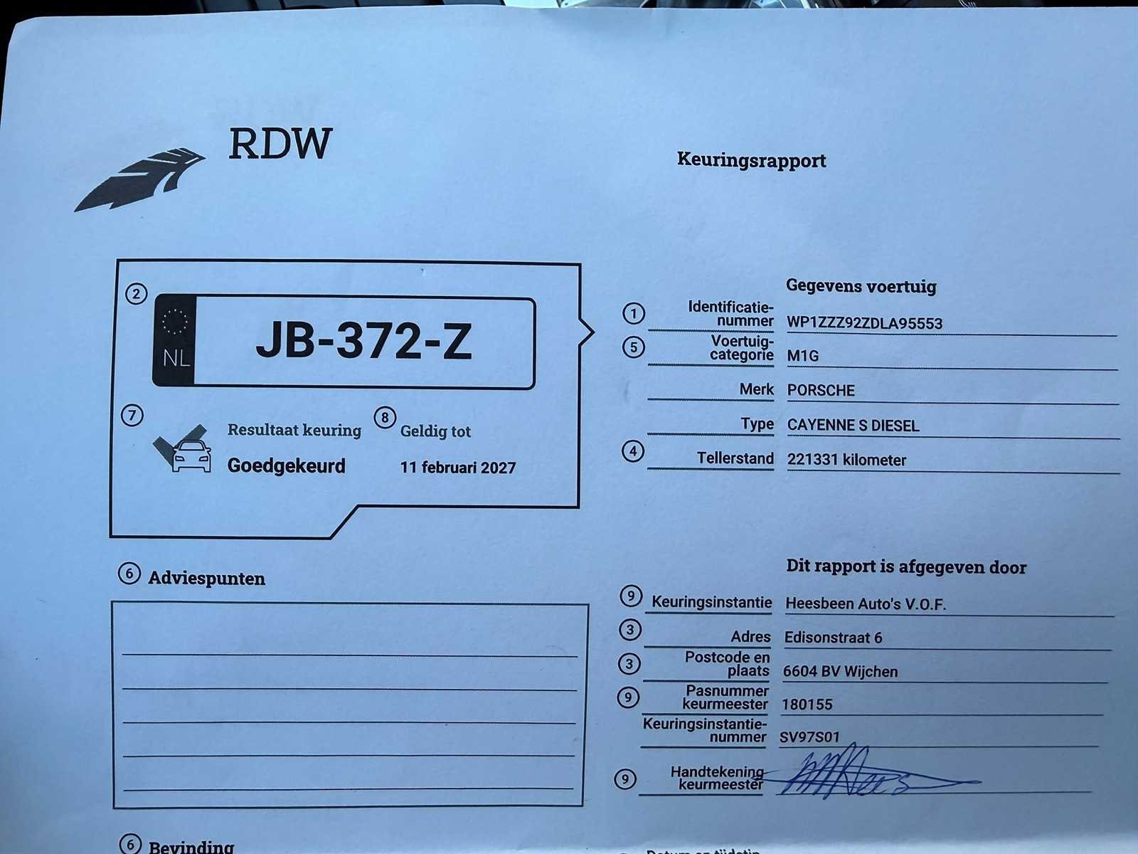 4.2 V8 diesel met 1000nm en 450pk in topstaat en motorisch en versnellingsbak 100% Met kloppende history. 3500kg trekhaak! - Comfort & Interieur Airco automatisch Armsteun voor Audio-navigatie full map Audio installatie premium met bose Autotelefoonvoorbereiding met Bluetooth Bandenspanningscontrolesysteem Binnen/buitenspiegel automatisch dimmend Boordcomputer Elektrische ramen achter Elektrische ramen voor Elektrisch verstelbare bestuurdersstoel met geheugen Lederen bekleding Lederen mulifunctioneel stuurwiel Schakelmogelijkheid aan stuurwiel ( Flippers ) Stuurbekrachtiging Verwarmde voorstoelen - Exterieur "Lichtmetalen velgen 21" Bi-xenon adaptief Buitenspiegels elektrisch verstelbaar Buitenspiegels verwarmbaar Centrale deurvergrendeling met afstandsbediening Key-less GO Dakrails Elektrisch bedienbare achterklep Elektrisch glazen panorama-dak Elektrisch glazen schuif-/kanteldak Halogeen mistlampen Luchtvering Metallic lak - Veiligheid Airbag(s) hoofd achter Airbag(s) hoofd voor Airbag(s) side voor Airbag bestuurder Airbag passagier Alarmsysteem klasse met voertuigvolg systeem Anti Blokkeer Systeem Cruise control Electronic Stability Program Extra getint glas Regensensor Start/stop systeem Startblokkering - Overig Automatische niveauregeling Sport Chrono pakket rode klokken Auto word nog gebruikt en zal na verwachten op 222500 km staan bij uitlevering Trekhaak ( 2 x per jaar gebruikt voor boot naar water en weer eruit.) Sportuitlaat 4 x met zware V8 roffel Dashcam Deze auto is in goede staat en word nog gebruikt, is vanaf 2018 zelfde eigenaar en is de laatste jaren weinig gebruikt. De auto is schadevrij en is enkel in 2023 aan de voorkant opnieuw gespoten wegens steenslag. Ook toe de koplampen en mistlampen vernieuwd wegens steenslag. Uitgevoerd bij Porsche Centrum Gelderland. Kenteken: JB-372-Z Merk: Porsche Model: Cayenne Turbo S Type: 4.2 D S Afgelezen kilometerstand: 221000km Cilinderinhoud: 4134cc Brandstof: Diesel Chassisnummer: xxxxxxxxxxxxxxx NAP status: Geen oordeel Datum eerste toelating: 2013-02-05 Datum eerste toelating (NL): 2016-02-12 APK vervaldatum: 2027-02-11 Aandrijving: 4x4 Aantal zitplaatsen: 5 Maximaal trekgewicht ongeremd: 3500kg Maximaal trekgewicht geremd: 750kg Kleur: zwart Transmissie: Aut8 Emissieklasse: 5 Aantal deuren: 4 Ledig gewicht: 2170kg Bruto BPM (NL): 19503€ Aantal cilinders: 8 Carrosserie: Stationwagen Nationaliteit documenten: NL Carfax Link: https://was.carfax.eu/v0/api/ccdid/5100016408/svc/201/vinreg/JB372Z/checksum/eyJhbGciOiJIUzI1NiIsInR5cCI6IkpXVCJ9.eyJleHAiOjE3NzUyOTg0MDN9.ZA-H9bYaz_SI1JFFZN8hG81DWGoR8bm3XrCJMzI1XpM Start en rijdt: ja zonder gebreken Keuringsrapport geldig tot: 11-2027 Airconditioning: true Navigatie: true Leder bekleed: true Luchtvering: true Vierwielaandrijving 4x4: true