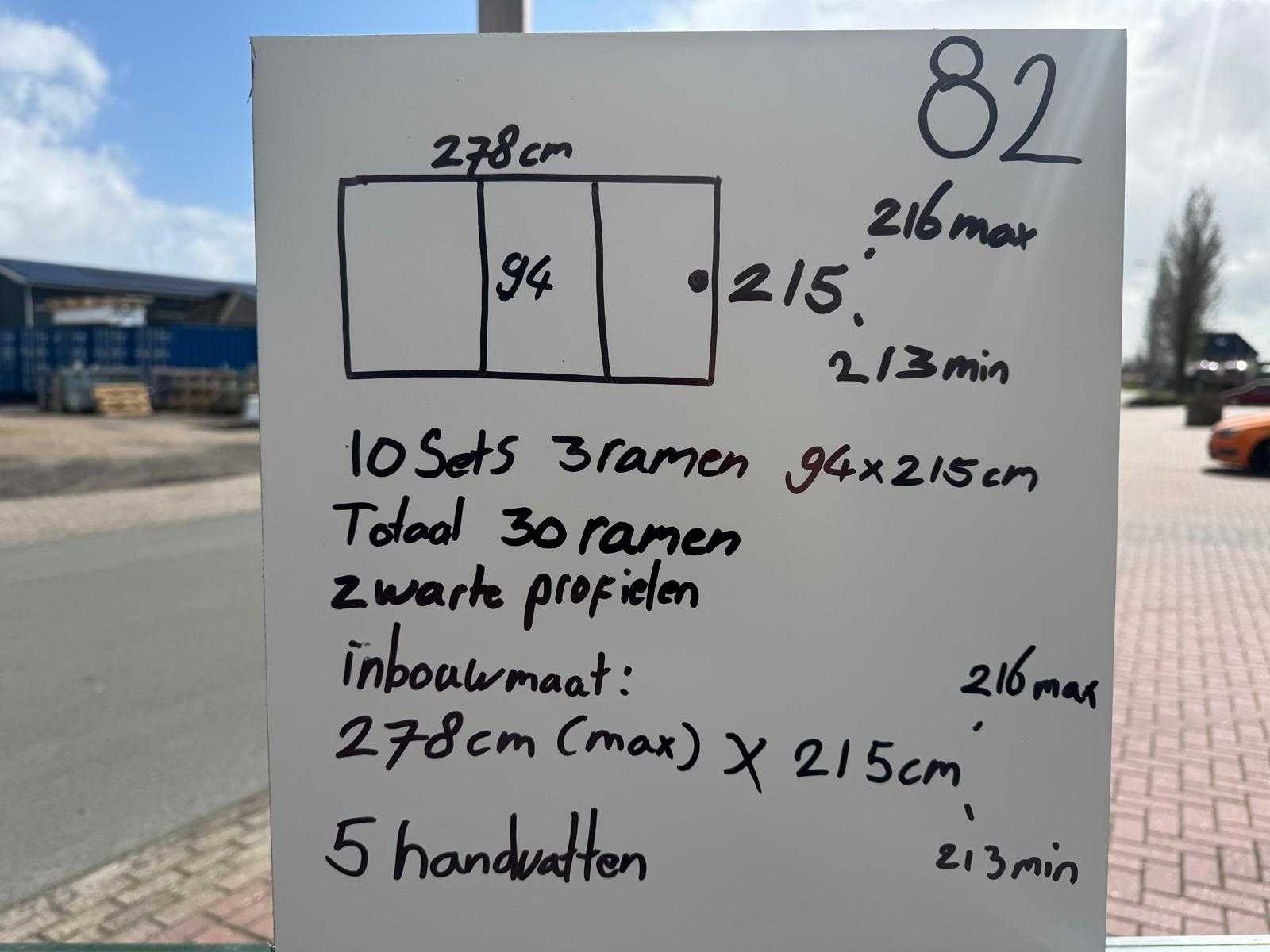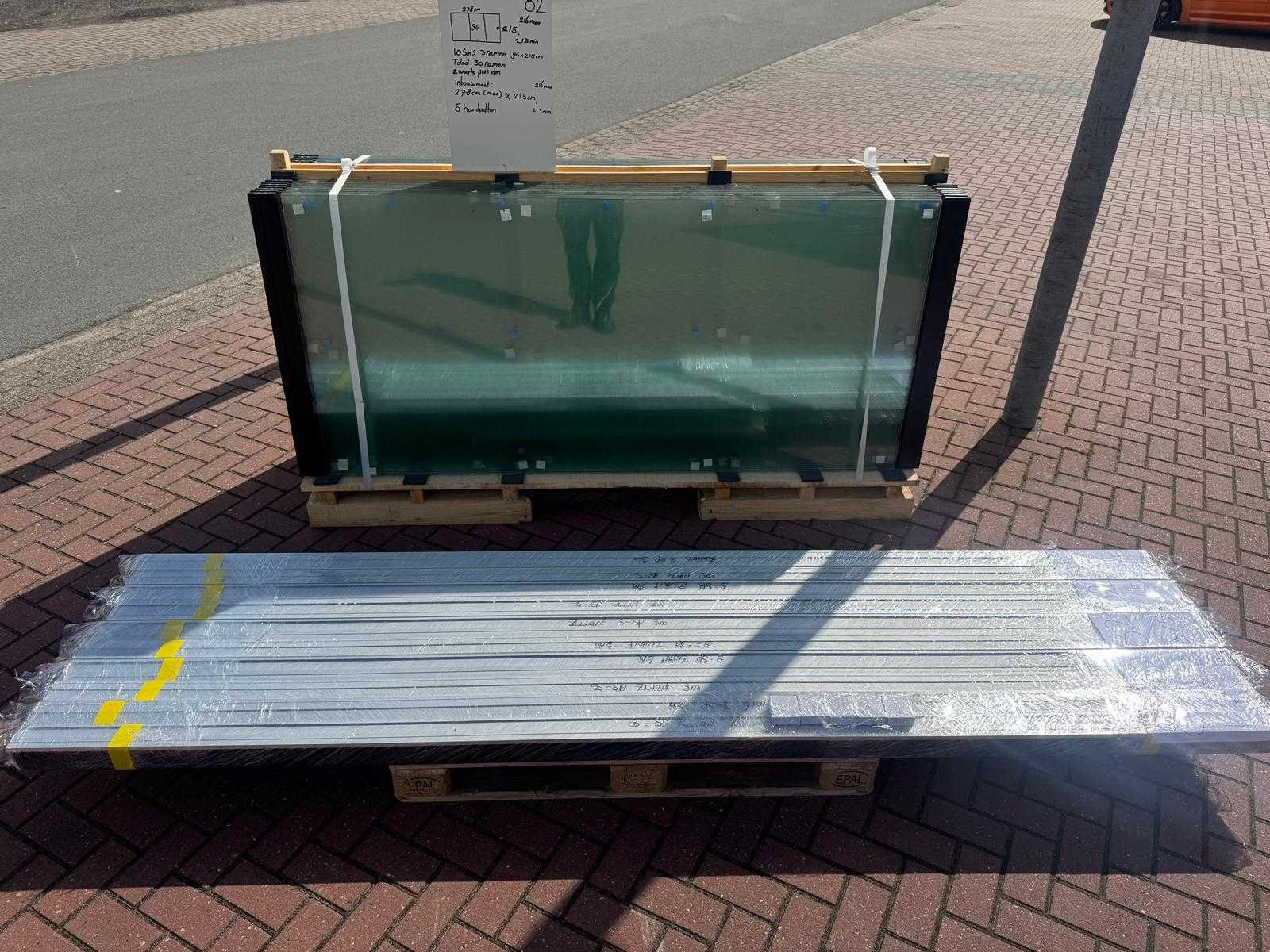 10 sets van 3 schuiframen – 94 cm x 215 cm, helder glas • Afmetingen per raam: breedte 94 cm, hoogte (dagmaat) 215 cm • Maximale breedte complete set: 278 cm • Totaal: 30 ramen (10 sets van 3 stuks) • Materiaal & kleur: zwart aluminium frame, helder glas • Inclusief: 10 boven- en 10 onder-rails met 3 sporen • 5 handgrepen • Conditie: partijhandel – kan lichte strepen of vegen bevatten • Verpakking: op pallet met glas • Opmerking: foto van overkapping is ter illustratie • Heftruck is aanwezig voor het afhalen