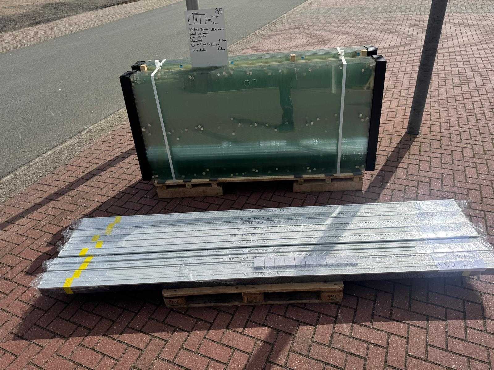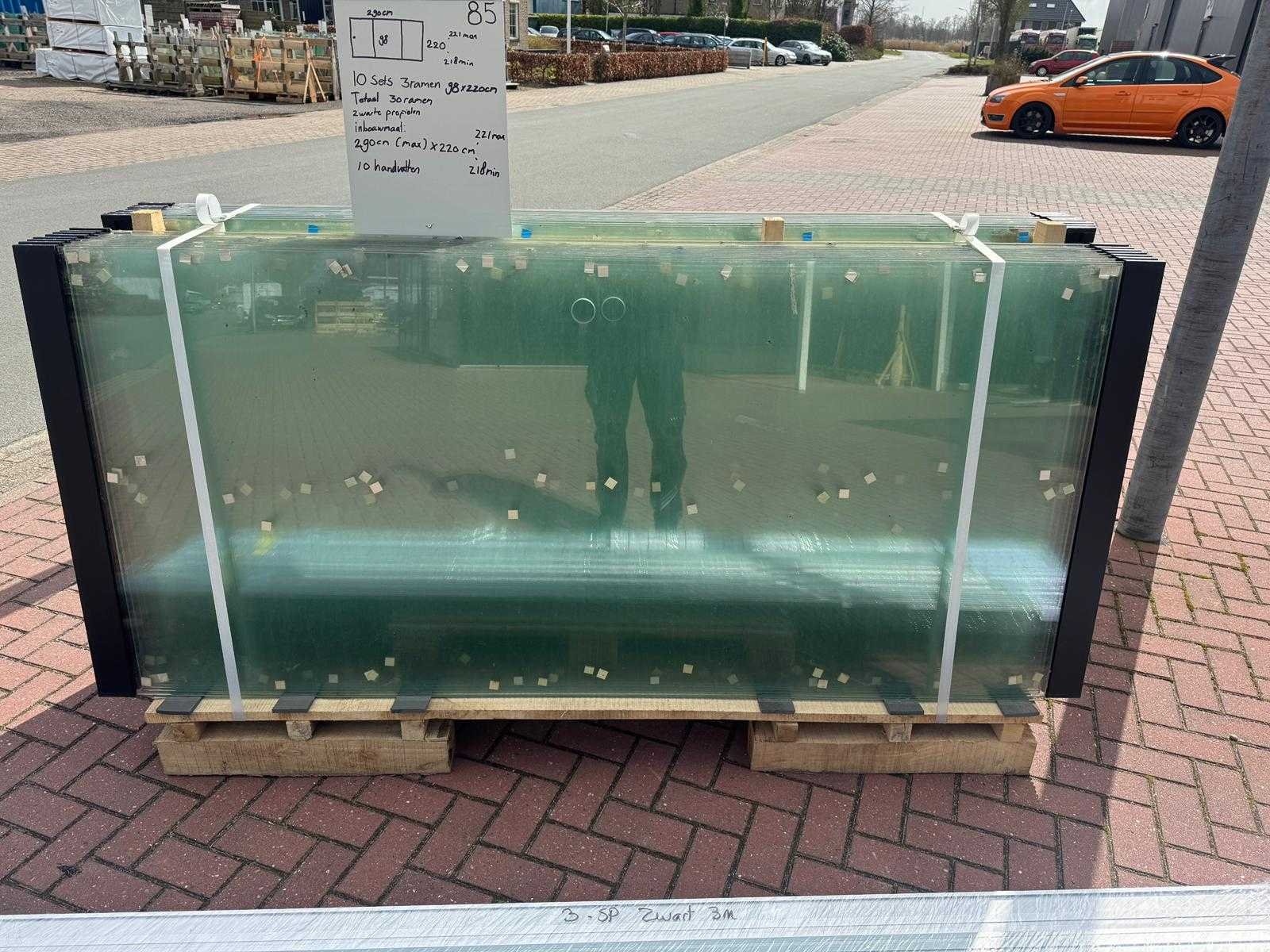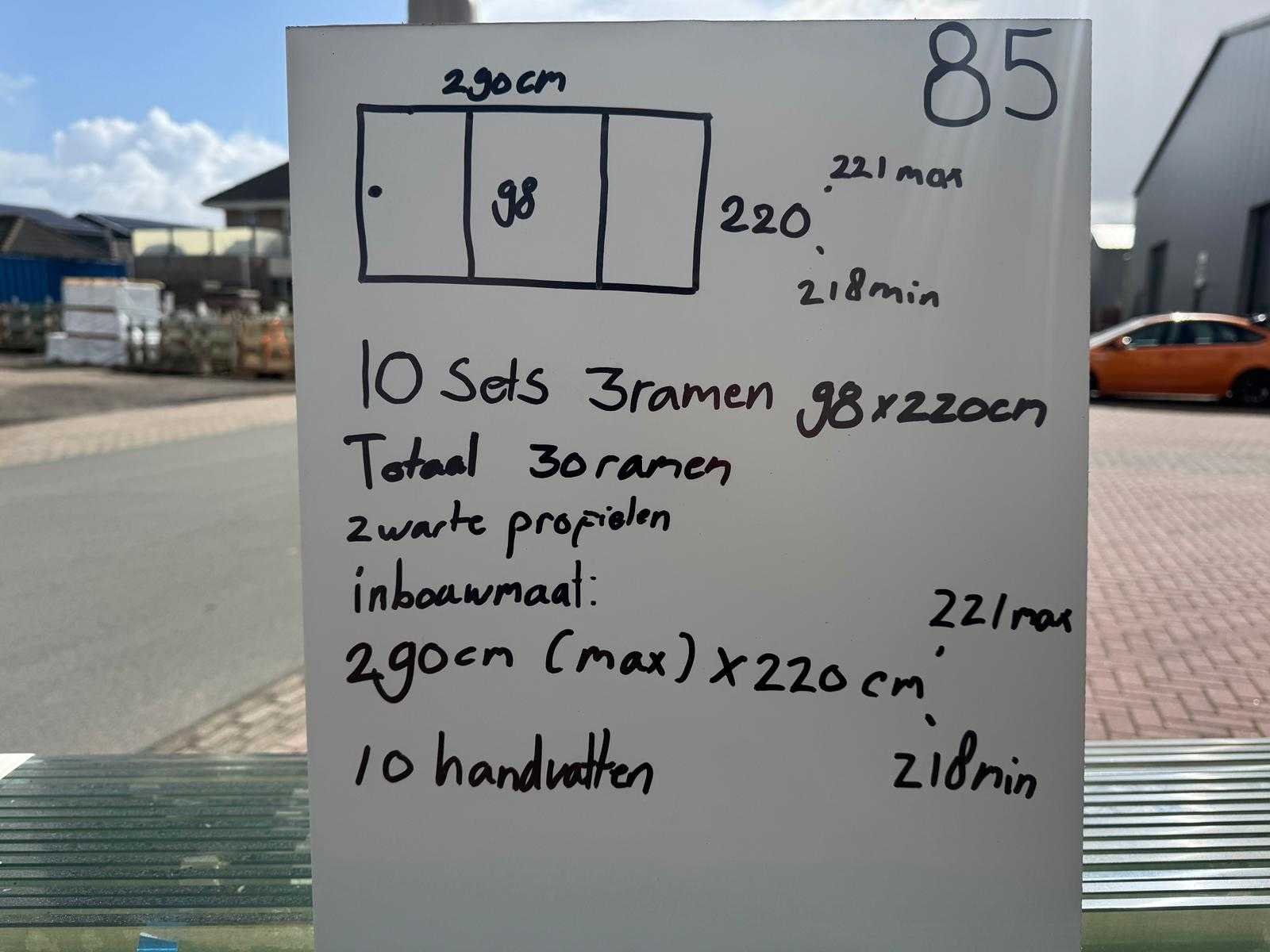 10 sets van 3 schuiframen – 98 cm x 220 cm, helder glas • Afmetingen per raam: breedte 98 cm, hoogte (dagmaat) 220 cm • Maximale breedte complete set: 290 cm • Totaal: 30 ramen (10 sets van 3 stuks) • Materiaal & kleur: zwart aluminium frame, helder glas • Inclusief: 10 boven- en 10 onder-rails met 3 sporen • 10 handgrepen • Conditie: partijhandel – kan lichte strepen of vegen bevatten • Verpakking: op pallet met glas • Opmerking: foto van overkapping is ter illustratie • Heftruck is aanwezig voor het afhalen