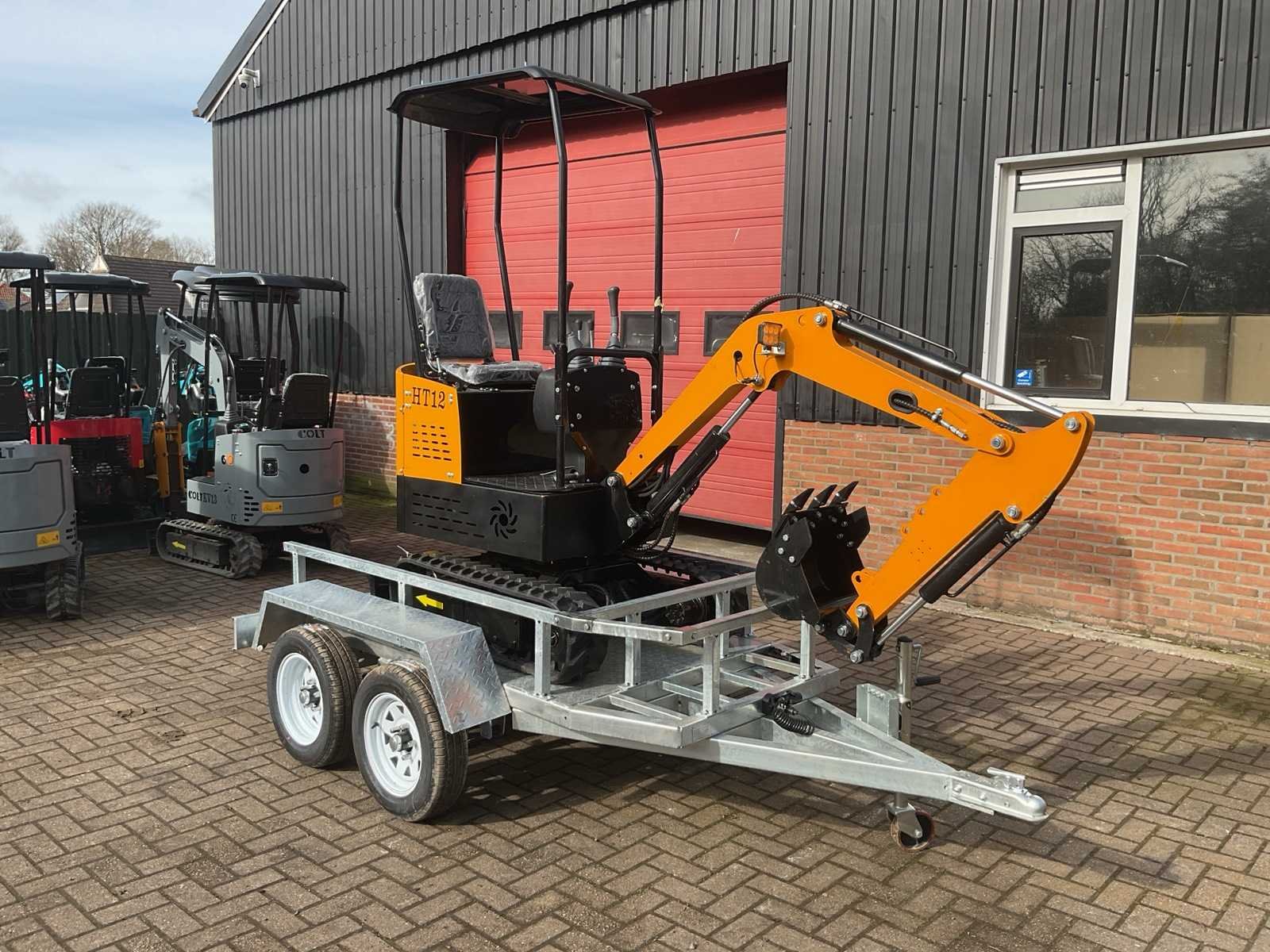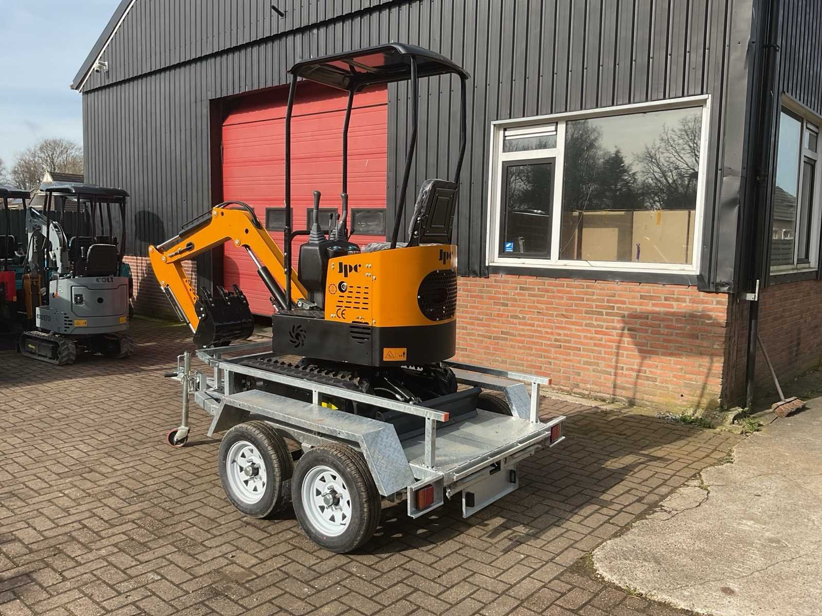 Voorzien van Brandstofmotor: Diesel; Motorvermogen: 12 PK; Motor: 1-cilinder Gewicht en afmetingen (machine); Bedrijfsgewicht: 1.020 kg; Lengte: 2.50 m; Breedte: 0.95 m; Hoogte: 2.20 m; Max. graafdiepte: 1.65 m; Bakbreedte: 300 mm Bakinhoud: ± 0.02 – 0.06 m³; Zwenkbereik: 360° continu; Rubber rupsen; Rupsbreedte: 180 mm; Aandrijving: hydraulisch rupsonderstel; Hulphydrauliek voor accessoires; Aansluiting voor hydraulische hamer; Dozerblad voor nivelleren; Joystick bediening; Werkverlichting; Elektrisch display; Trailer (bij set geleverd); Dubbelas machinetransporter; Oprijplaten; Transportafmetingen combinatie: ca. 3100 × 1700 × 3050 mm; Totaalgewicht combinatie: ca. 1.350 kg Merk: JPC Type: HT12 op trailer