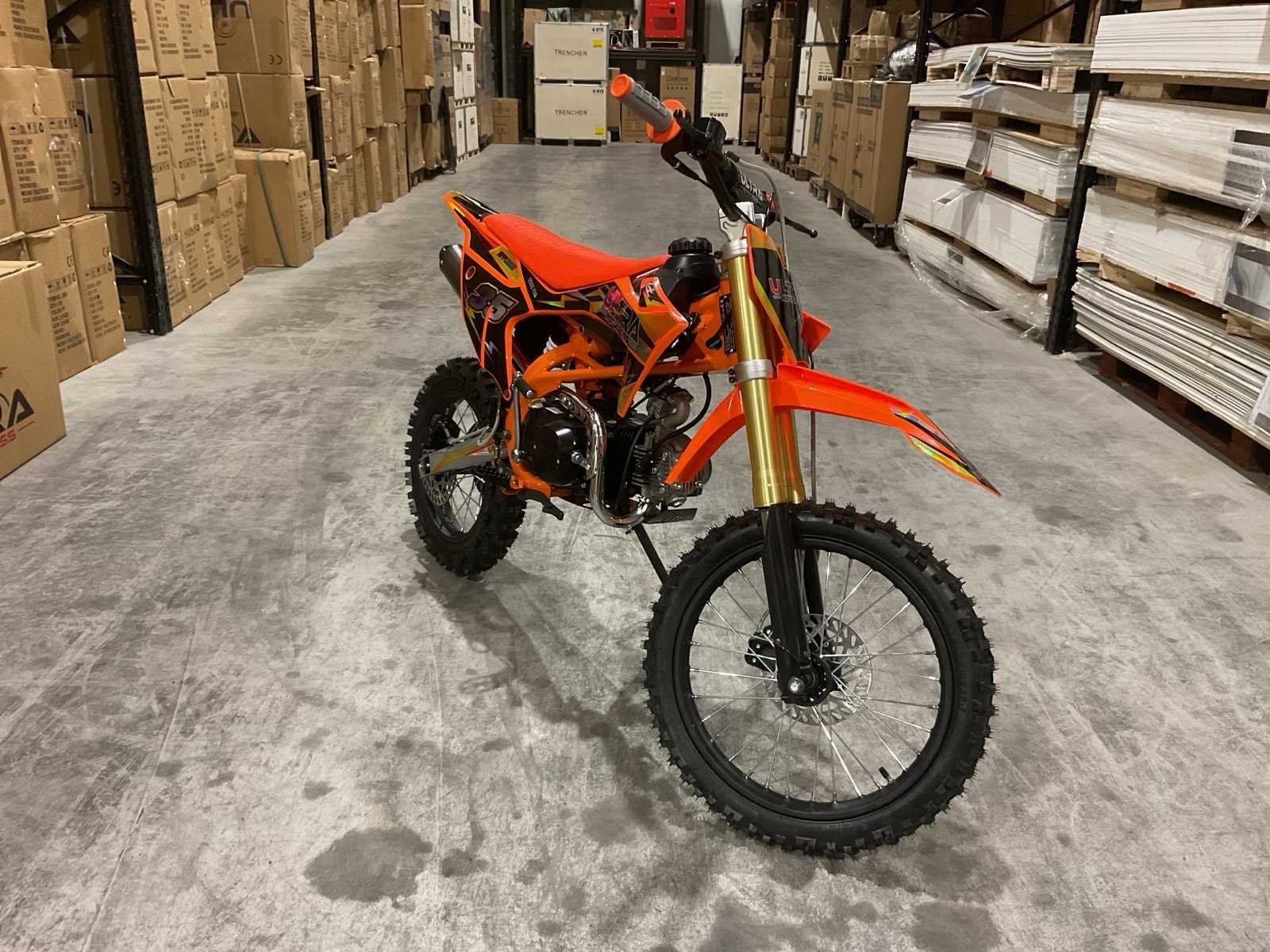 Voorzien van motor: 125 cc, 4-takt, 11 pk; Brandstof: benzine (4-takt); Transmissie: schakel; Remmen: hydraulische schijfremmen; Bandenmaat: voor 17" / achter 14"; Transportafmetingen (in doos): 135 × 45 × 65 cm; Transport gewicht: 78kg; ongebruikt in doos Merk: Ultra Motocross Model: DB003 26DE Type: 125cc Oranje Cilinderinhoud: 125cc