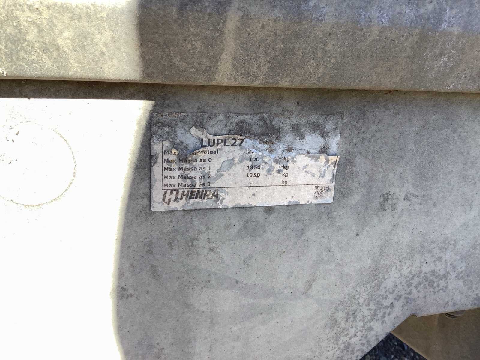 4x aluminium zijschot, houten laadvloer, 13-polige stekker, afdekdoek Merk: Henra Type: 27B Bouwjaar: 2021 Chassisnummer: XLUPL273518138844 Aantal assen: 2 Laadbak afmeting l: 355cm Laadbak afmeting b: 186cm Ledig gewicht: 588kg Laadvermogen: 2112kg Datum eerste toelating: 2021-06-03 Datum eerste toelating (NL): 2021-06-03 Kenteken: 51-WZ-KV Nationaliteit documenten: Nederland