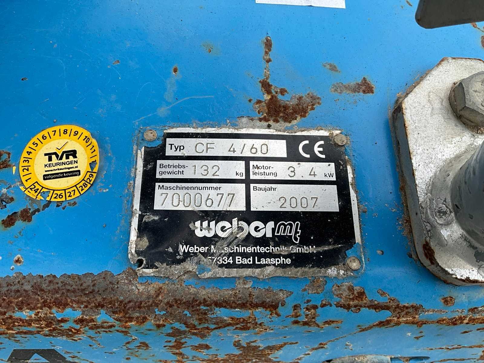 Hatz diesel motor, handstart Merk: Weber Type: CF4/60 Bouwjaar: 2007 Serienummer: 7000677 Bedrijfsgewicht: 132kg Grondplaat afm. l: 600mm Grondplaat afm. b: 600mm Merk motor: Hatz Motorvermogen (kW): 3kW Brandstof: Diesel Totale afmeting L: 700mm Totale afmeting Breedte: 600mm Totale afmeting Hoogte: 1100mm