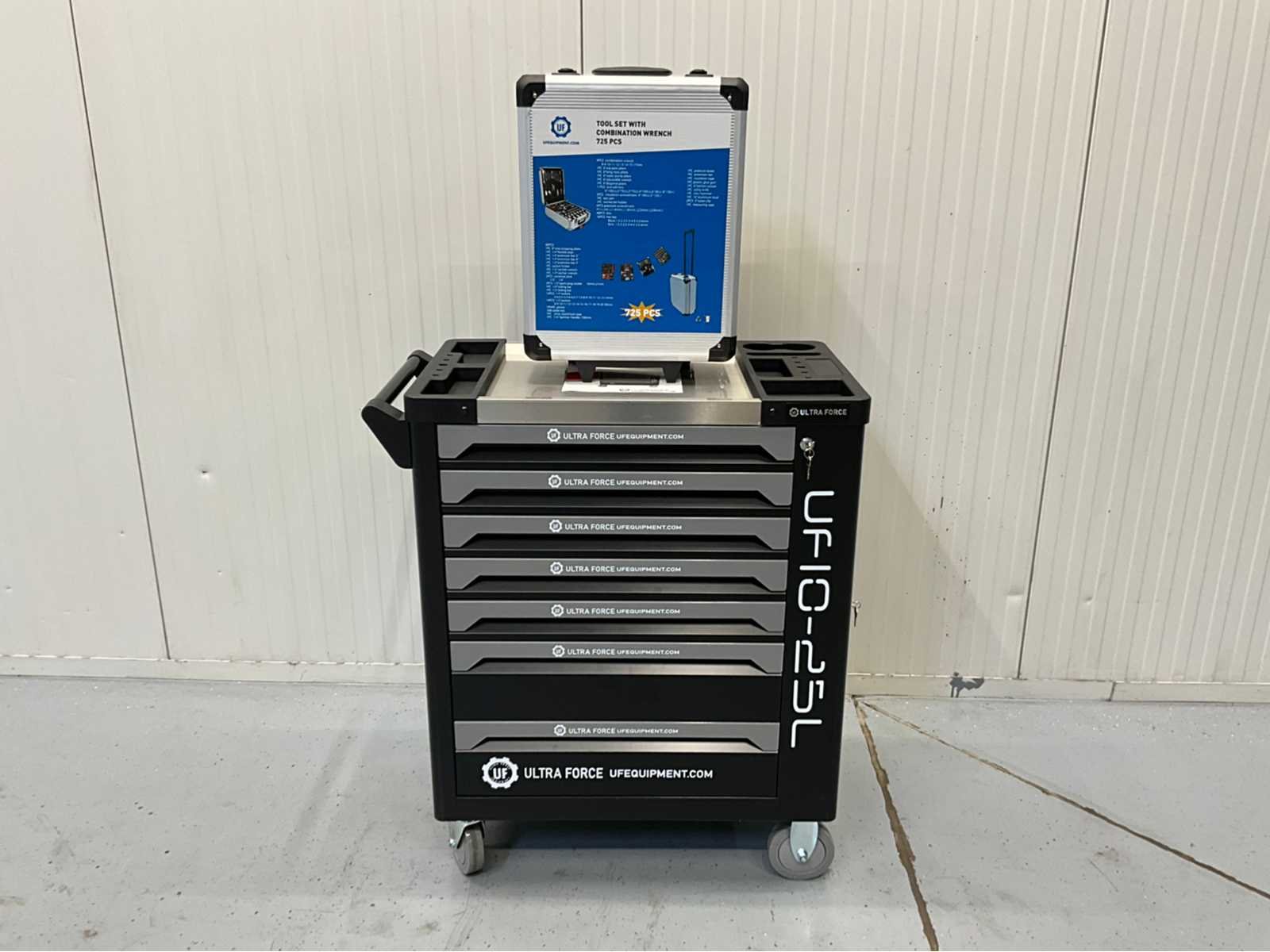 Professionele gereedschapswagen, 7 laden gevuld met 258 pcs gereedschap 2 zwenkwielen en 4 sleutels EN een Trolley incl. 725 stuks gereedschap en 2 sleutels Merk: Ultra Force Equipment Kleur: Zwart Gewicht: 78kg Lengte: 77cm Breedte: 50cm Hoogte: 84cm