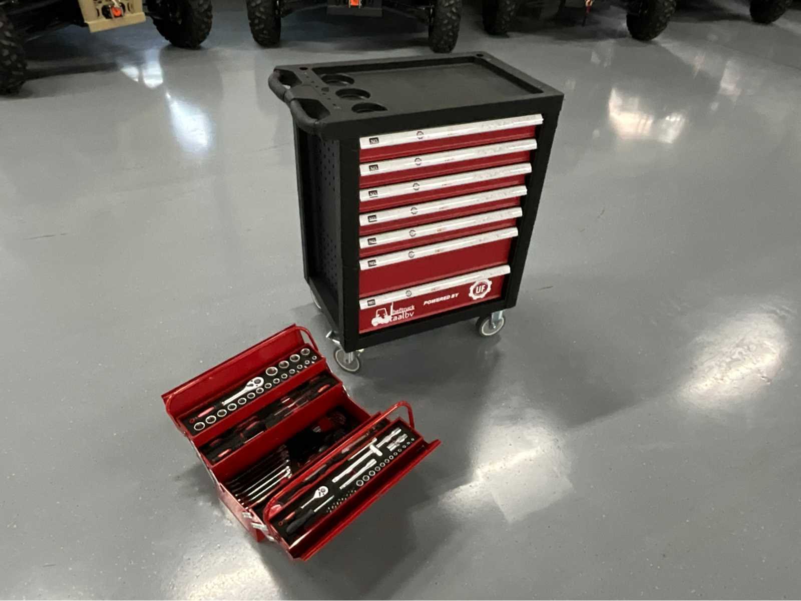 Gereedschapswagen EN gereedschapskoffer. Wagen met 7 laden waarvan 5 gevuld met gereedschap. En voor mee te nemen, robuuste gereedschapskoffer incl. 86 pcs gereedschap. Merk: Ultra Force Equipment Bouwjaar: 2026 Aantal laden: 7 Met inhoud: true Eigen gewicht: 61kg Totale afmeting L: 750mm Totale afmeting Breedte: 460mm Totale afmeting Hoogte: 960mm