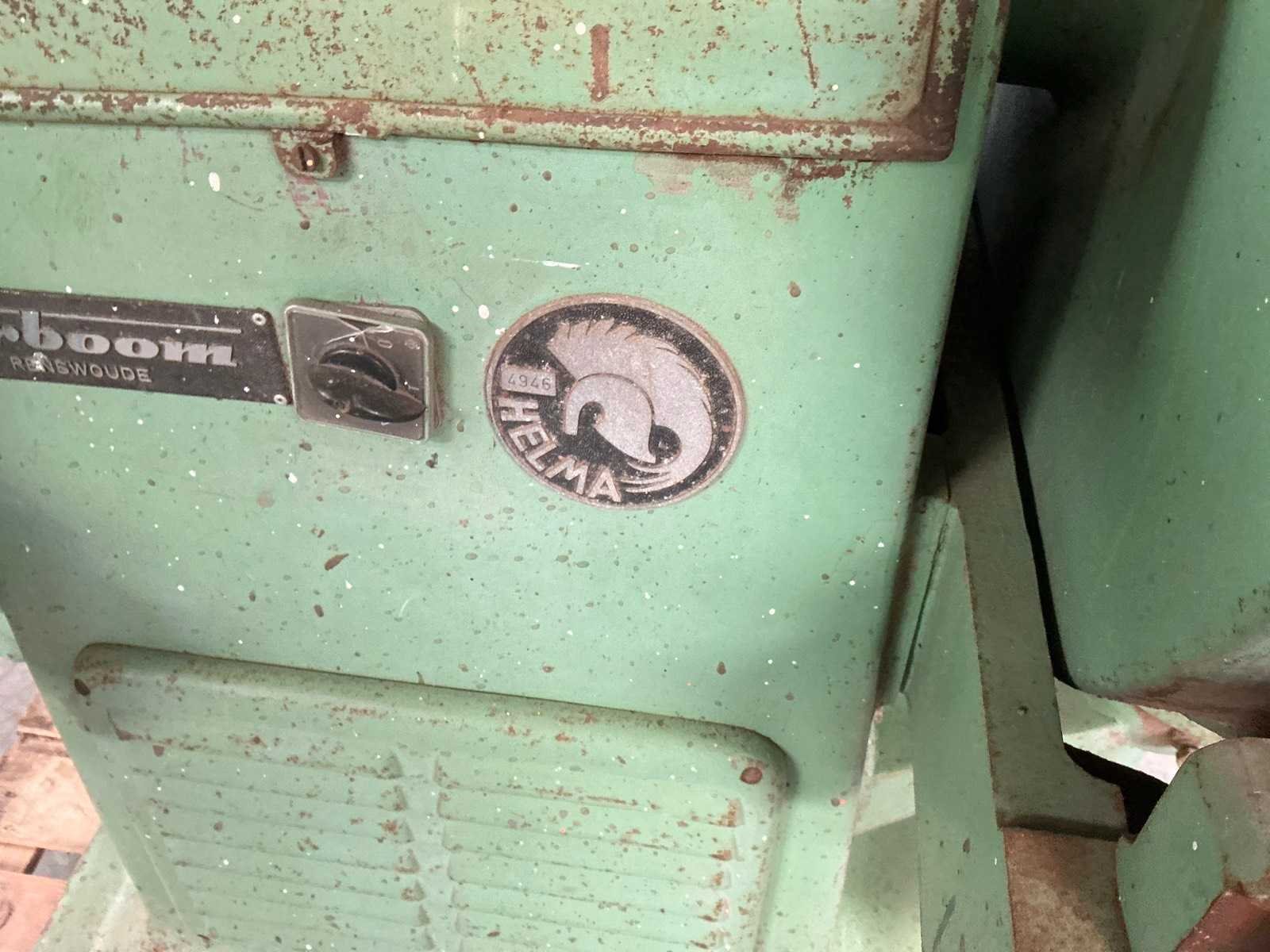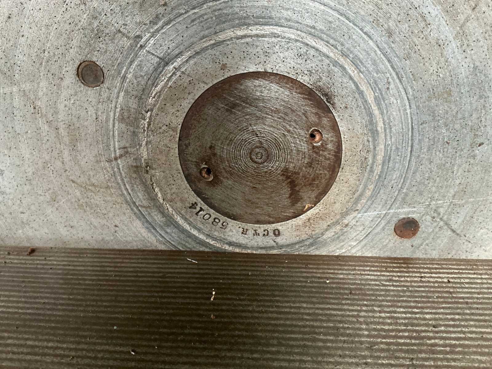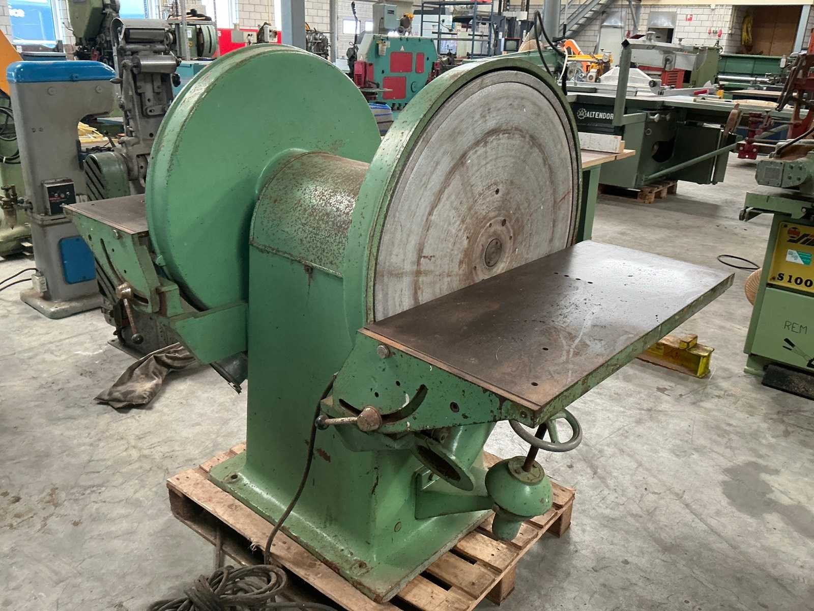 Hoekverstelbare tafel, schijfdiameter circa 790mm. Merk: Helma verboom Aansluiting: 490V Afmeting l: 16mm Afmeting b: 950mm Afmeting h: 1450mm