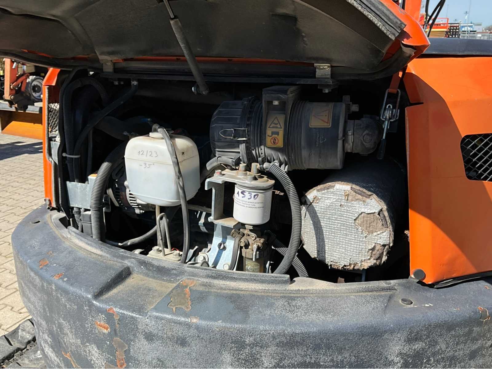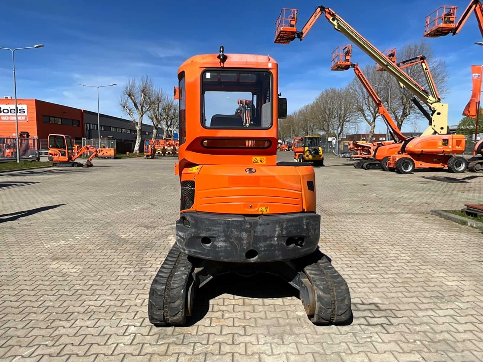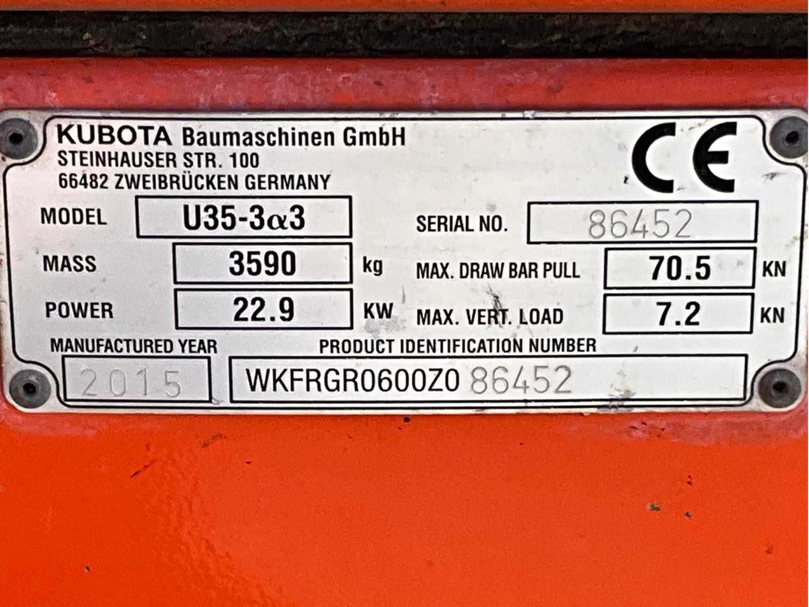 Gesloten cabine; knikarm; extra hydraulische aansluitingen; snelwissel; dozerblad breedte 1700 mm; kantelbak afmeting 1200x350x300 mm; working condition; Merk: Kubota Type: U35-3A3 Bouwjaar: 2015 Serienummer: WKFRGR0600Z086452 Merk motor: Kubota Motorvermogen (kW): 22.9kW Aantal cilinders: 4 Brandstof: diesel Max. werkbereik: 5400mm Max. graafdiepte: 3350mm Rups breedte: 300mm Afgelezen urenstand: 1747 Eigen gewicht: 3700kg Totale afmeting L: 4900mm Totale afmeting Breedte: 1700mm Totale afmeting Hoogte: 2500mm