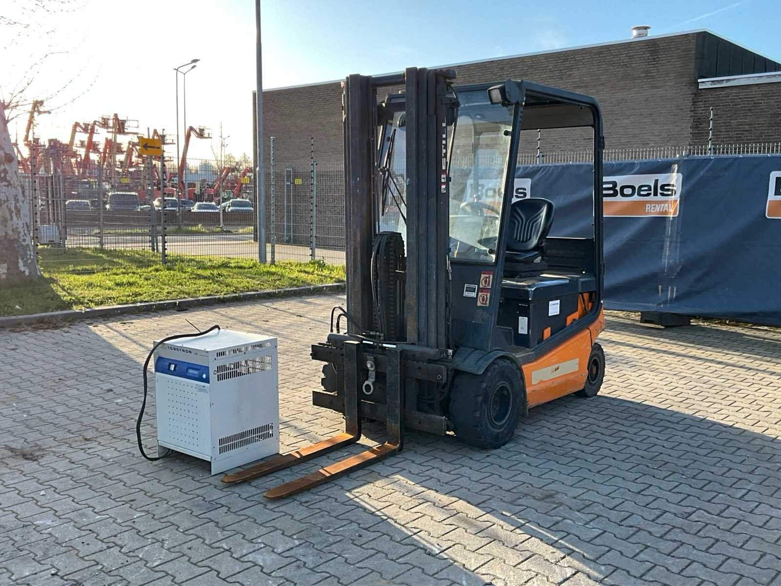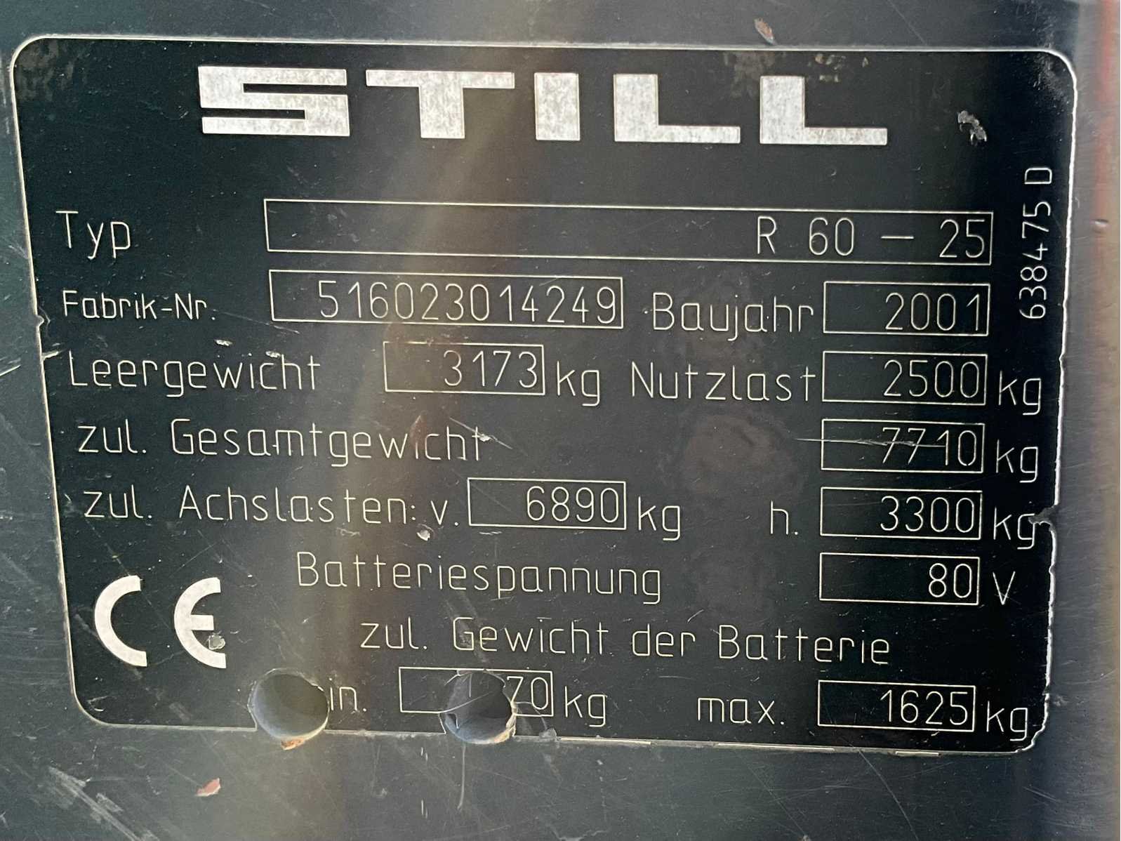 FEM2; working condition; Merk: Still Type: R60-25 Bouwjaar: 2008 Serienummer: 516043000291 Brandstof: Elektrisch Mast: Triple Soort band: Volrubber banden Aantal wielen: 4 Afgelezen urenstand: 9463 Accu lader: true Free-lift: true Side-shift: true Eigen gewicht: 4900kg Hefvermogen: 2450kg Lepellengte: 1000mm Max. hefhoogte: 5000mm Vol rubber banden: true Minimale doorrijhoogte: 2200mm Totale afmeting L: 3500mm Totale afmeting Breedte: 1250mm Totale afmeting Hoogte: 2200mm