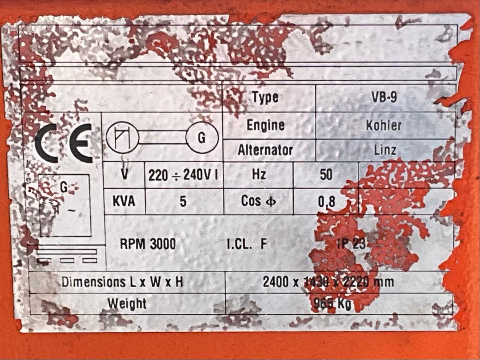 Lengte 2400 mm; breedte 1450 mm; hoogte 2400 mm; Kohler diesel motor; Linz alternator; 4x240 Watt LED lamp; 230 Volt aansluiting; 5 kVA; ingebouwde brandstoftank; hydraulische mast; maximale masthoogte circa 8 meter; afgelezen urenstand 2227 uur; lichtsensor; heftruck vorksleuven; 4x stelvoet; hijsoog; working condition; (de koper dient bij transport over de weg zelf te voorzien in een geldig kenteken; een 7 of 9 polige aansluitstekker of verloopstuk met kabel (verlengsnoer kan ter plaatse tegen betaling aangekocht worden); eventueel extra lichtbalk); Belgische kentekenpapieren; gelijkvormigheidsattest; (Q-ABN-535) Merk: TowerLight Type: VB-9 LED Bouwjaar: 2015 Chassisnummer: ZNEVB9D0015000528 + 1503208 Aantal assen: 1 Ledig gewicht: 1100kg