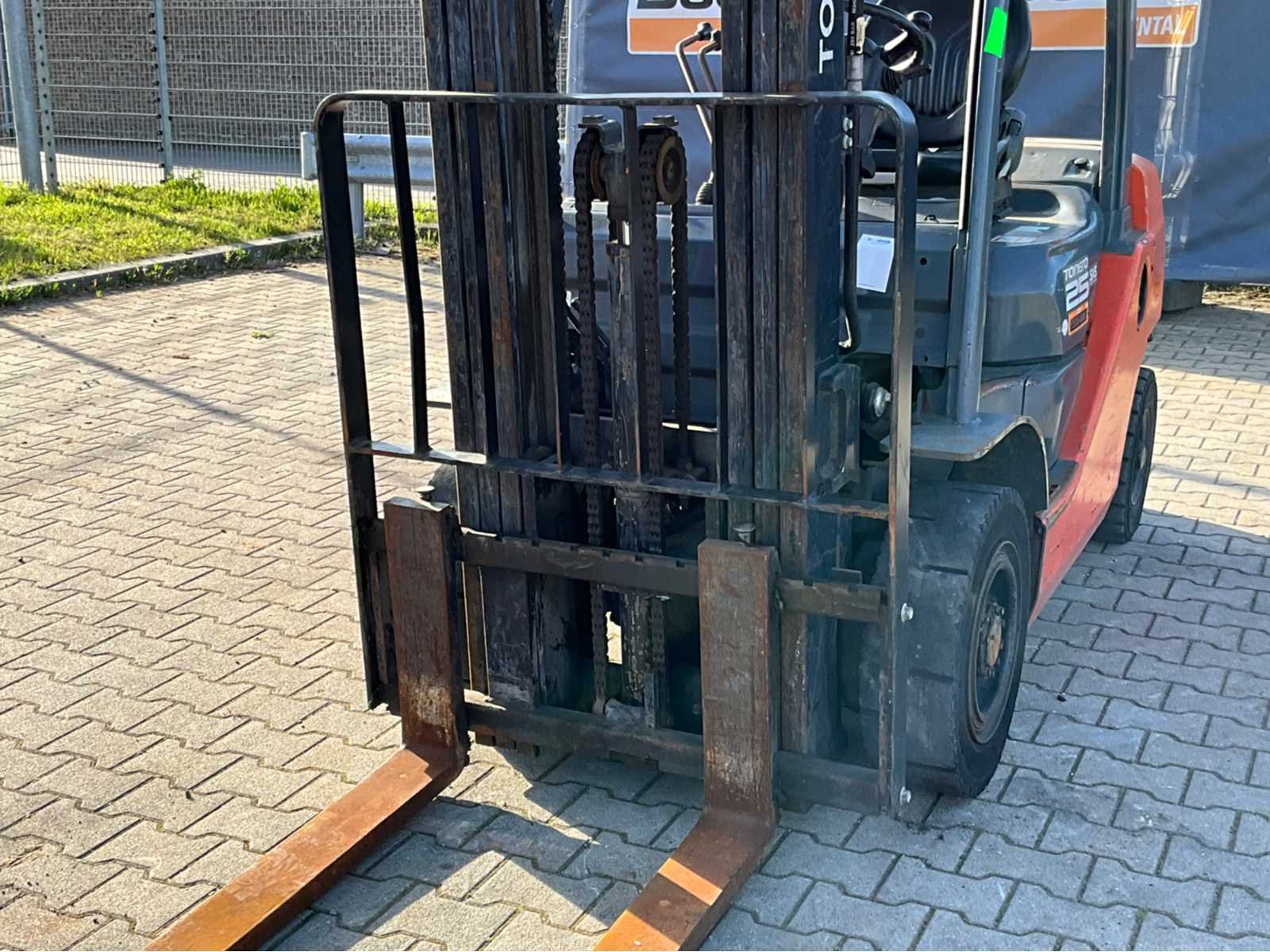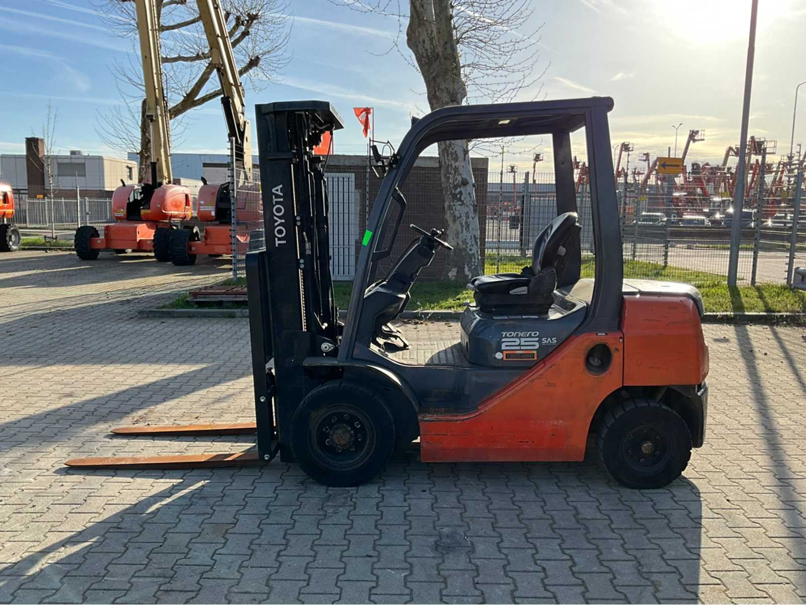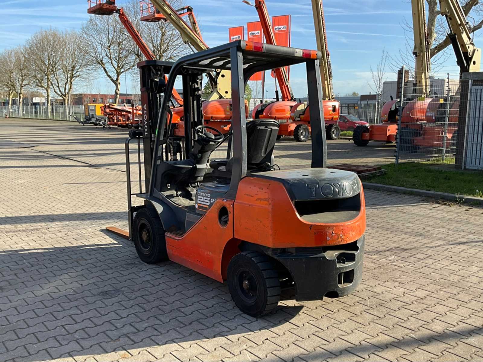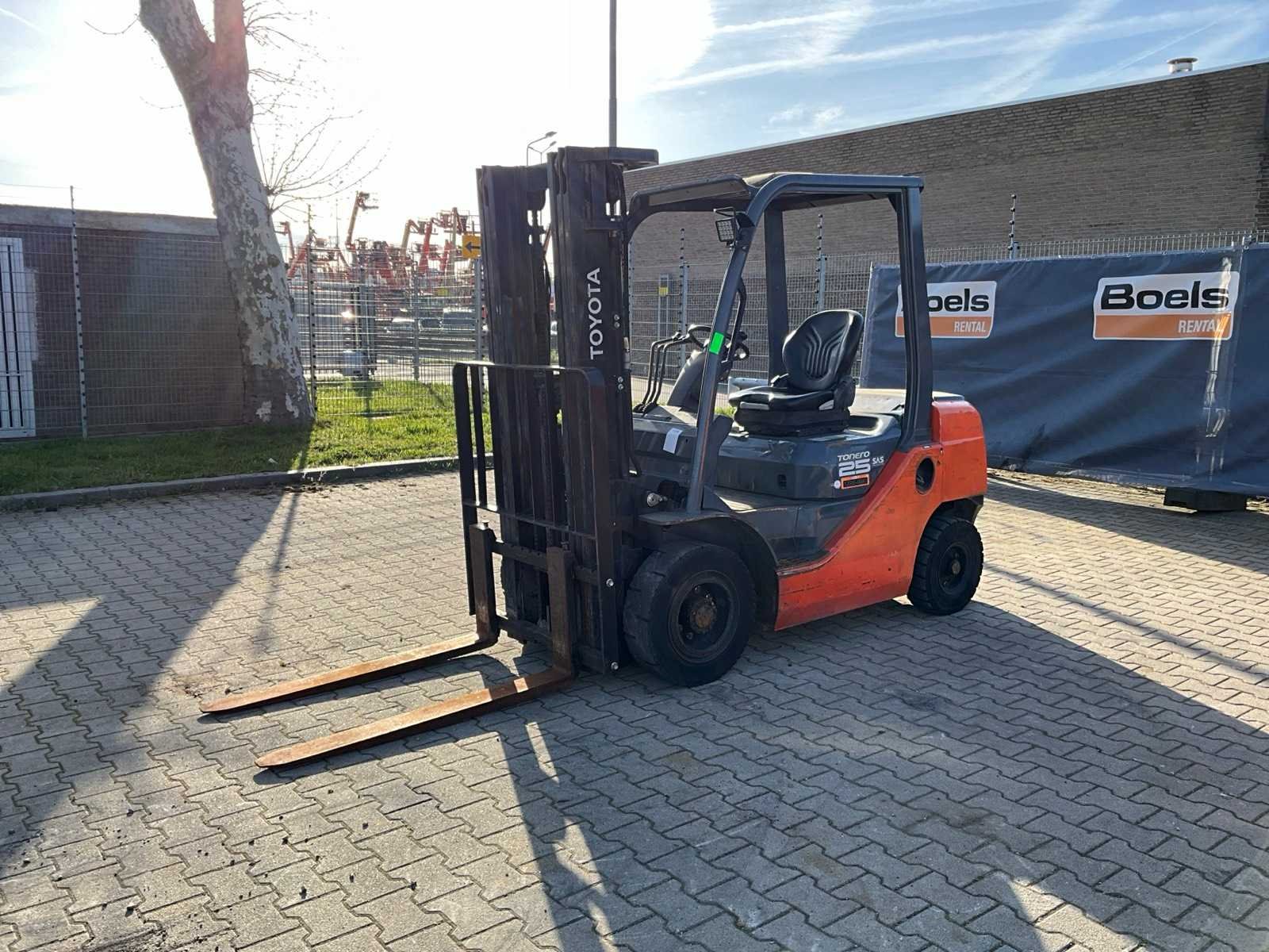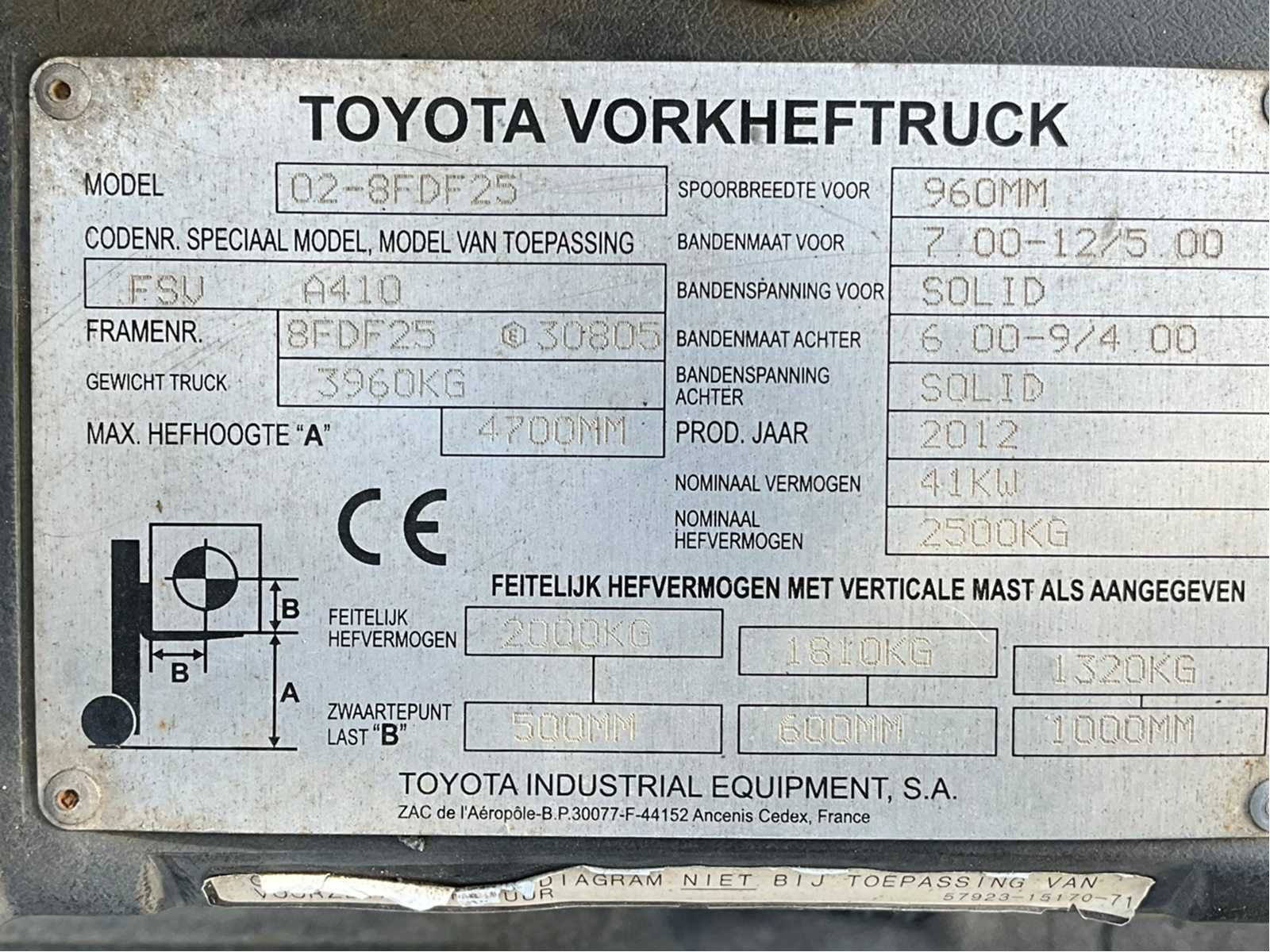 Open cabine; werkverlichting; vorkbreedte 120 mm; working condition; Merk: Toyota Type: 02-8FDF25 Bouwjaar: 2012 Serienummer: 8FDF2530805 Brandstof: Diesel Mast: Triple Soort band: Volrubber banden Aantal wielen: 4 Afgelezen urenstand: 3328 Free-lift: true Triple mast: true Eigen gewicht: 4000kg Hefvermogen: 2500kg Lepellengte: 1200mm Max. hefhoogte: 4700mm Vol rubber banden: true Minimale doorrijhoogte: 2150mm Totale afmeting L: 3950mm Totale afmeting Breedte: 1200mm Totale afmeting Hoogte: 2150mm Diesel: true