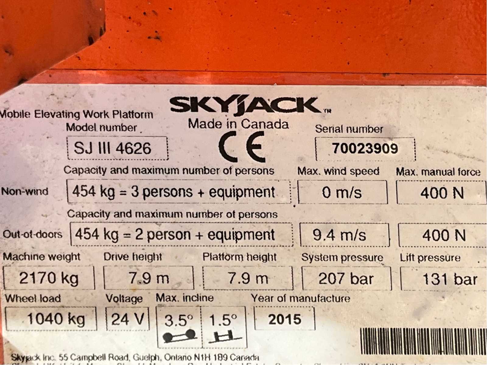 Platform vloerhoogte 7900 mm; uitschuifbaar platform afmeting circa 3150x1070 mm; interne acculader 230 Volt; kooibediening; 230 Volt stroom aansluiting platform; transporthoogte circa 1950 mm; working condition; Merk: SkyJack Type: SJ III 4626 Bouwjaar: 2015 Serienummer: 70023909 Elektrisch: true Schaarhoogwerker: true Werkhoogte: 9750mm Plateau afm. l: 2100mm Plateau afm. b: 1070mm Platform capaciteit: 454kg Accu lader: true Afgelezen urenstand: 191 Eigen gewicht: 2170kg Totale afmeting L: 2330mm Totale afmeting Breedte: 1170mm Totale afmeting Hoogte: 2260mm
