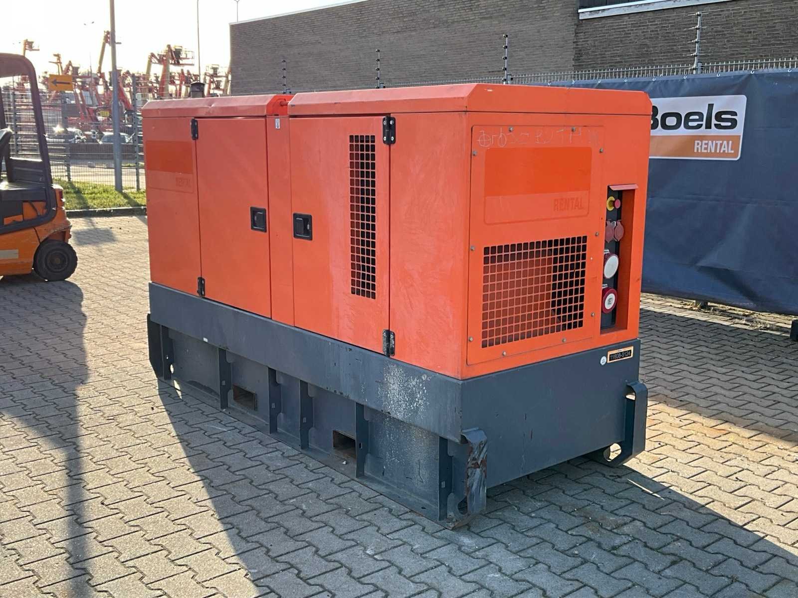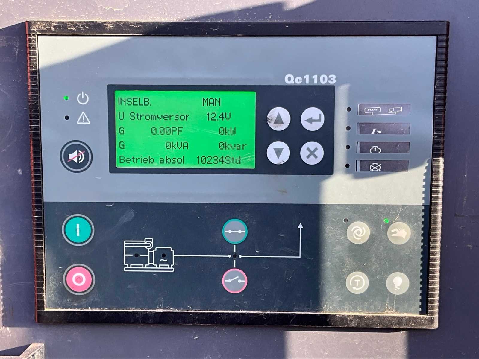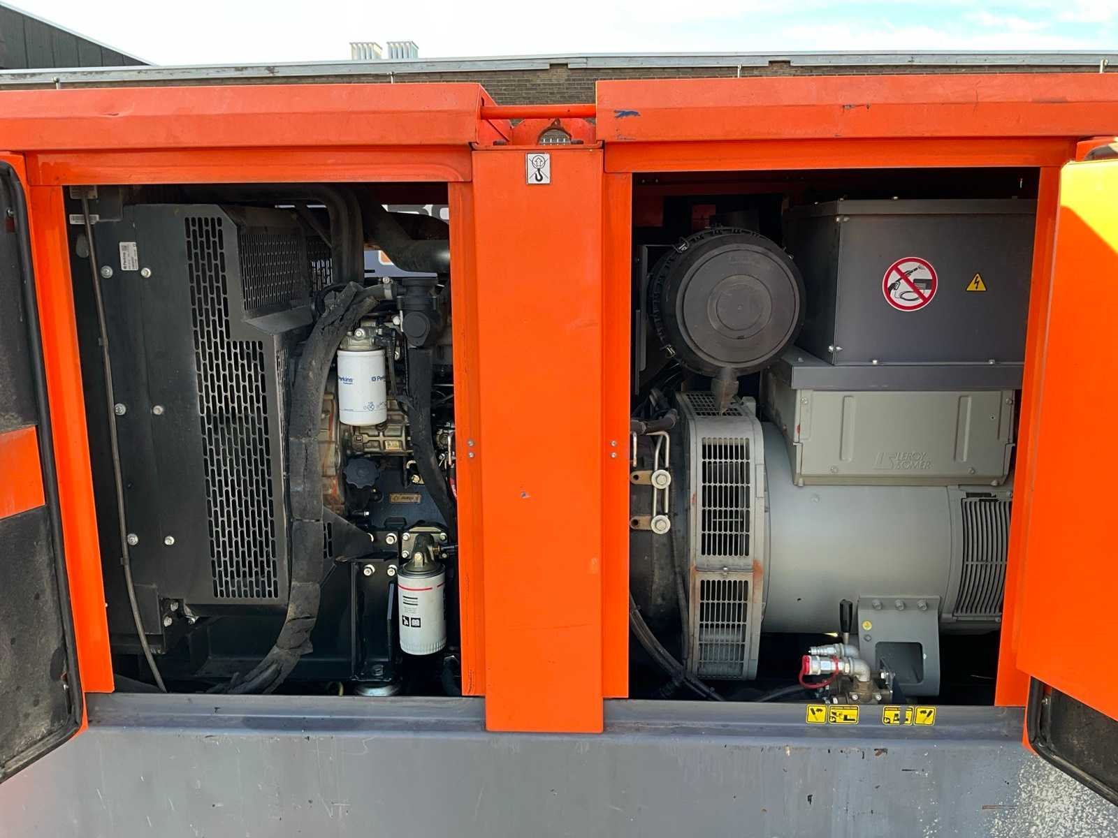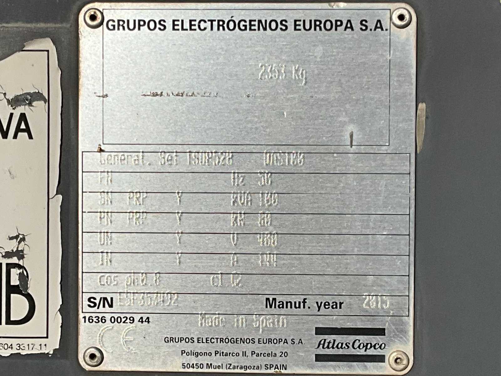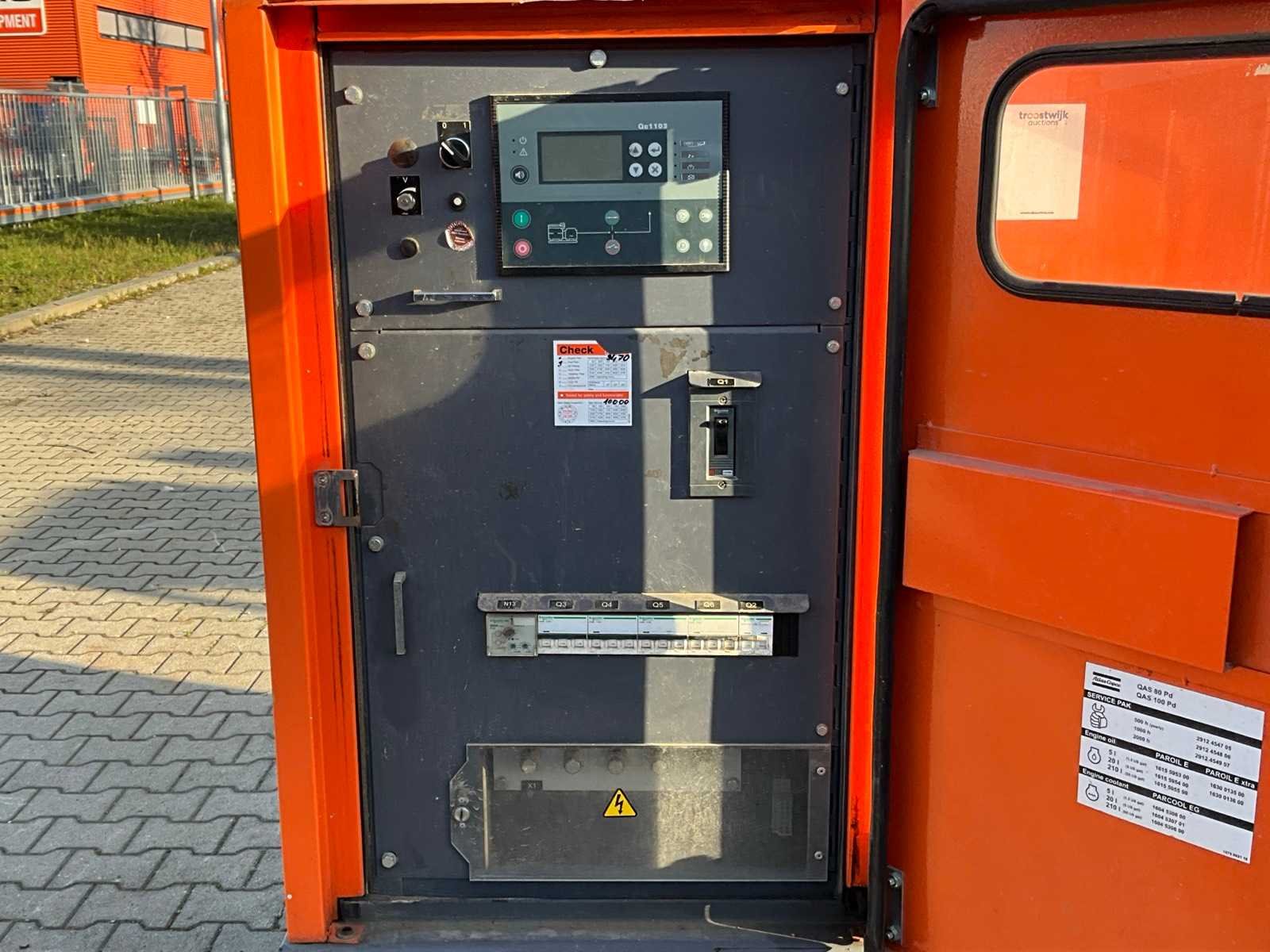 Geluidgedempt; aansluiting: 1x 400 Volt - 16 Ampère; 1x 400 Volt - 32 Ampère; 2x 400 Volt - 63 Ampère; 1x 230 Volt; inhoud brandstoftank 590 liter; aansluiting externe brandstoftank; verbruik bij maximale belasting 24 liter / uur; heftruck sleuven; hijsoog; working condition; Merk: Grupos Electrogenos Europa / Atlas Copco Type: QAS 100 Bouwjaar: 2015 Serienummer: ESF353492 Capaciteit.: 100kVA Motor merk: Perkins 4 cilinder Motorcapaciteit: 80kW Generator merk: Leroy-Somer Afgelezen urenstand: 10236 Machinegewicht: 2500kg Totale afmeting L: 2850mm Totale afmeting Breedte: 1100mm Totale afmeting Hoogte: 1850mm