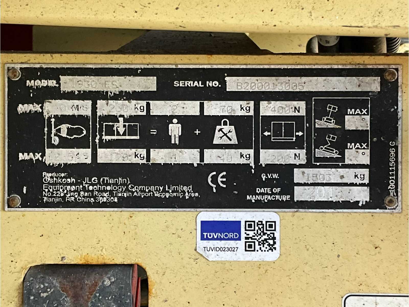 Gebruik: binnen en buiten; platform vloerhoogte 5700 mm; uitschuifbaar platform afmeting circa 2750x750 mm; interne acculader 230 Volt; kooibediening; transporthoogte circa 1750 mm; working condition; Merk: JLG Type: 1930ES Bouwjaar: 2013 Serienummer: B200013005 Elektrisch: true Schaarhoogwerker: true Werkhoogte: 7700mm Plateau afm. l: 1850mm Plateau afm. b: 750mm Platform capaciteit: 230kg Afgelezen urenstand: 524 Eigen gewicht: 1550kg Totale afmeting L: 1900mm Totale afmeting Breedte: 800mm Totale afmeting Hoogte: 2050mm