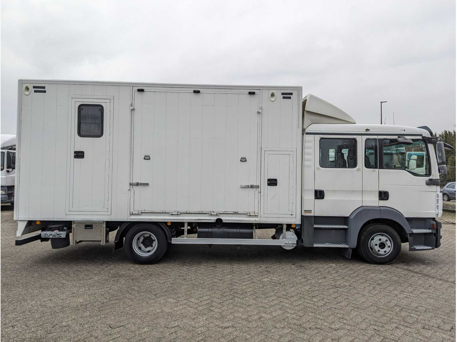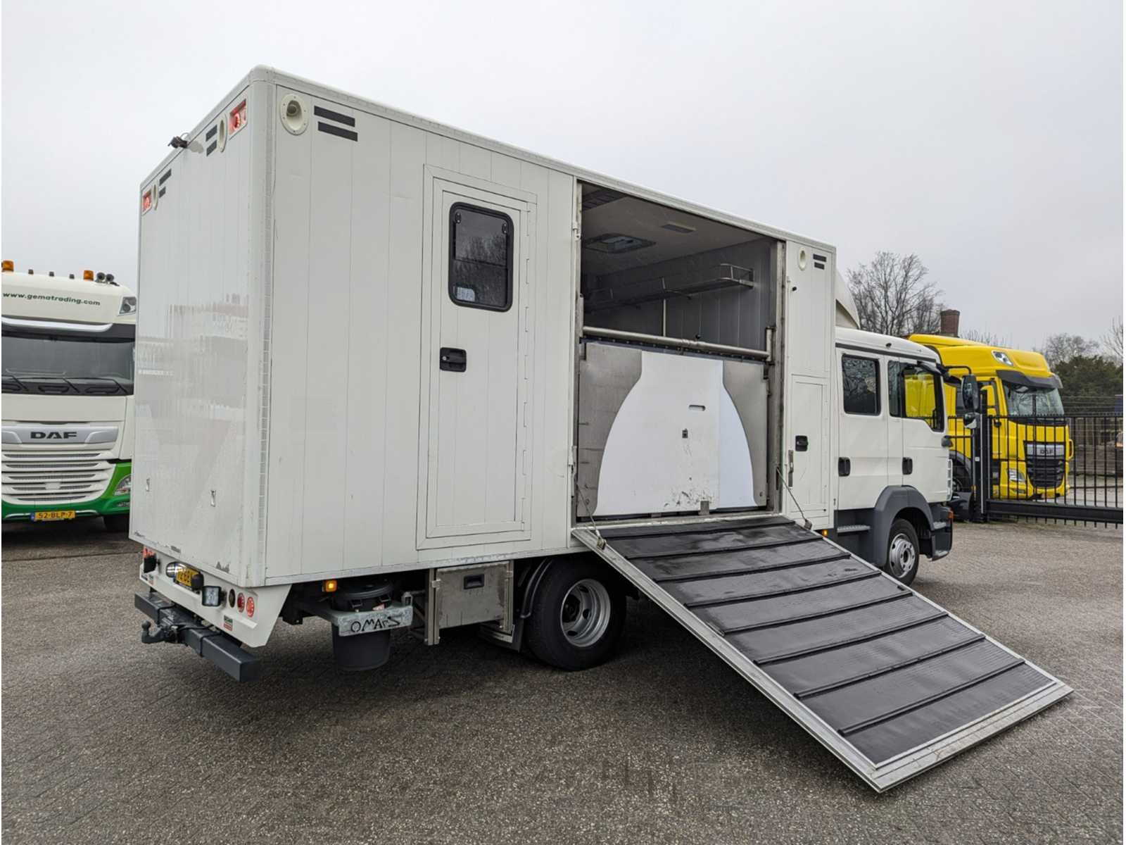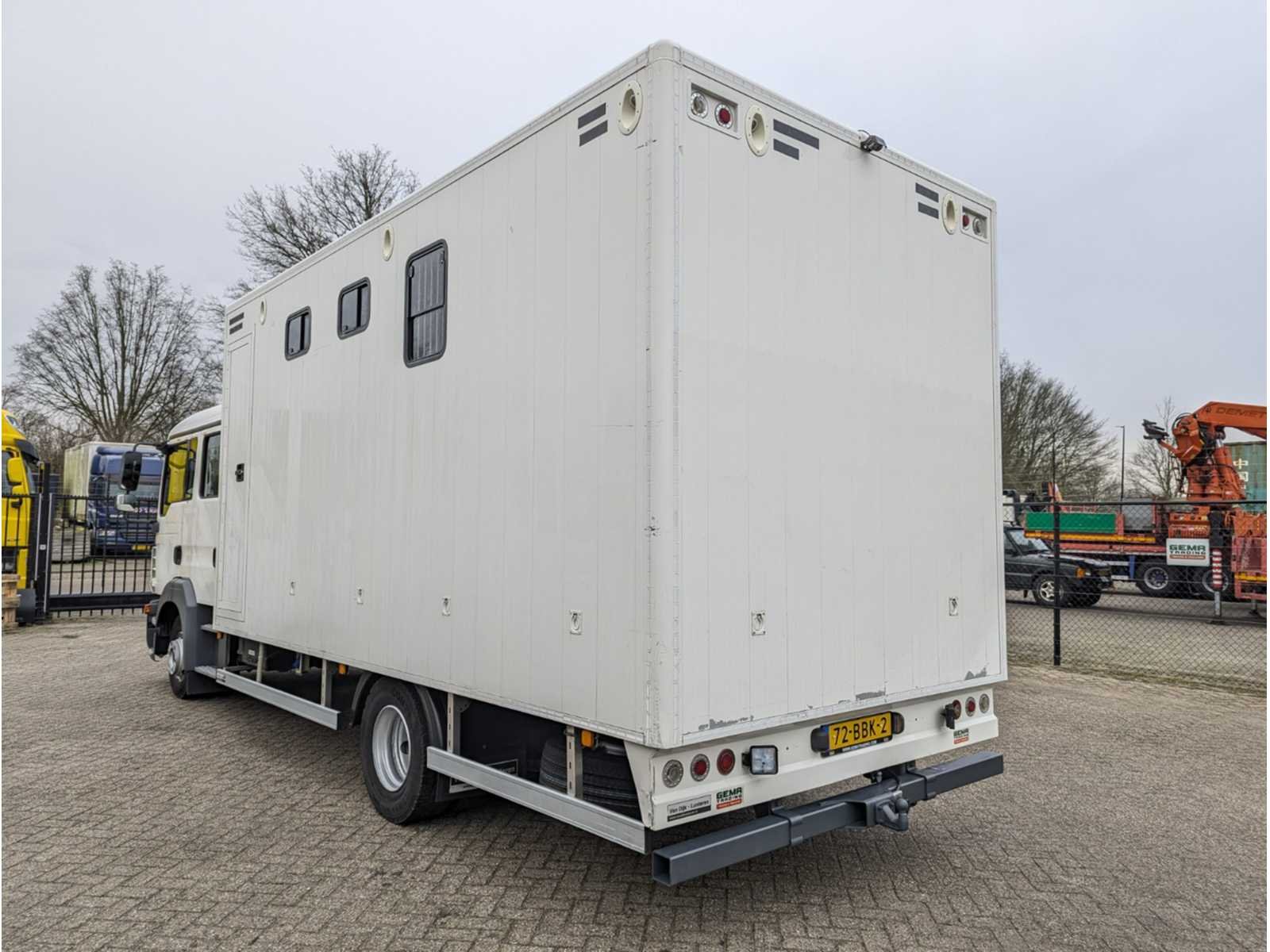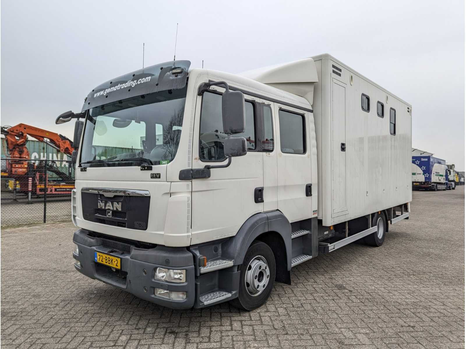 Voorzien van dubbel cabine, 7-zitplaatsen, lederen stoelen, airco, achteruitrij camera, camera in laadruimte, cruise control, tussenschot met hengstenschot, dekenrek, opbergvakken / zadelkasten, zijramen, ventilatoren, laad/ losklep met zijschotten, dag / nachtverlichting, buitenverlichting, LED verlichting, accu’s, CE-stekker voor walstroom, omvormer / oplader, WAP trekhaak 3500kg, sperdifferentieel, reserve wiel, elektrische verstelbare buitenspiegels, boordcomputer, (dak) spoiler, stabiliteitsregeling (ESP), schijfremmen, mistlampen, centrale deurvergrendeling, ABS en roetfilter Kenteken: 72-BBK-2 Merk: Man Type: TGL 1.180 Bouwjaar: 2012 Chassisnummer VIN: WMAN15ZZ9DY290444 Cilinderinhoud: 4580cc Kilometerstand bij opname: 147142km APK vervaldatum: 2024-12-16 Datum eerste toelating: 2012-12-14 Aantal assen: 2 Asconfiguratie: 4x2 Laadvermogen: 15490kg Aantal sleutels: 2 Emissieklasse: 5 Eigen gewicht: 4830kg Totale afmeting L: 8100mm Totale afmeting Breedte: 2530mm Aantal zitplaatsen: 7 Diesel: true