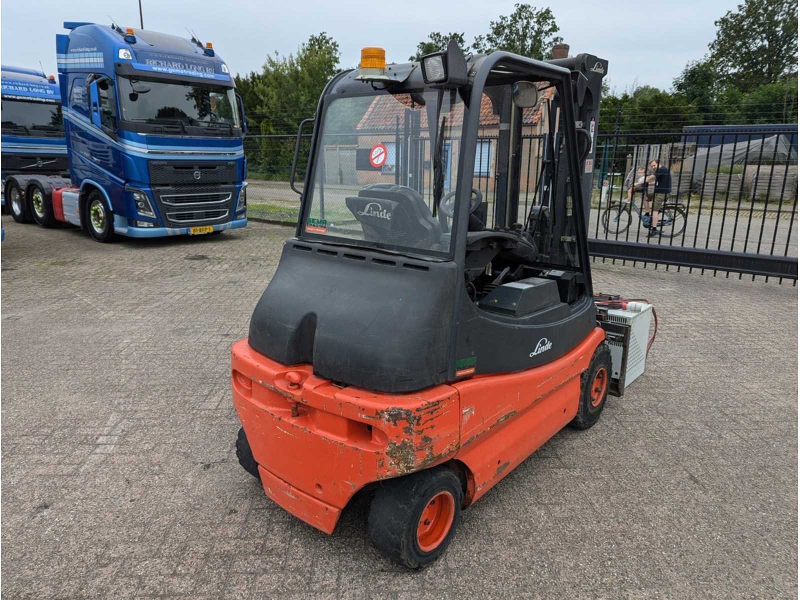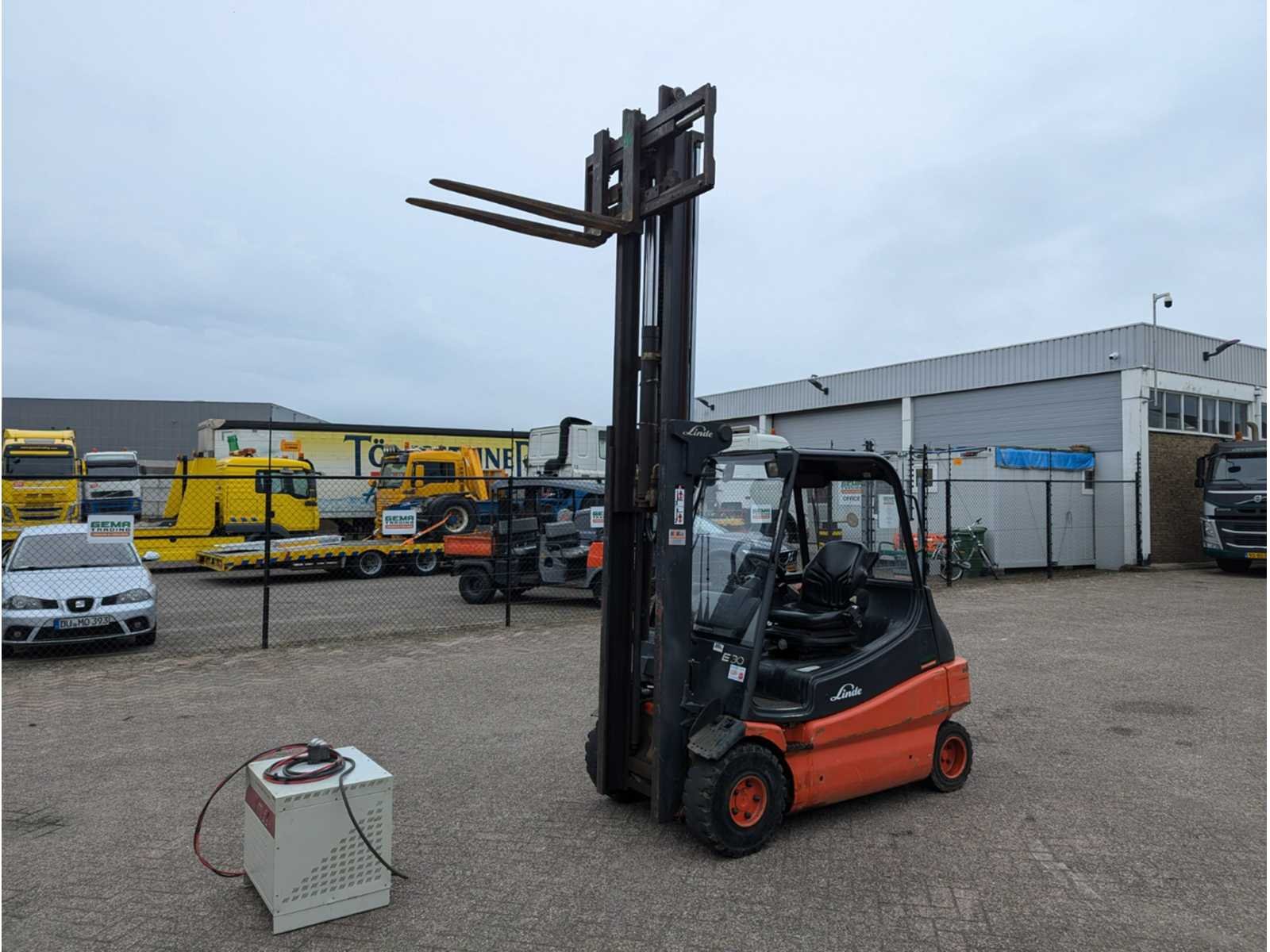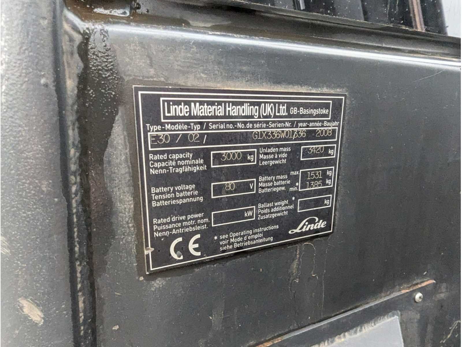 Voorzien van “Eurotron” 80V-80A oplader en werklampen Merk: Linde Type: E30 Bouwjaar: 2008 Serienummer: G1X336W01336 Brandstof: Elektrisch Mast: Duplex Soort band: Volrubber banden Aantal wielen: 4 Afgelezen urenstand: 4058 Accu lader: true Free-lift: true Side-shift: true Eigen gewicht: 3420kg Hefvermogen: 3000kg Hefhoogte: 4500mm Vol rubber banden: true