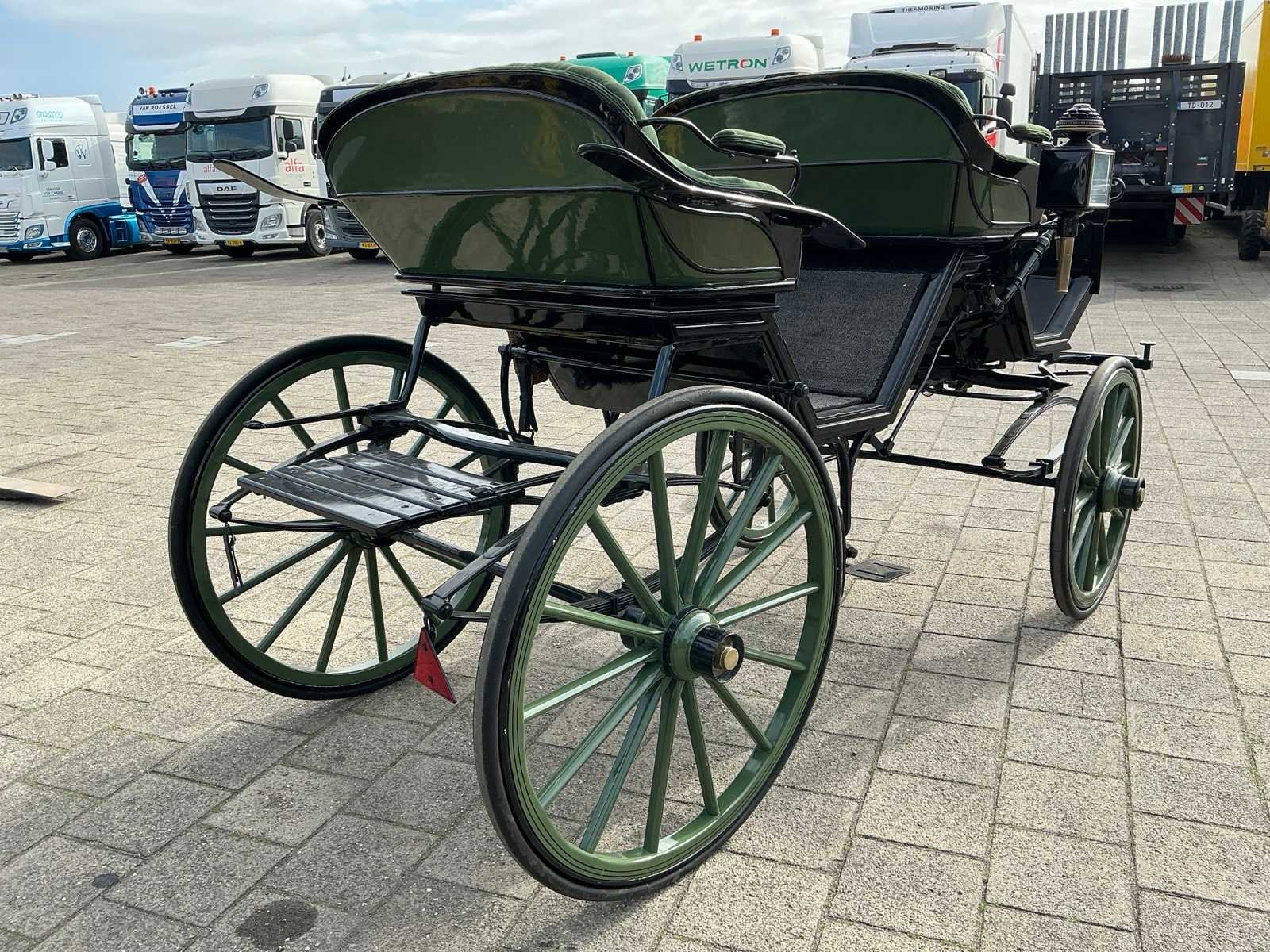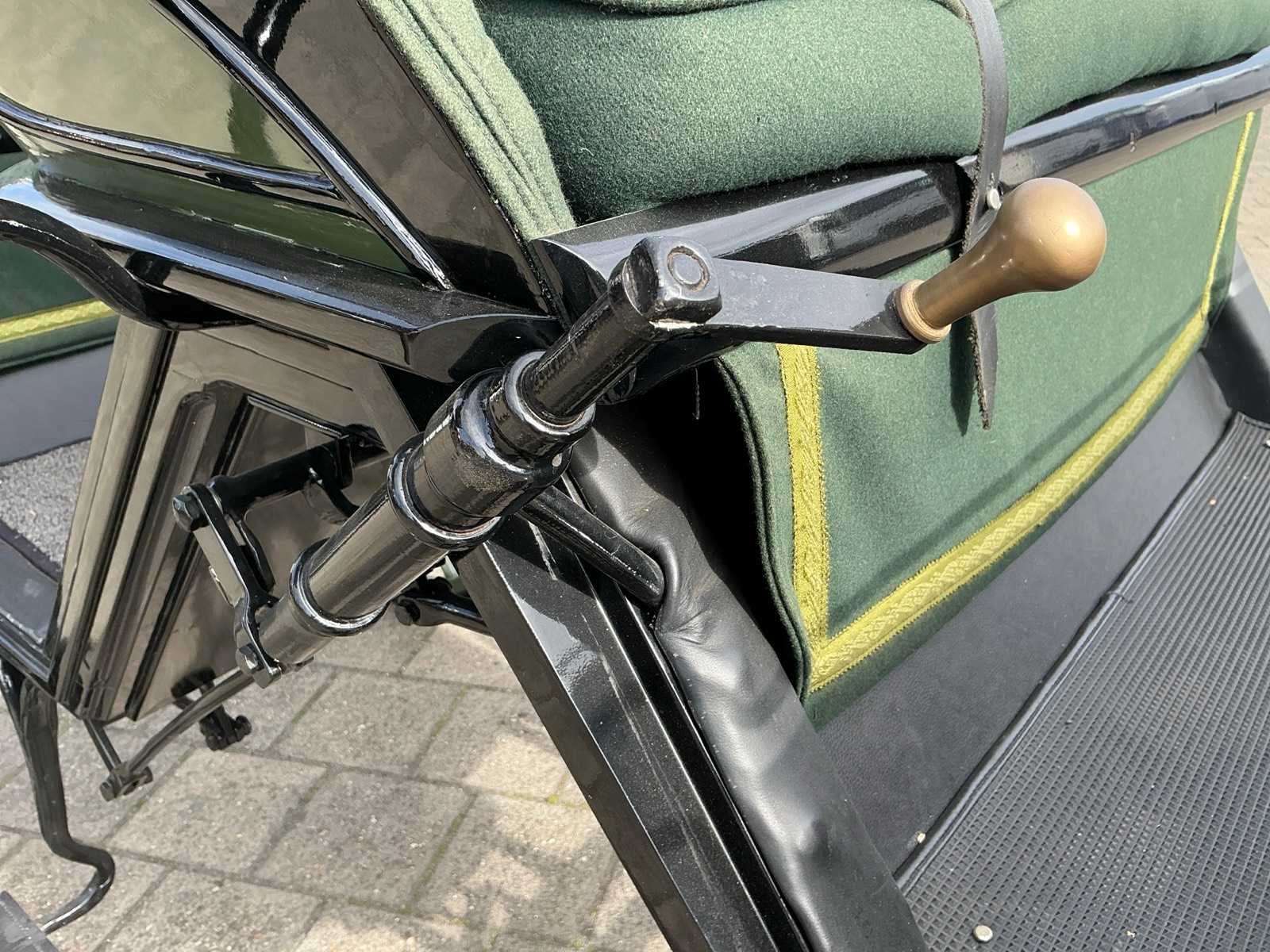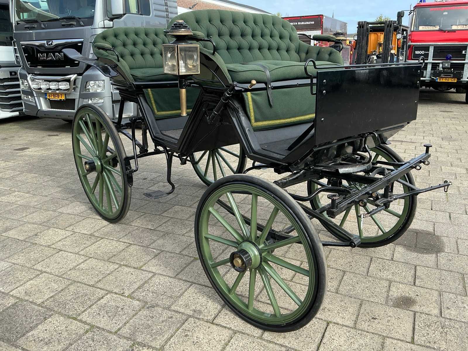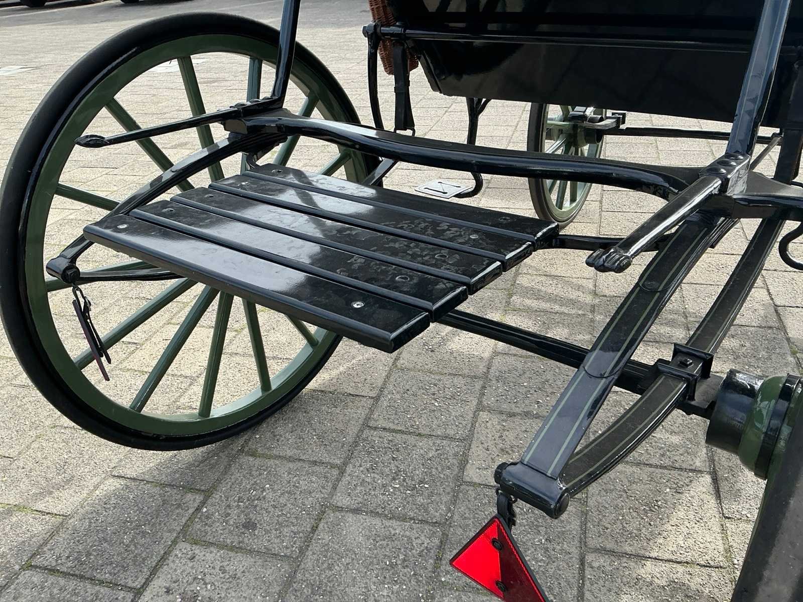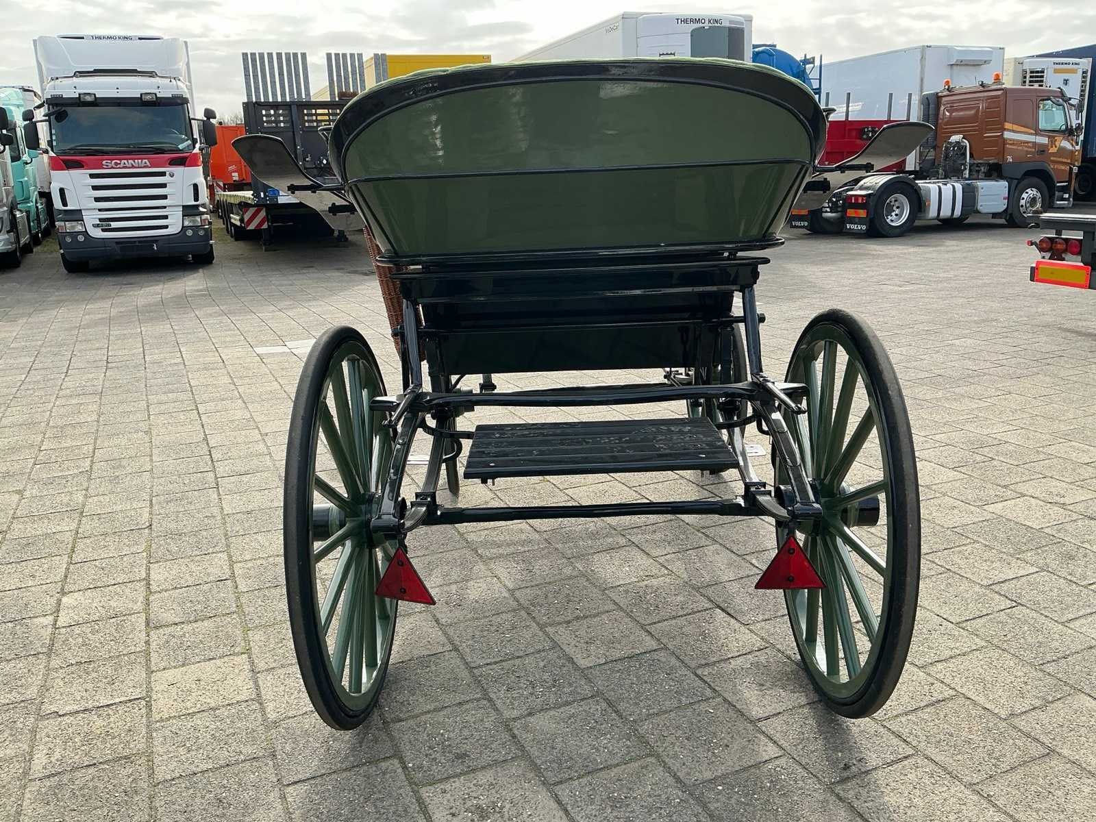 Dubbel span, Achter geremd, Rem aanloop verstelbaar, Spoorbreedte 136cm, Rubber op houten wielen Model: Open Kleur: Zwart en groen Lengte: 310cm Breedte: 166cm Hoogte: 177cm