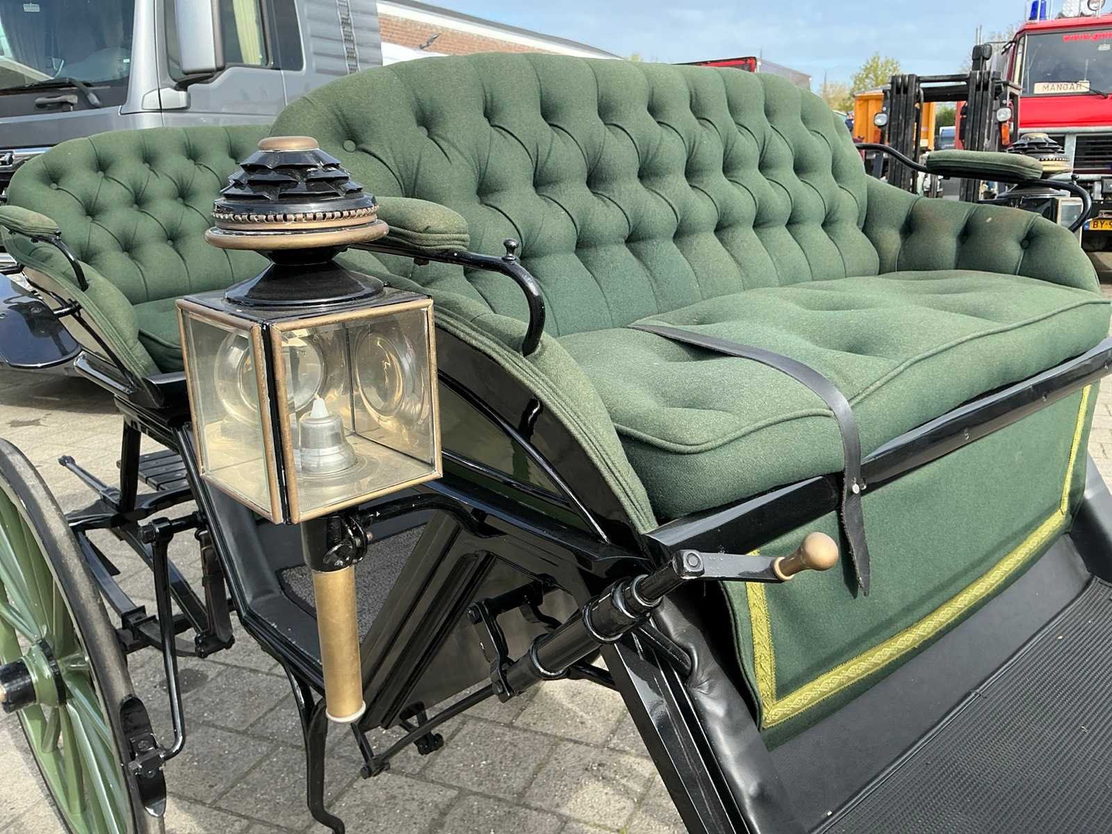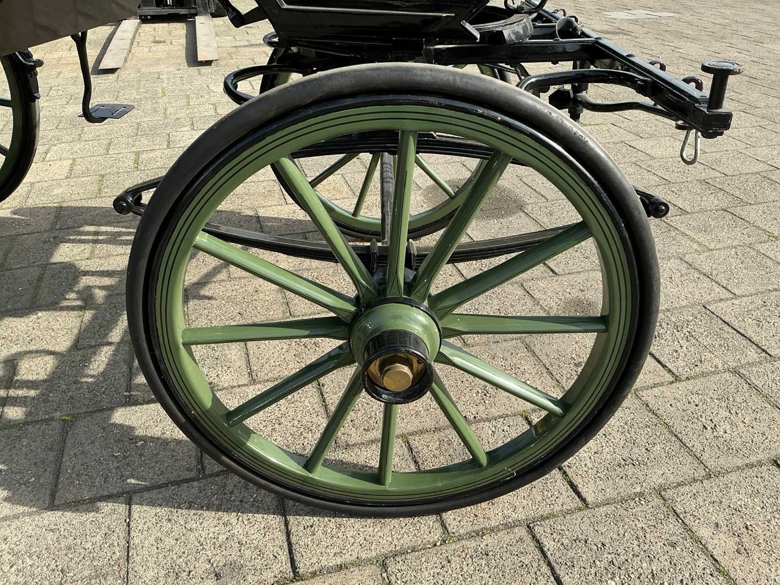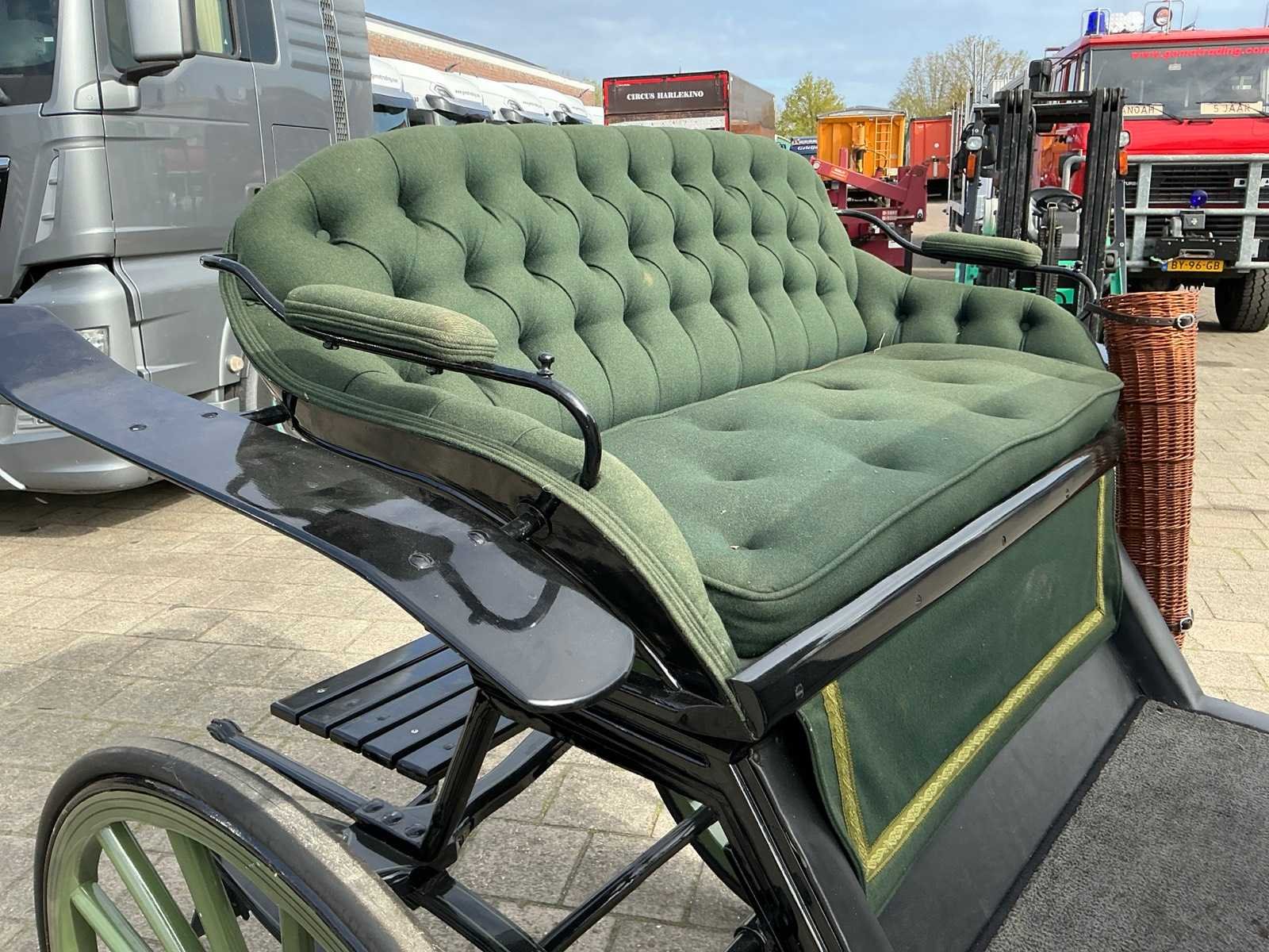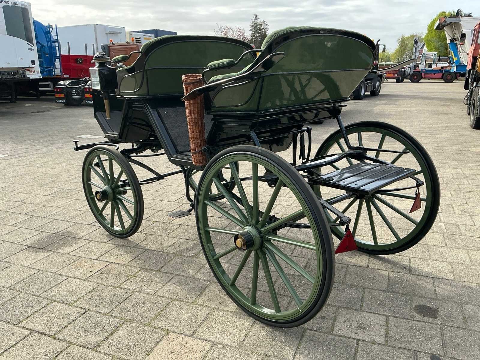 Dubbel span, Achter geremd, Rem aanloop verstelbaar, Spoorbreedte 136cm, Rubber op houten wielen Model: Open Kleur: Zwart en groen Lengte: 310cm Breedte: 166cm Hoogte: 177cm