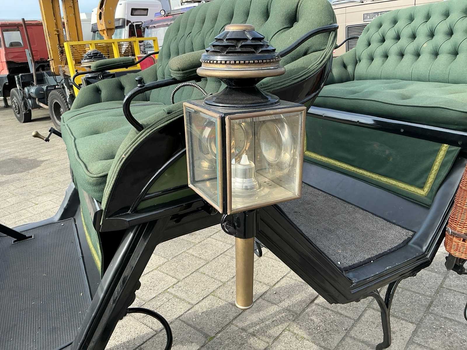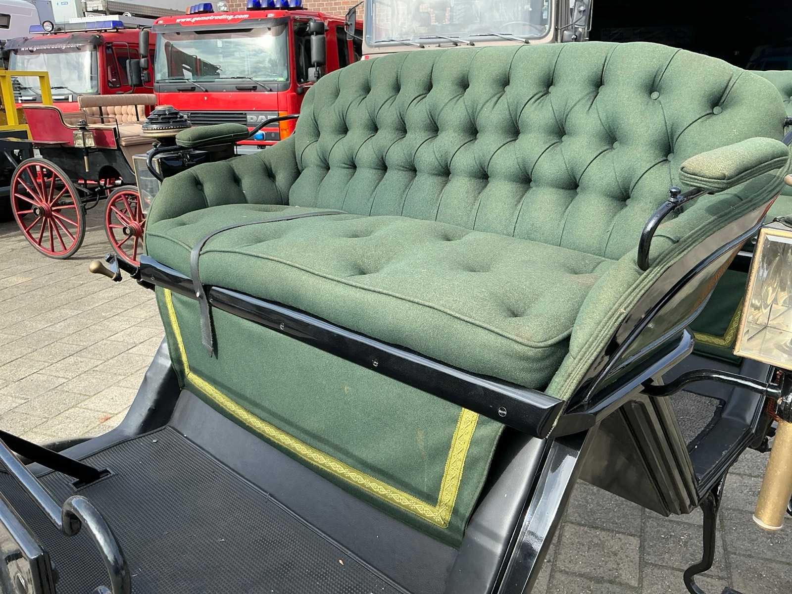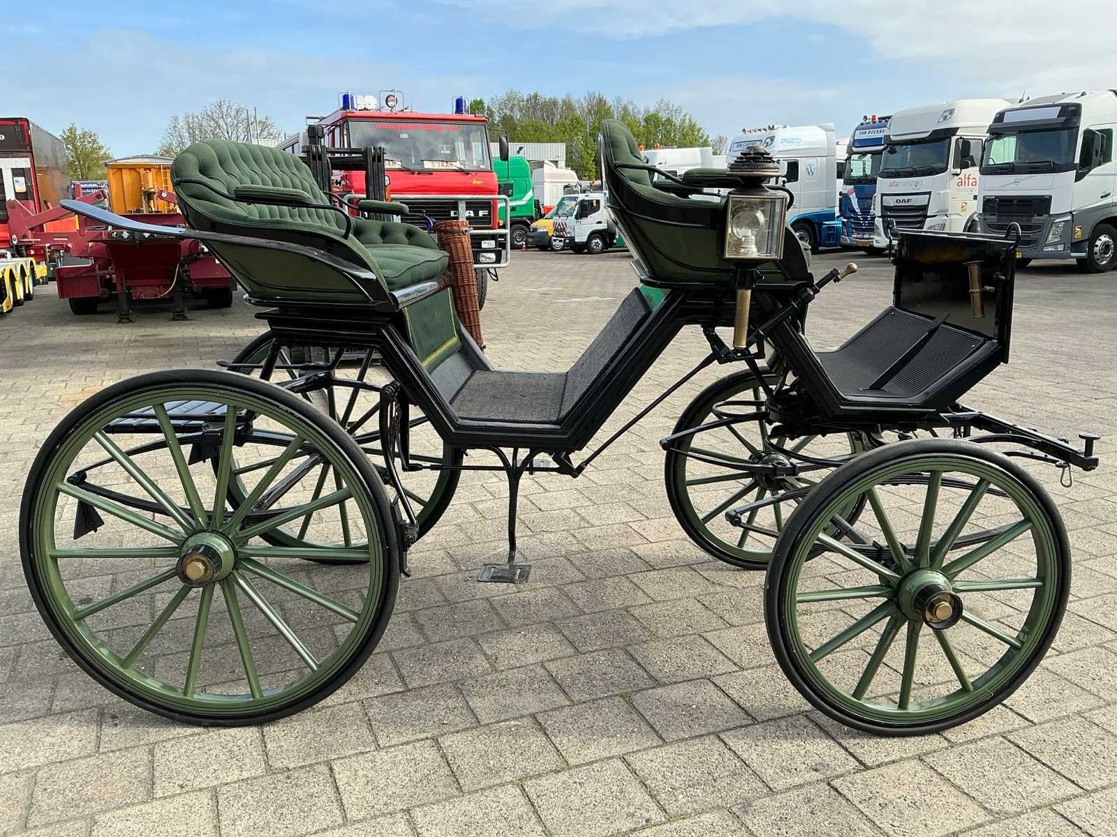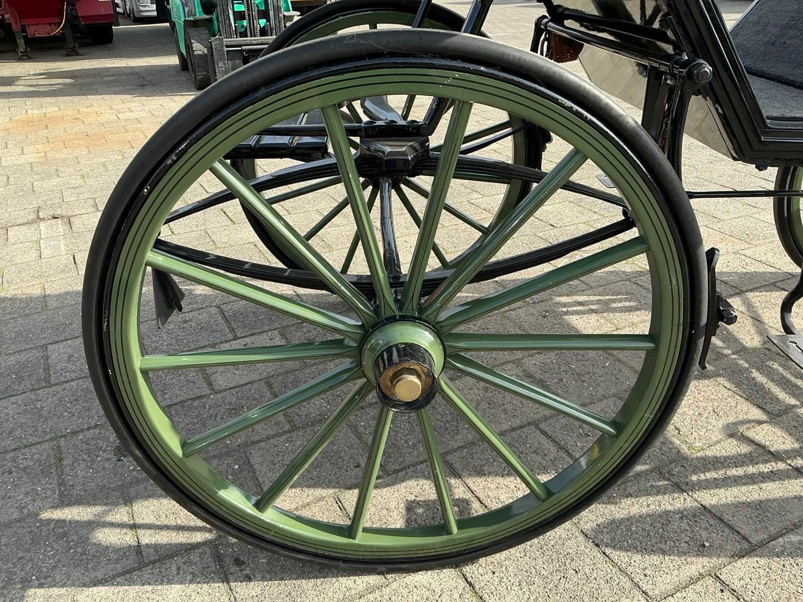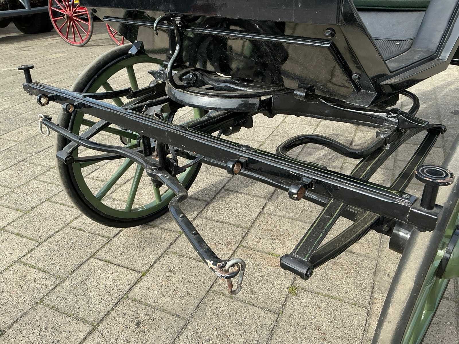 Dubbel span, Achter geremd, Rem aanloop verstelbaar, Spoorbreedte 136cm, Rubber op houten wielen Model: Open Kleur: Zwart en groen Lengte: 310cm Breedte: 166cm Hoogte: 177cm