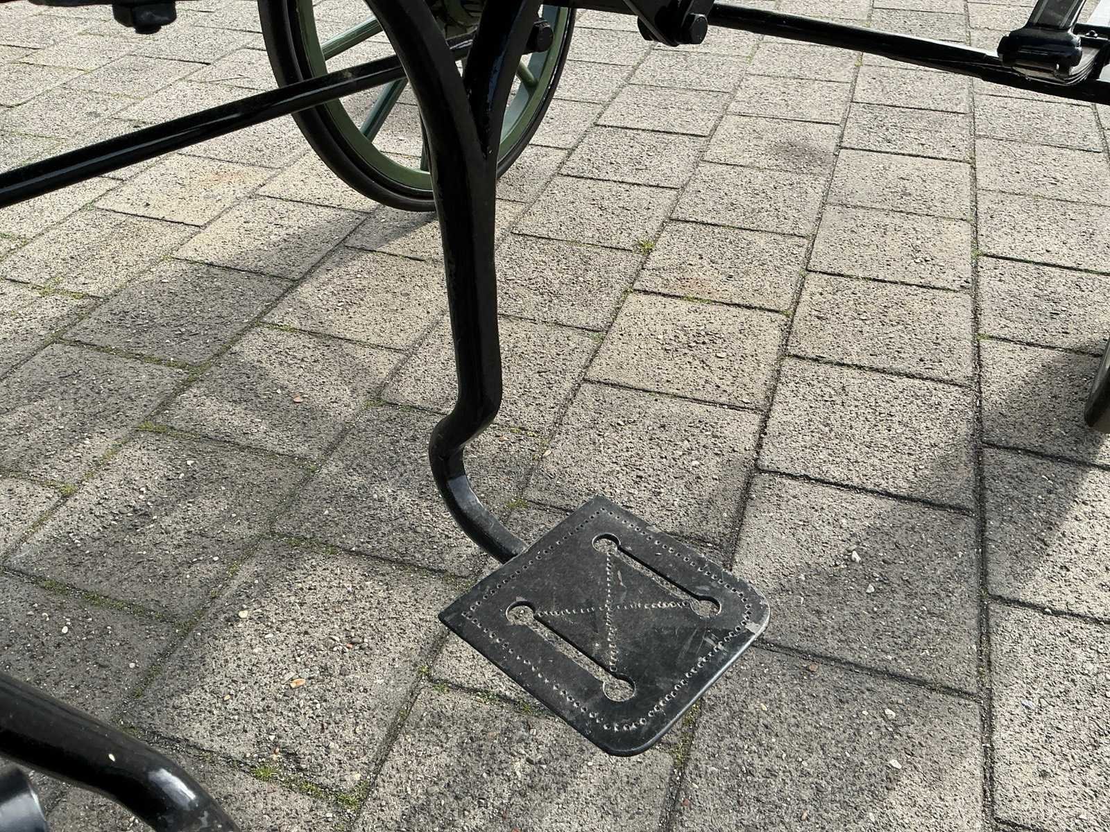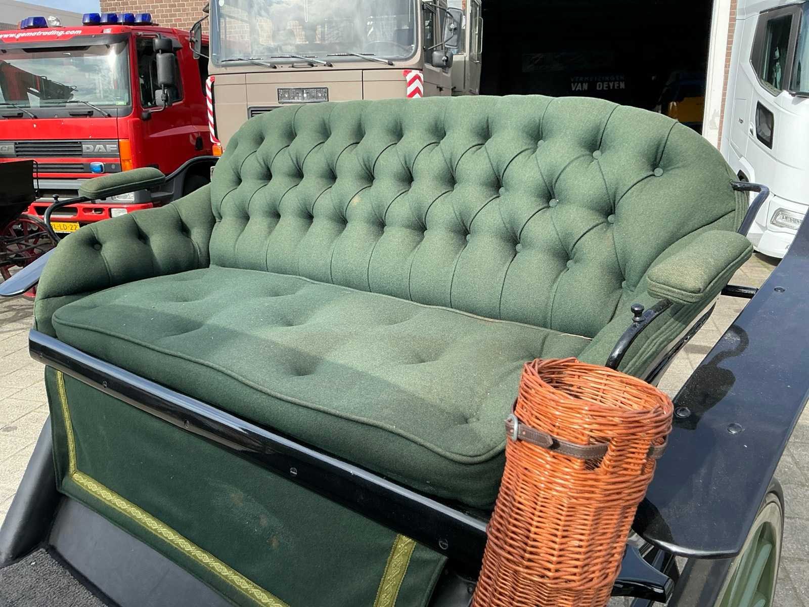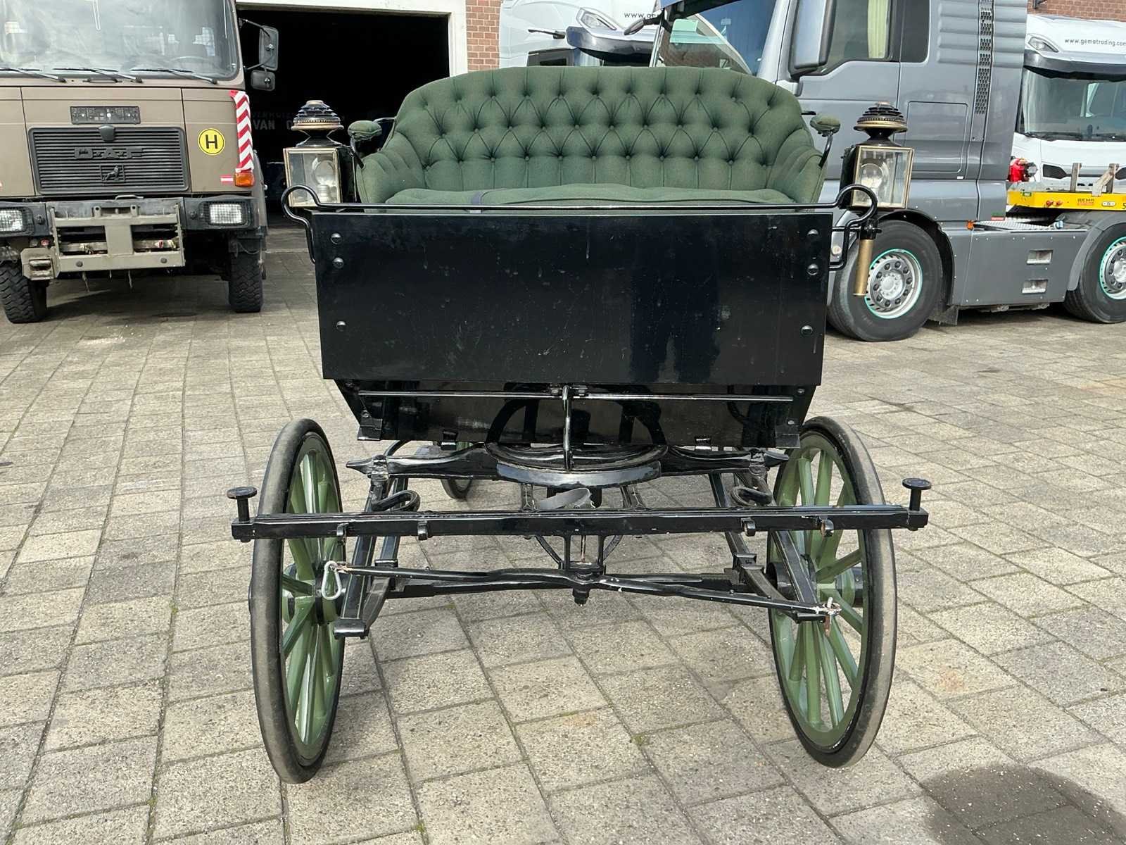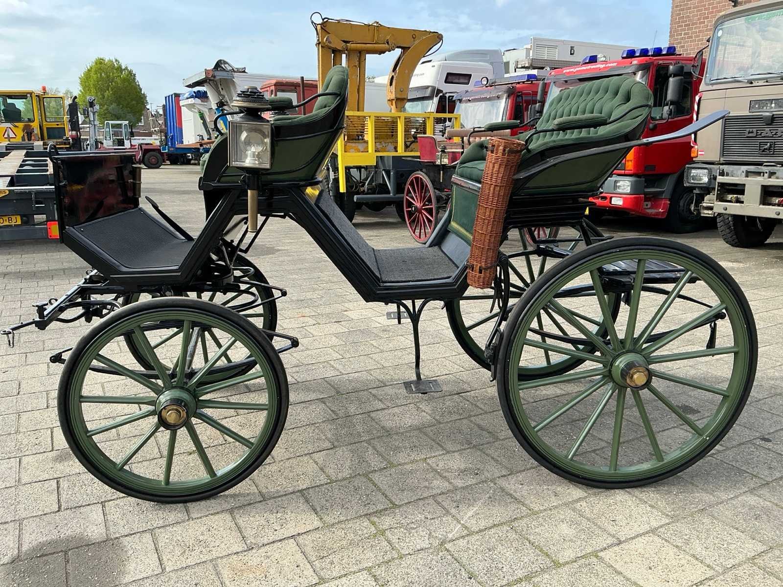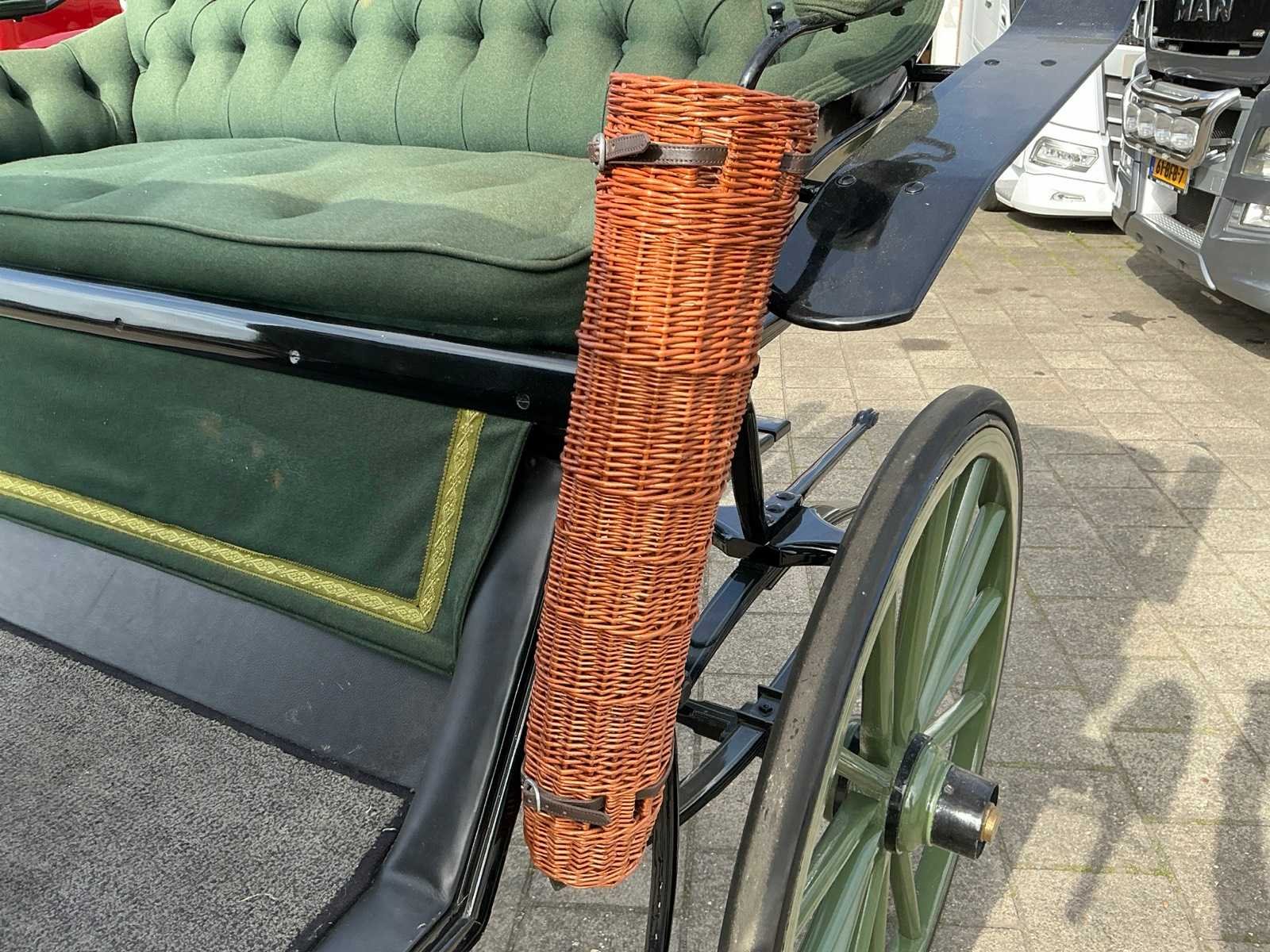 Dubbel span, Achter geremd, Rem aanloop verstelbaar, Spoorbreedte 136cm, Rubber op houten wielen Model: Open Kleur: Zwart en groen Lengte: 310cm Breedte: 166cm Hoogte: 177cm