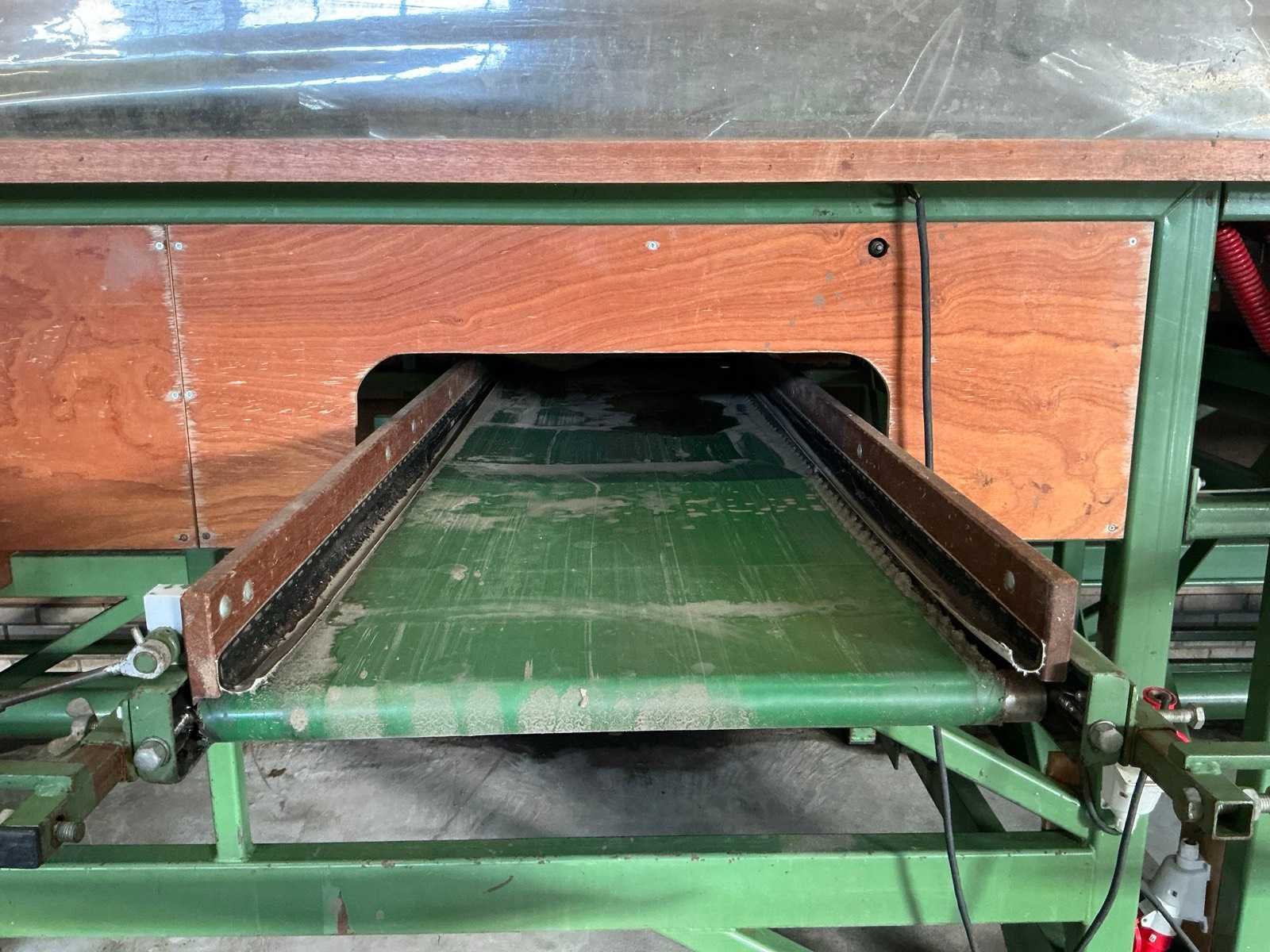 V.v. Instortbak (1200x1220 mm), voorsortering met bovenband (werkbreedte 1000 mm, bandlengte 4200 mm), sorteerdekken geschikt voor platen 1200x1200 mm, meerdere sorteerunits met valbrekerdoeken, bovenbouw met stofafzuiging, 8 afvoerbanden (werkbreedte 565 mm). Inclusief diverse sorteerplaten met de volgende afmetingen: 1 (4), 1 (6), 1 (7), 1 (8), 1 (9 1/4), 1 (10), 1 (11), 1 (11 1/10), 1 (12), 1 (12 1/10), 1 (12 1/4), 1 (13), 1 (13 1/2), 1 (13 3/4), 1 (14), 1 (14 1/4), 1 (14 3/4), 1 (15), 1 (15 3/4), 2 (16), 1 (17), 1 (18), 1 (18 1/2), 1 (19) Merk: Schouten Type: SMB 122/120-4 Bouwjaar: 1997 Serienummer: 97-6999-2 Aansluiting: 400V Totale afmeting L: 11500mm Totale afmeting Breedte: 2400mm Totale afmeting Hoogte: 2500mm