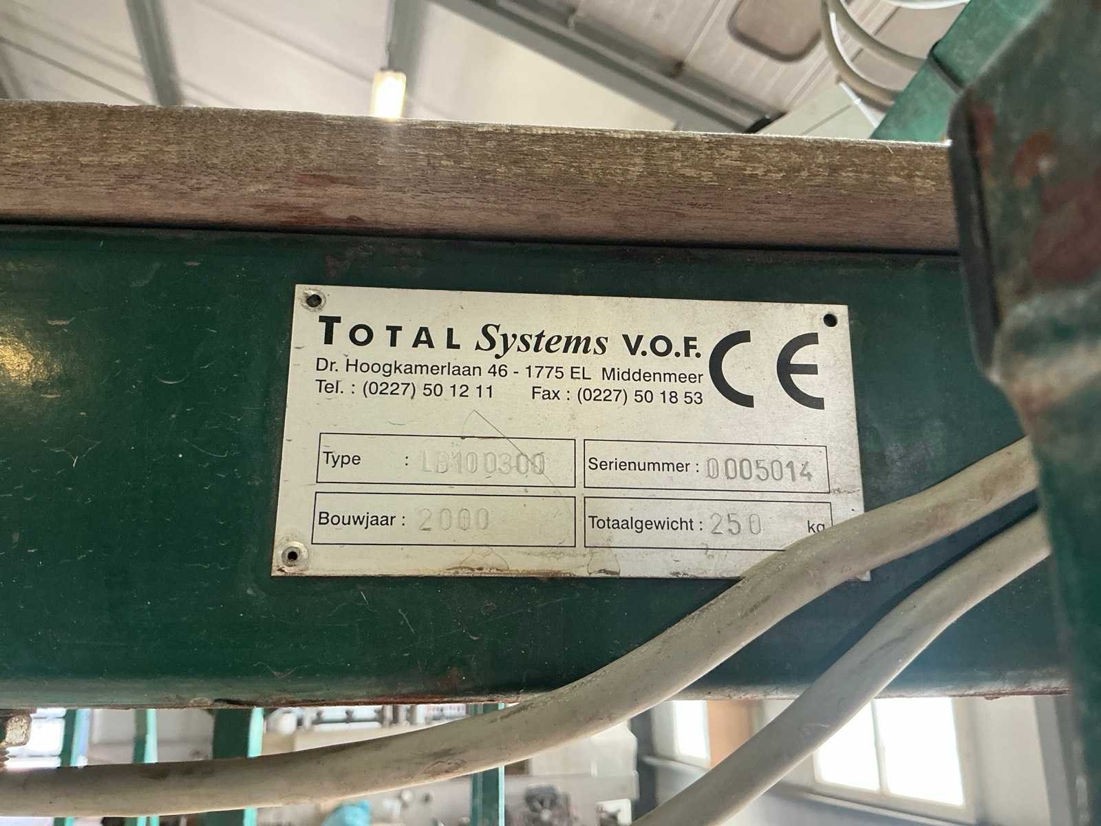 V.v. Total Systems LB400300 leesband, bouwjaar: 2000, werkbreedte 1000 mm, bandlengte 3050 mm. Bordes afmeting: 2500x2500x1150 mm, totale hoogte 2500 mm.
