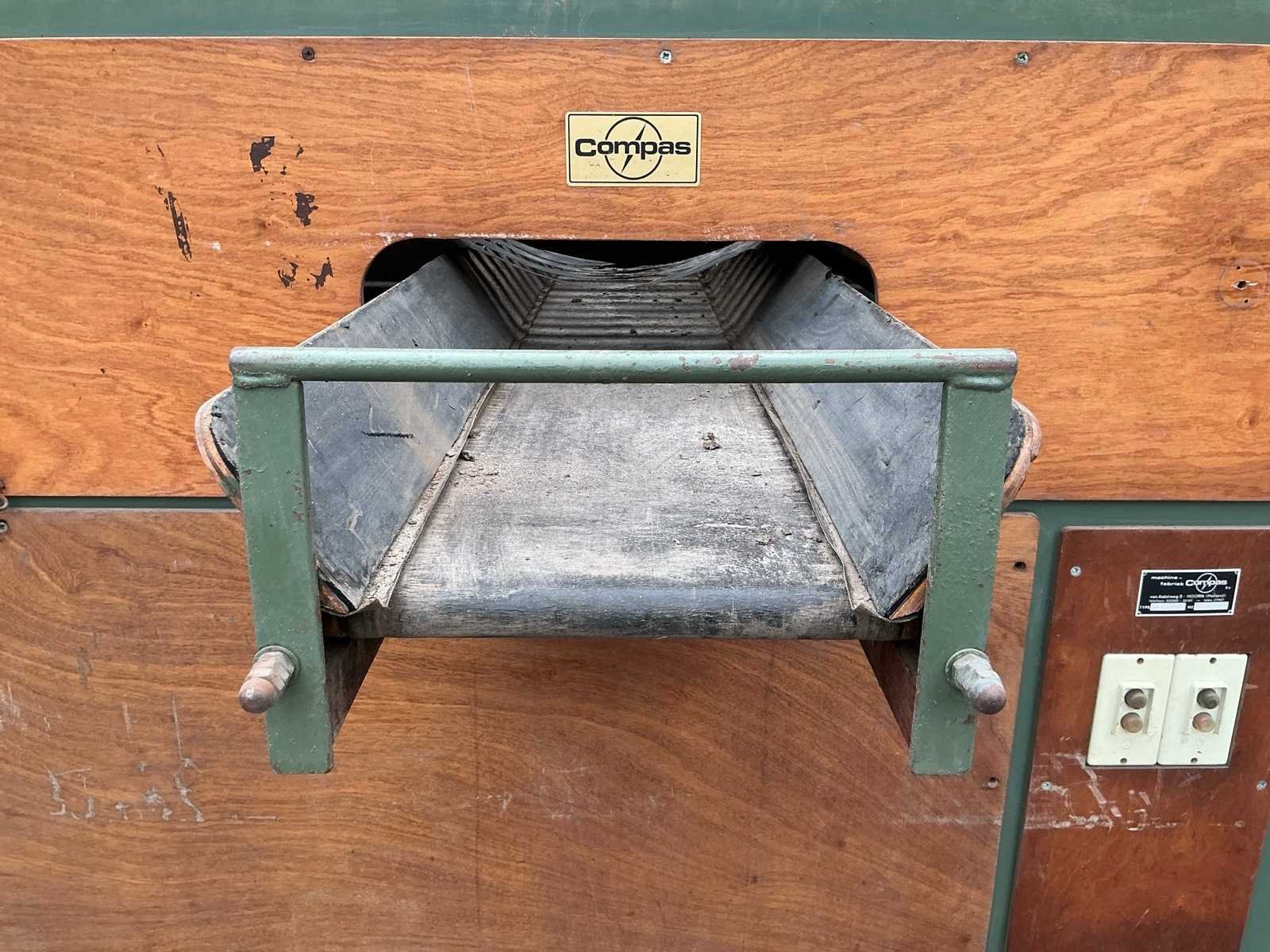Geschikt voor verwisselbare sorteerplaten (520x610 mm), 4 afvoerbanden (werkbreedte 260 mm), enkele schudinrichting, onderband voor afvoer (werkbreedte 800 mm), elektrische aandrijving. Merk: Compas Type: RD6B4 Bouwjaar: 1986 Serienummer: 4630586 Aansluiting: 400V Totale afmeting L: 5600mm Totale afmeting Breedte: 2000mm Totale afmeting Hoogte: 1650mm