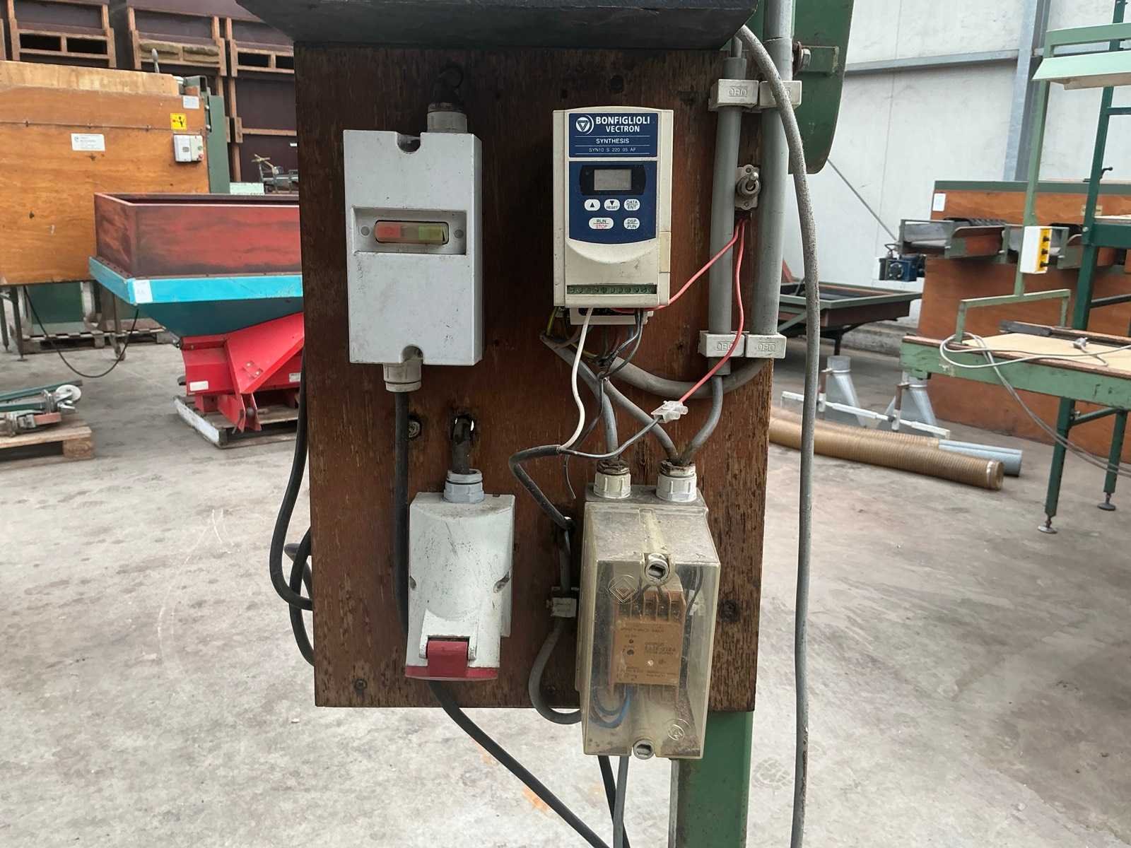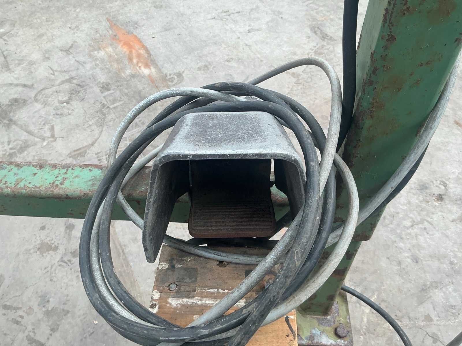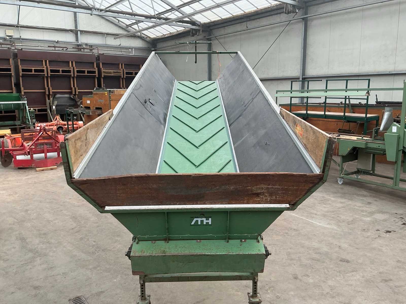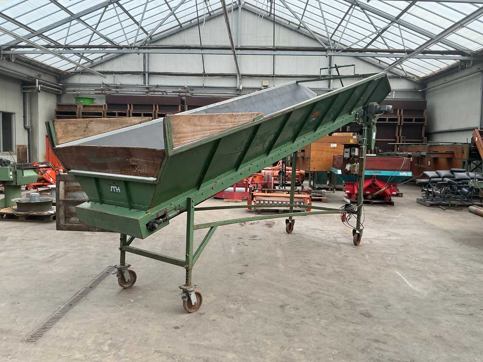 Elektrisch aangedreven, voetbediening, regelunit, op verrijdbaar onderstel, Merk: Schouten Transportband afm. b: 850mm Transportband afm. h: 5150mm Aansluiting: 400V Totale afmeting L: 5300mm Totale afmeting Breedte: 1800mm Totale afmeting Hoogte: 2800mm