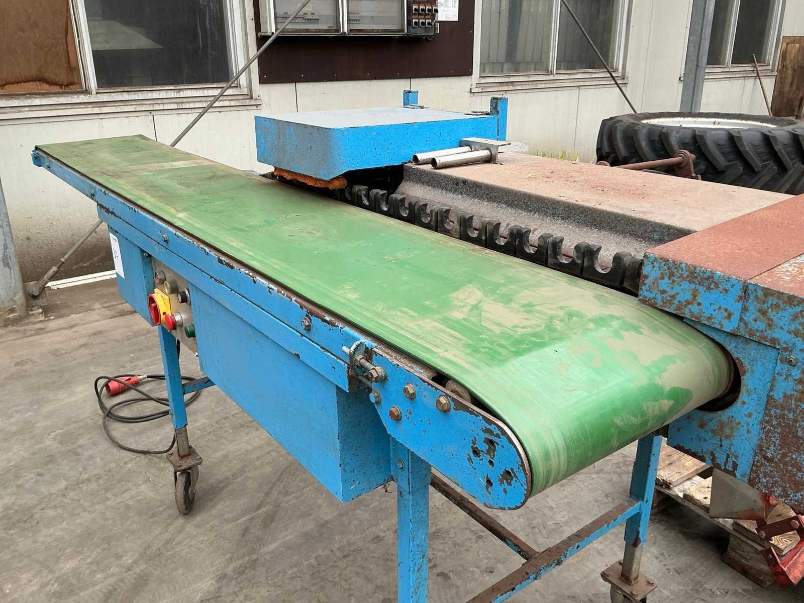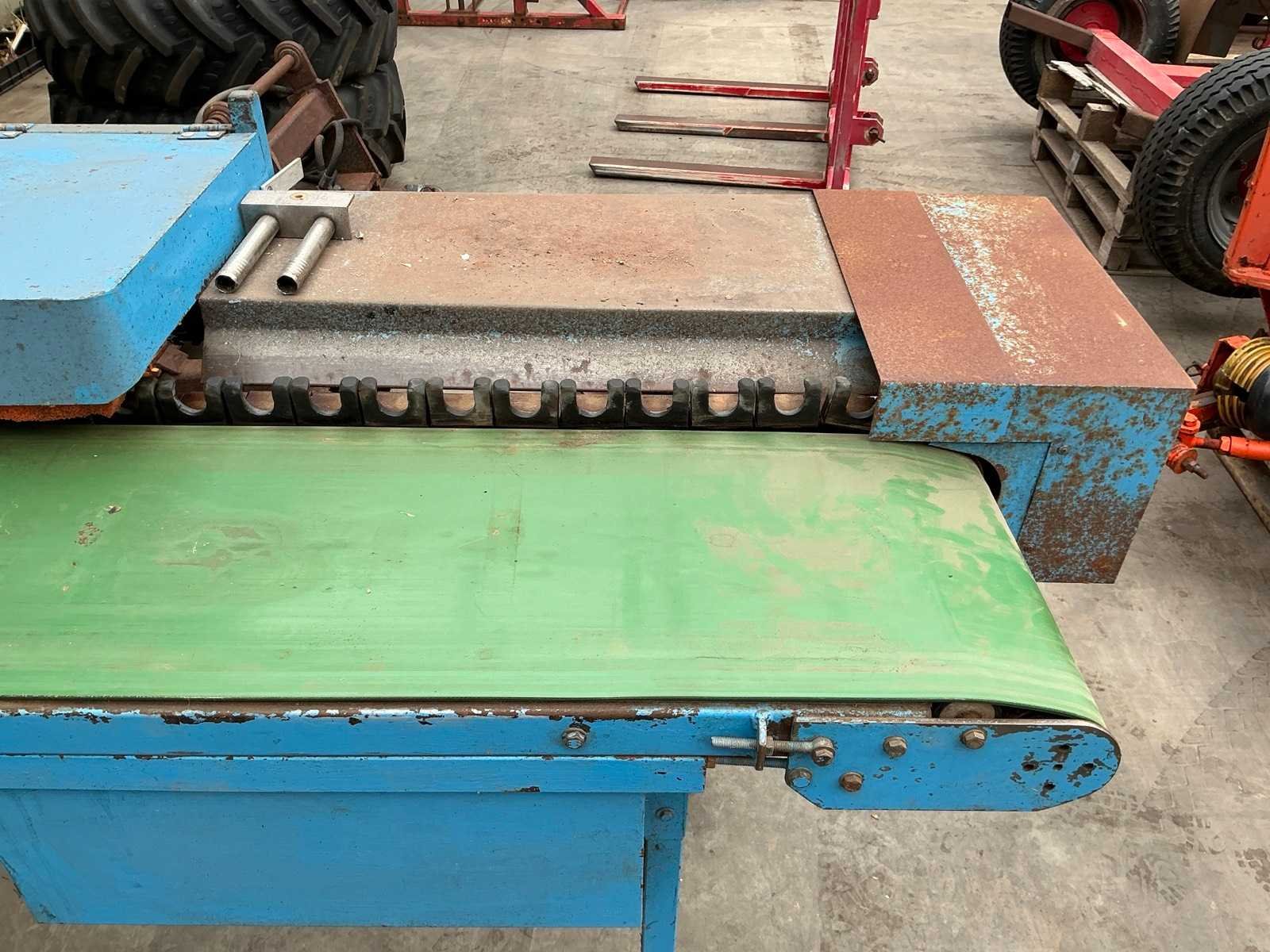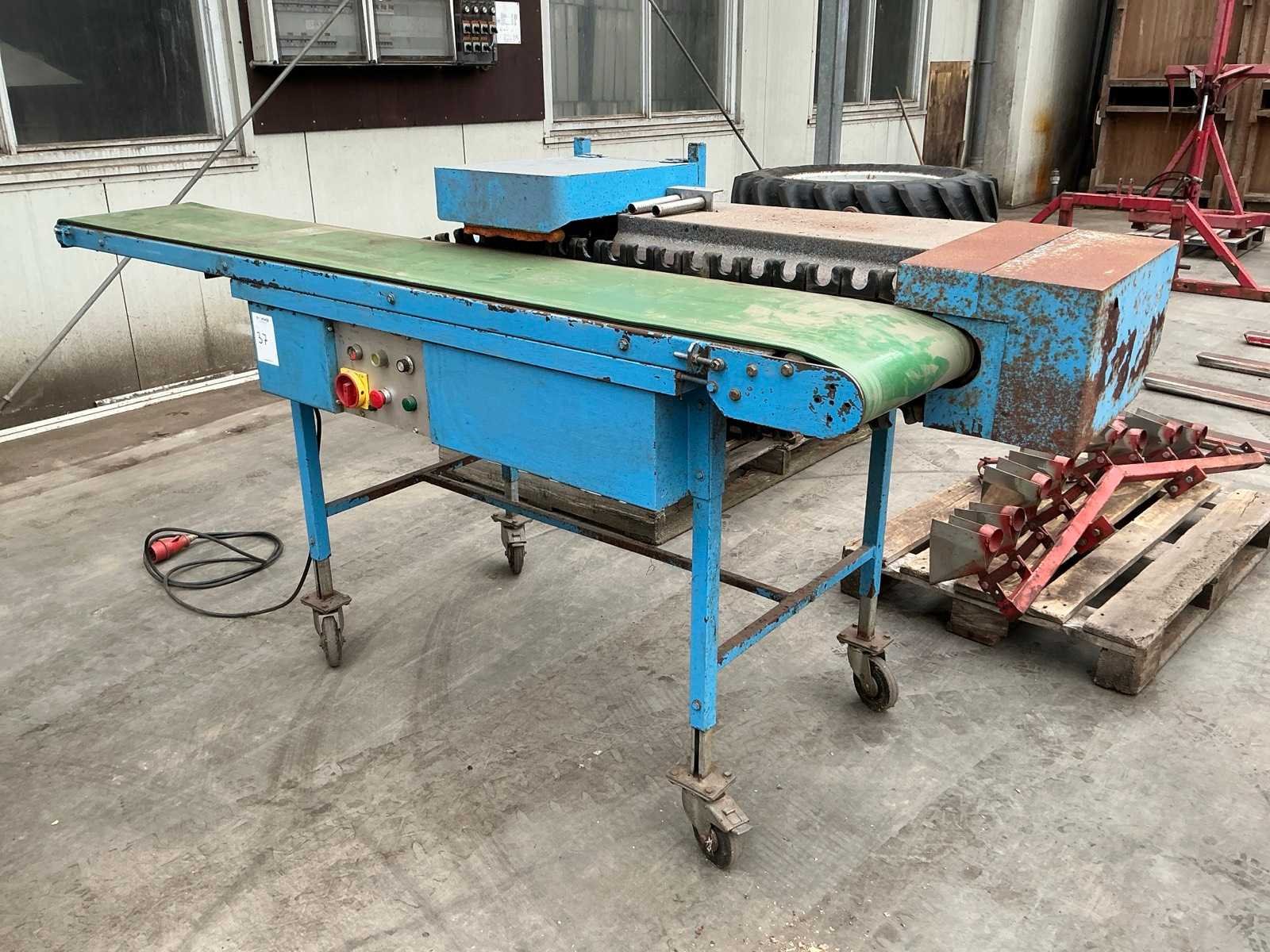 Dubbele snijunit, verstelbare snij/drukpennen, transportband met meenemers, frequentie instelbaar, verrijdbaar onderstel, transportband breedte: 350 mm, Aansluiting: 400V Totale afmeting L: 2480mm Totale afmeting Breedte: 800mm Totale afmeting Hoogte: 1100mm