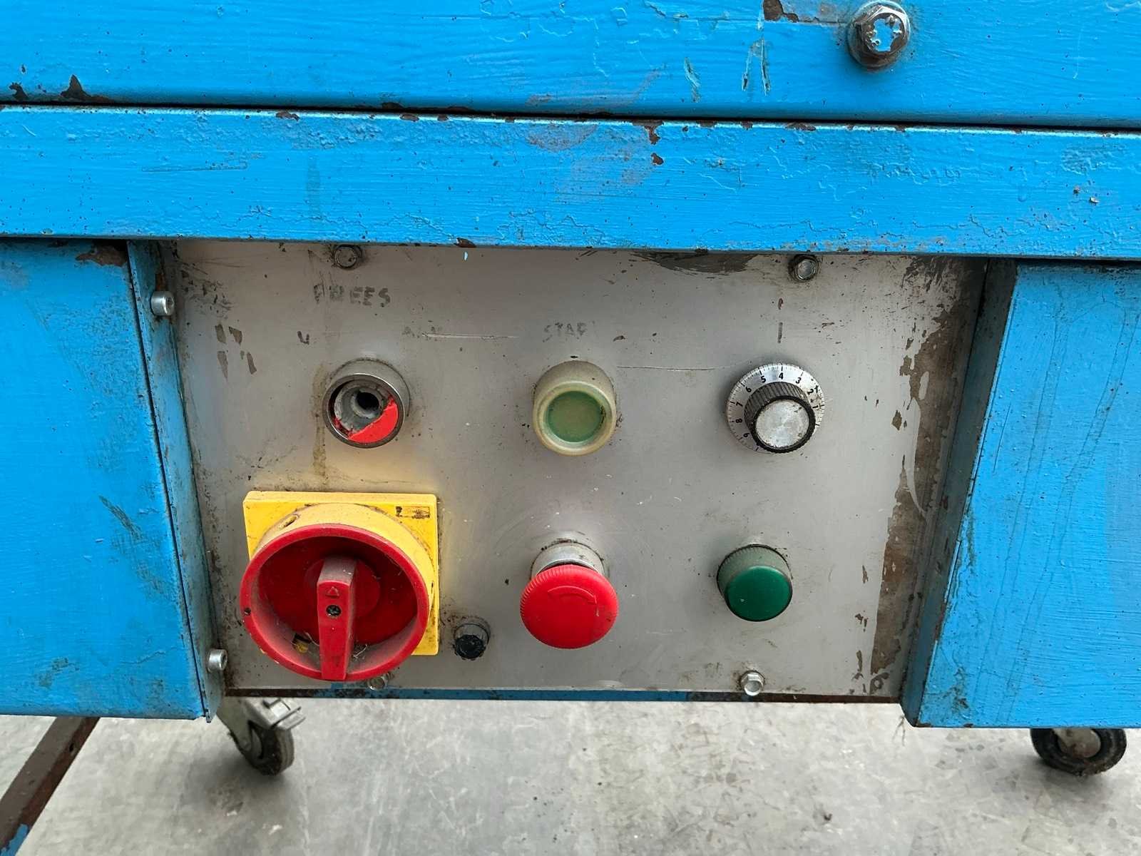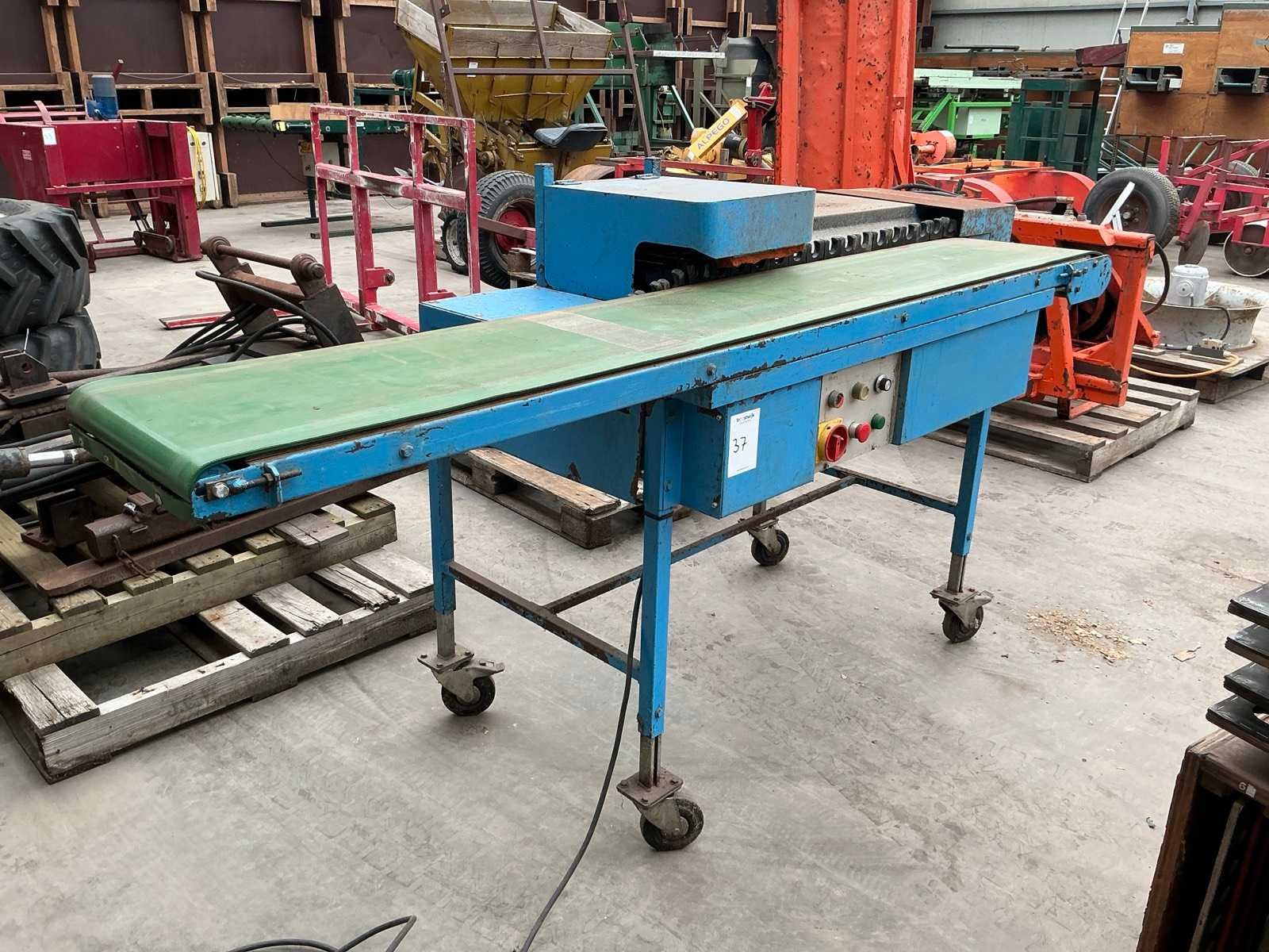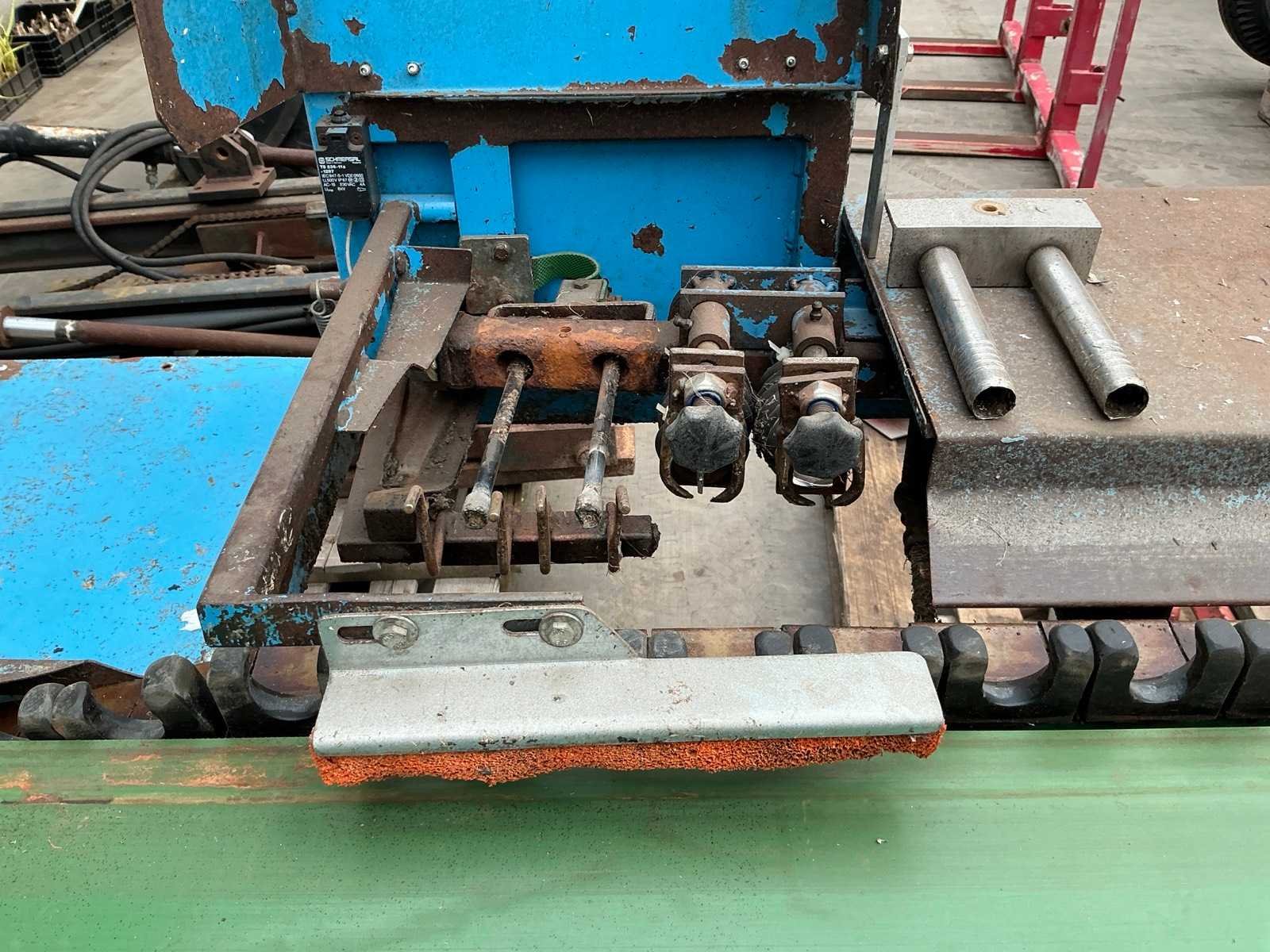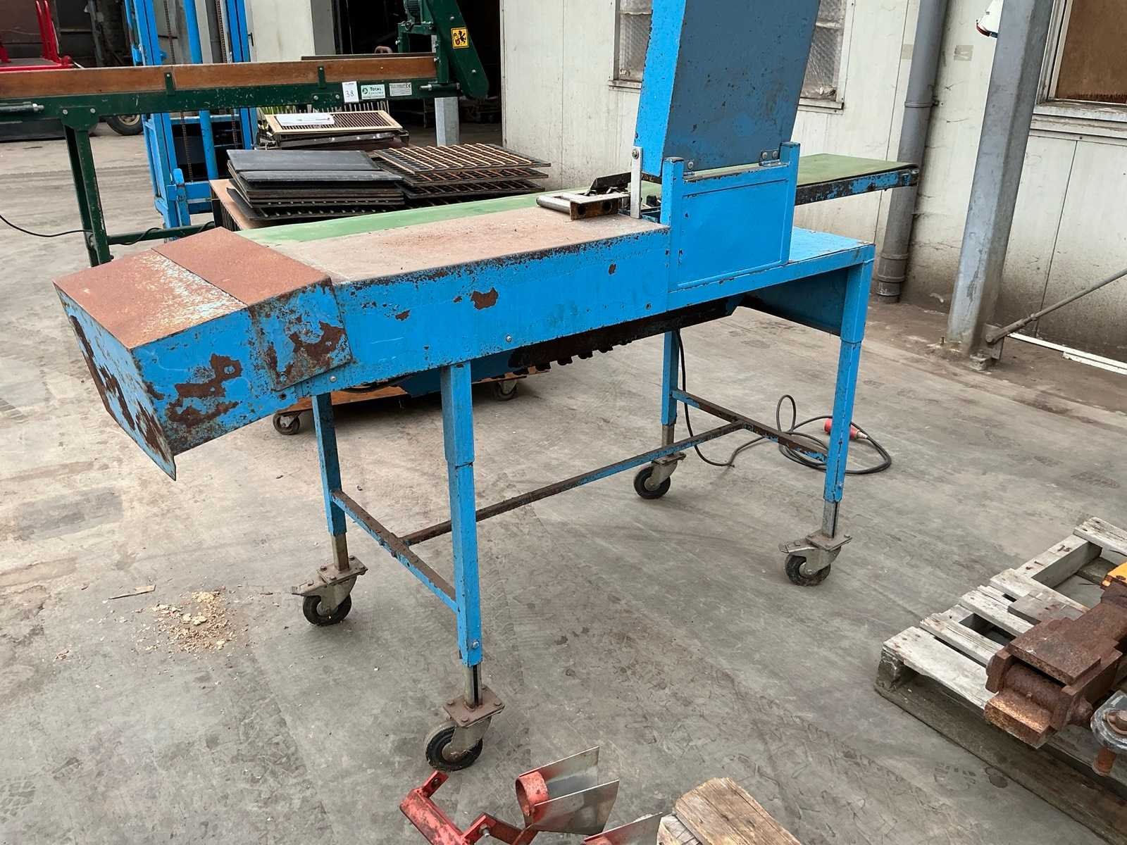 Dubbele snijunit, verstelbare snij/drukpennen, transportband met meenemers, frequentie instelbaar, verrijdbaar onderstel, transportband breedte: 350 mm, Aansluiting: 400V Totale afmeting L: 2480mm Totale afmeting Breedte: 800mm Totale afmeting Hoogte: 1100mm