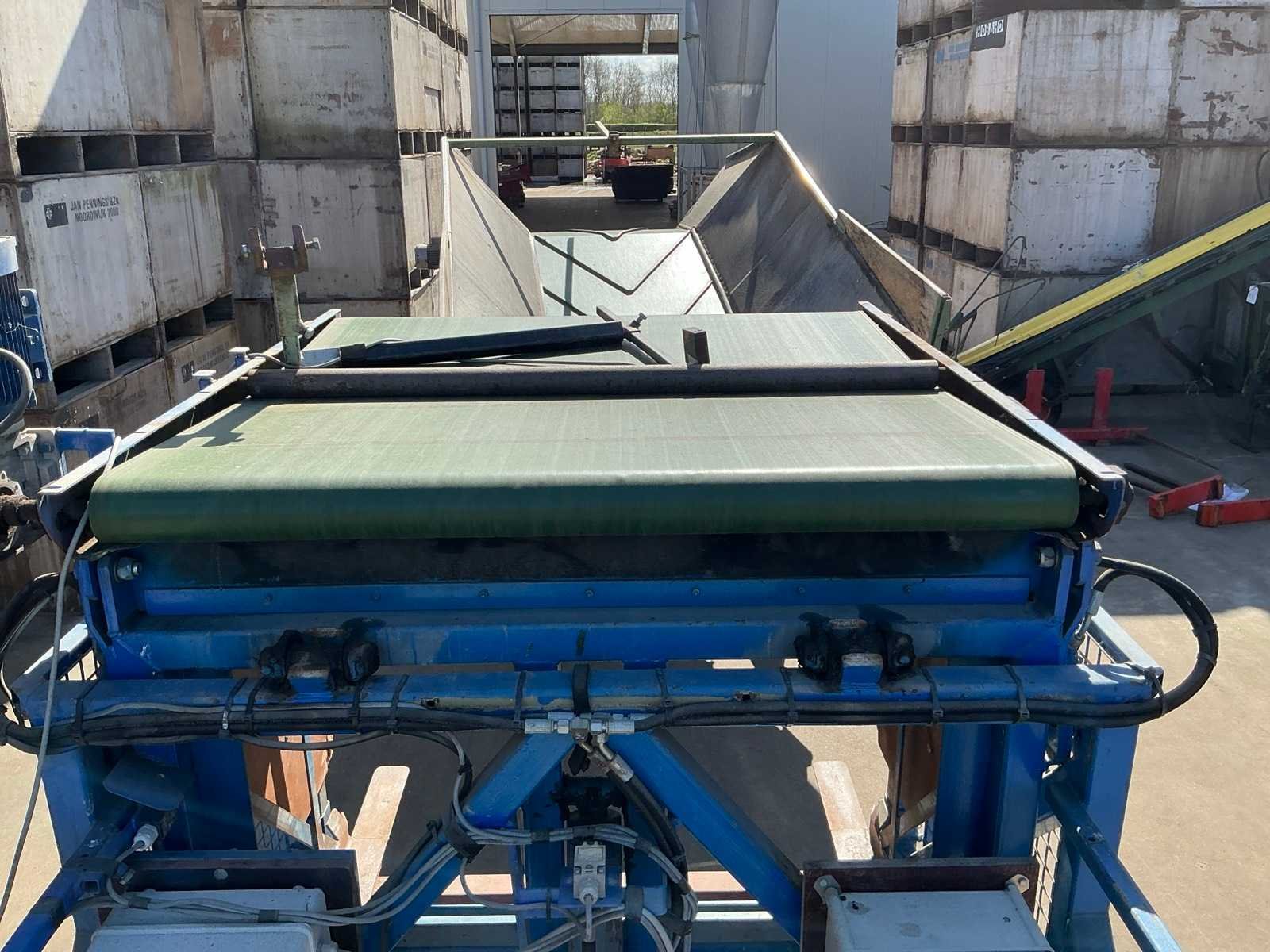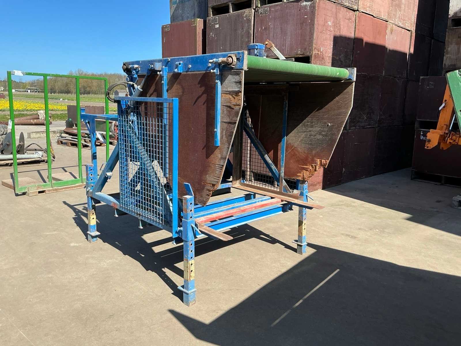V.v. Hydraulische kantelinrichting, opvangband (werkbreedte 1250 mm), Geschikt voor kisten: 1000x1200 mm en 1200x1200 mm. Totale afmeting L: 2300mm Totale afmeting Breedte: 1550mm Totale afmeting Hoogte: 2100mm