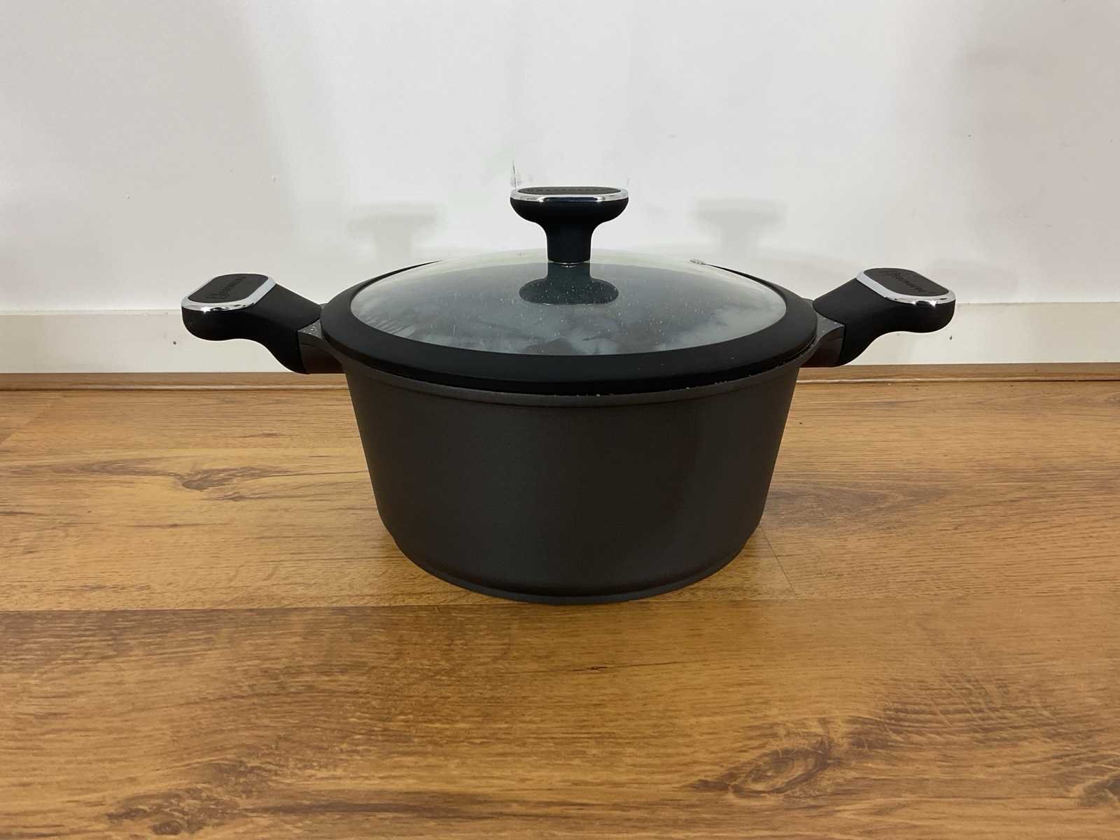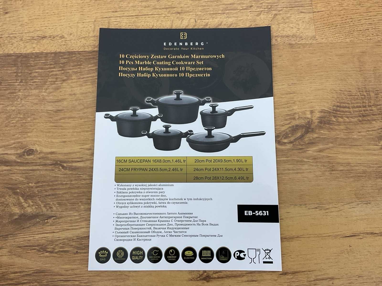 Merk: Edenberg Type: EB-5631 Serie: Black Line Aantal delen: 10-delig Toepassing: Dagelijks koken / professioneel gebruik Materiaal: Gesmeed aluminium Coating: 3-laags marmer / keramische antiaanbaklaag Bodem: Sandwichbodem (gelijkmatige warmteverdeling) Handgrepen: Ergonomisch soft-touch (blijven koel) Deksel: Gehard glas met Antiaanbaklaag Vetarm koken mogelijk: Ja Geschikt voor alle warmtebronnen Kookpan Ø20 cm – ca. 1,9 liter Kookpan Ø24 cm – ca. 4,3 liter Kookpan Ø28 cm – ca. 6,5 liter Steelpan Ø16 cm – ca. 1,5 liter Hapjespan Ø24 cm – ca. 2,5 liter Inclusief glazen deksels Veiligheid & onderhoud Vaatwasserbestendig: Ja Krasbestendig: Ja nieuw in verpakking Merk: Edenberg Model: EB-5631