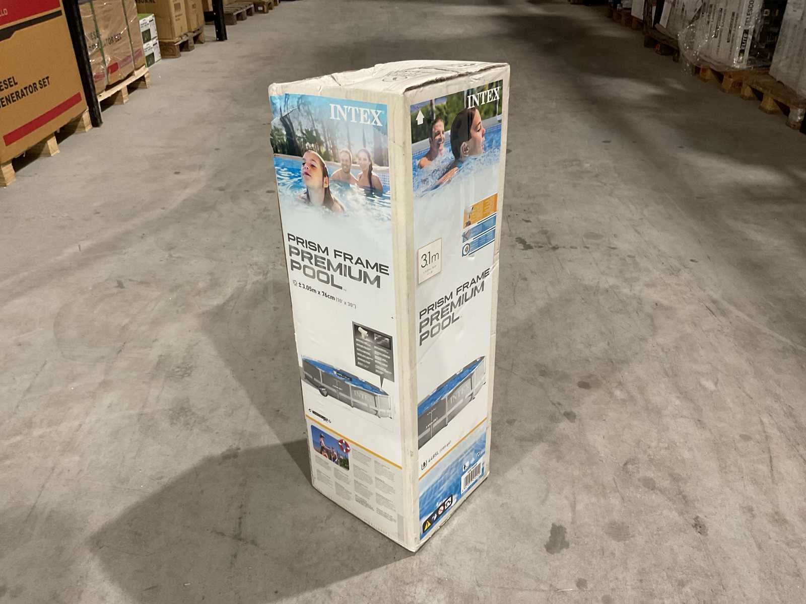 Voorzien van Opzetzwembad; 3-laags PVC met gerasterde polyester tussenlaag; Frame gepoedercoat staal; Vorm: Prism; Inhoud 4485 liter; Aanbevolen waterhoogte 61 cm; Pompaansluiting (mm) 32; Diameter (cm) 305; Hoogte (cm) 76; Dikte liner wand (mm) 0,50; Dikte liner bodem (mm) 0,32; Reparatieset; Ongebruikt in doos Merk: INTEX Model: 26700NP Prism Frame Premium Product type: 3,1m Kleur: Blauw Gewicht: 25.5kg Lengte: 35.6cm Breedte: 34cm Hoogte: 87.6cm Materiaal: Dubbelwandig PVC folie met gerasterde binnenlaag