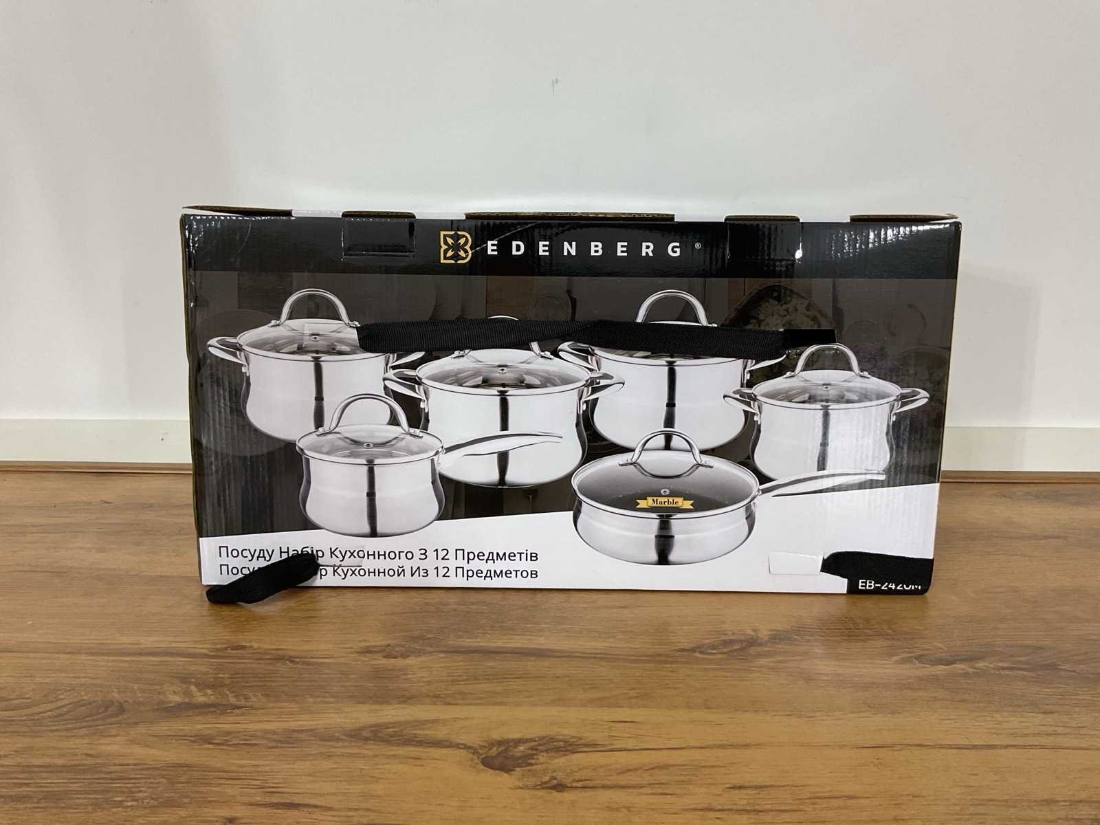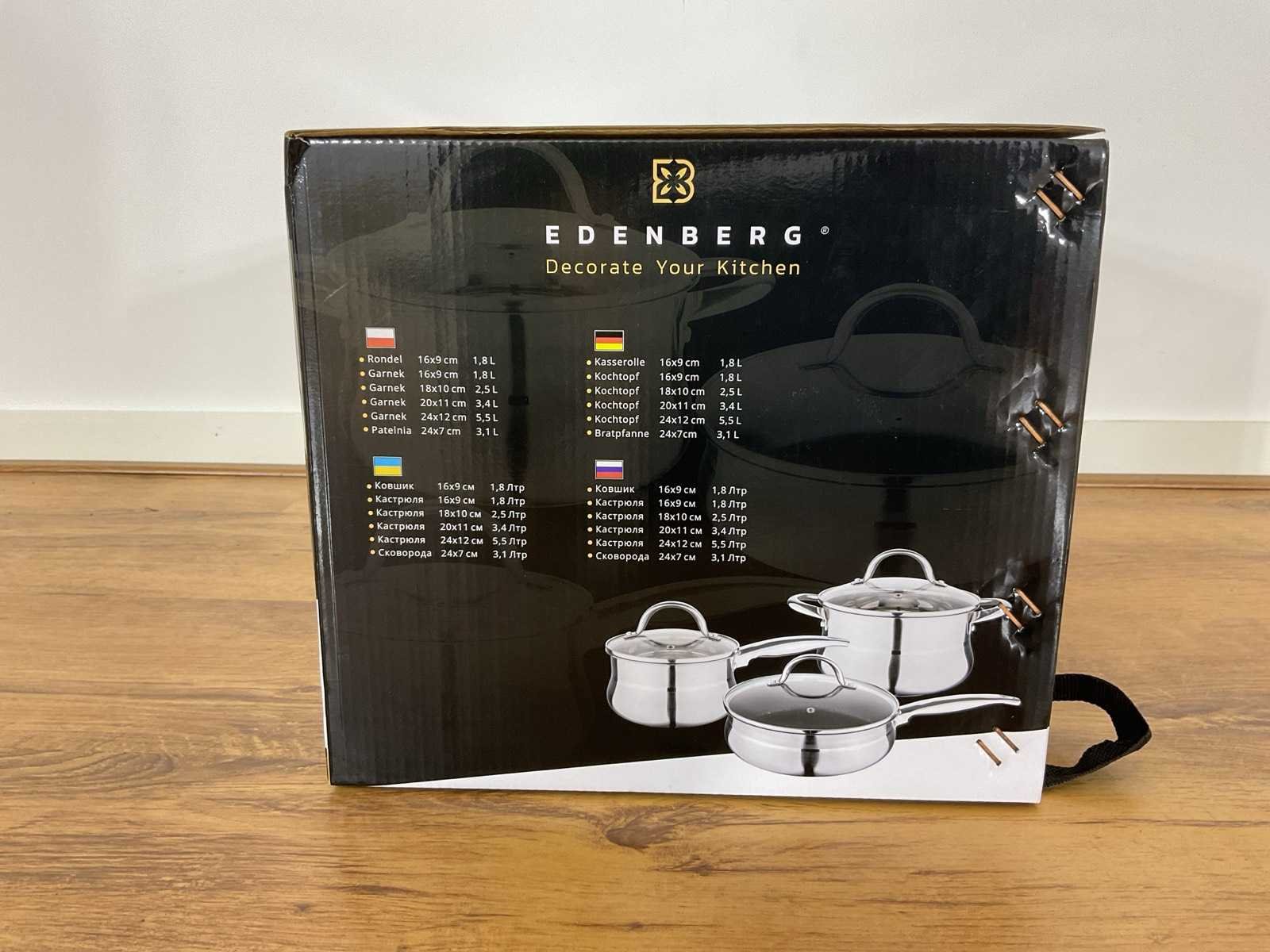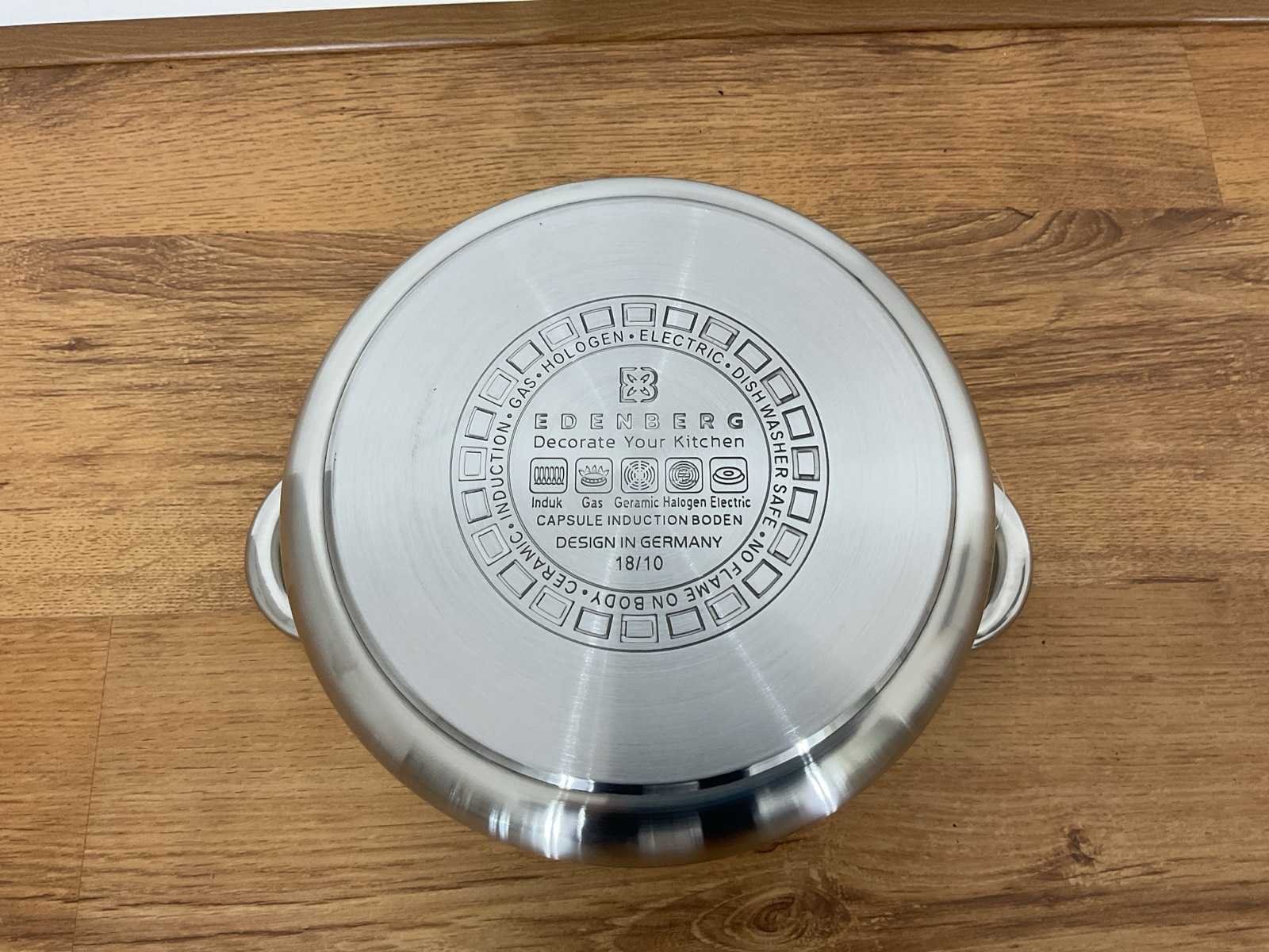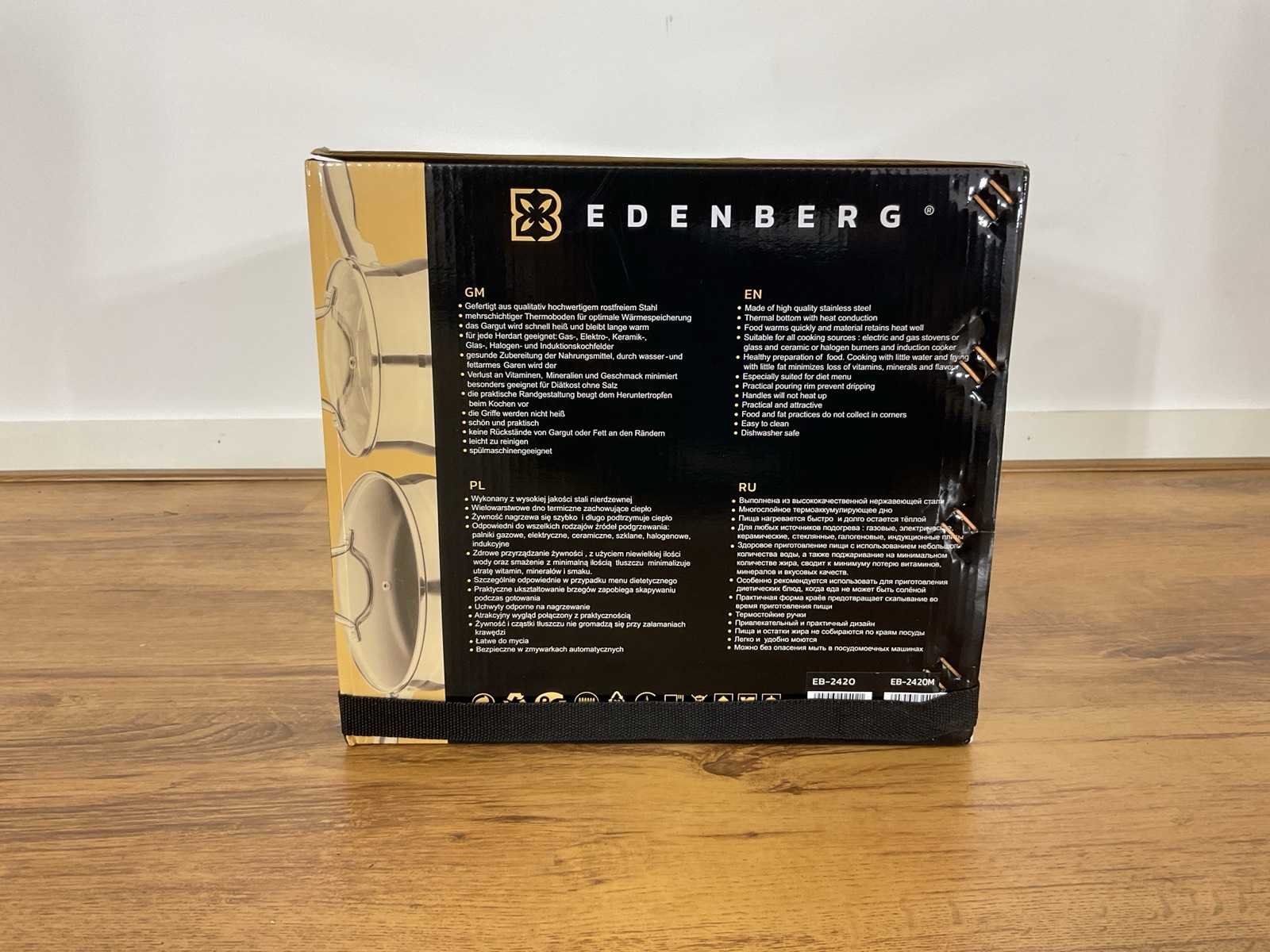 Merk: Edenberg Type: EB-2420M Serie: Classic Line Aantal delen: 12-delig Toepassing: Dagelijks koken / compleet keukenpakket Materiaal: Hoogwaardig roestvrij staal (RVS) Bodem: Sandwichbodem (snelle en gelijkmatige warmteverdeling) Handgrepen: RVS, hittebestendig Deksel: Gehard glas met stoomventiel Warmteverdeling: Snel en gelijkmatig Warmtebehoud: Hoog Geschikt voor alle warmtebronnen: Ja (gas, elektrisch, keramisch, inductie) Energiezuinig koken: Ja Steelpan Ø16 cm – ca. 1,8 liter Kookpan Ø16 cm – ca. 1,8 liter Kookpan Ø18 cm – ca. 2,5 liter Kookpan Ø20 cm – ca. 3,4 liter Kookpan Ø24 cm – ca. 5,5 liter Hapjespan Ø24 cm – ca. 3,1 liter Inclusief glazen deksels Interne maatverdeling: Ja Druipvrije rand: Ja Vaatwasserbestendig: Ja Onderhoud: Eenvoudig te reinigen nieuw in doos Merk: Edenberg Model: EB-2420M