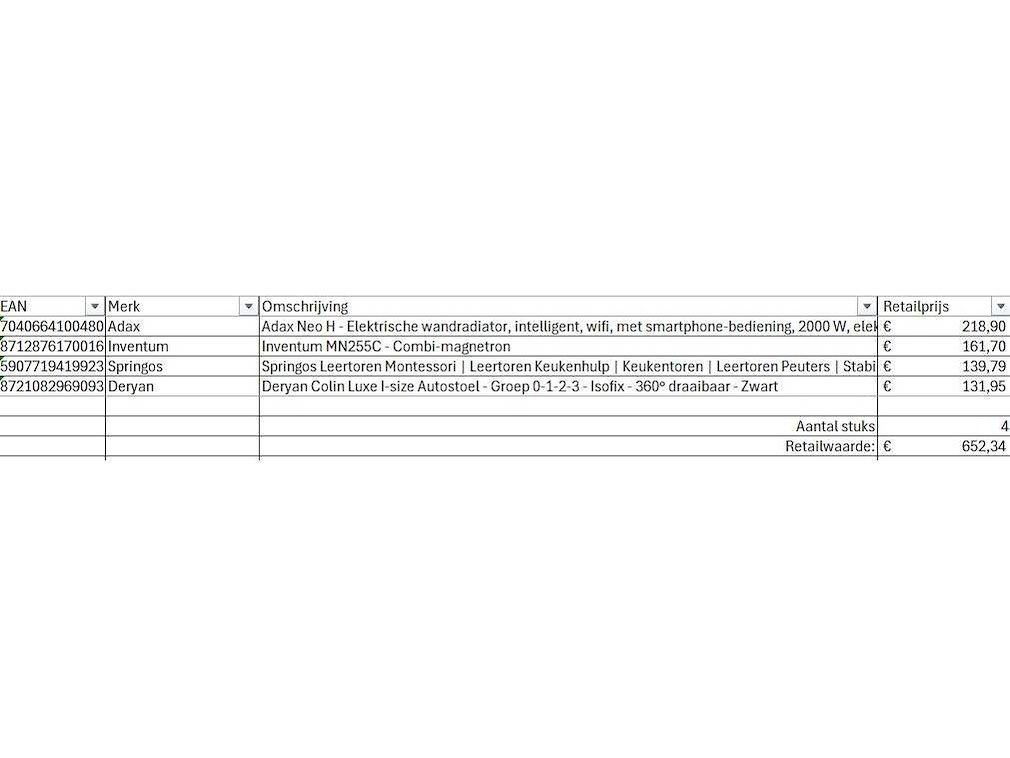 Dit betreft een partij A-merk retourgoederen van een grote online retailer. De partij bestaat uit diverse productcategorieën. Aantal stuks: . Retailwaarde: €,- Ongecontroleerd: werking onbekend (mix van werkend, incompleet, beschadigd, te gebruiken voor onderdelen). Kom op de kijkdag om te om zo een goed beeld te krijgen van de reden van retour. Zie foto's voor lijst met inhoud. Merk: Pallet