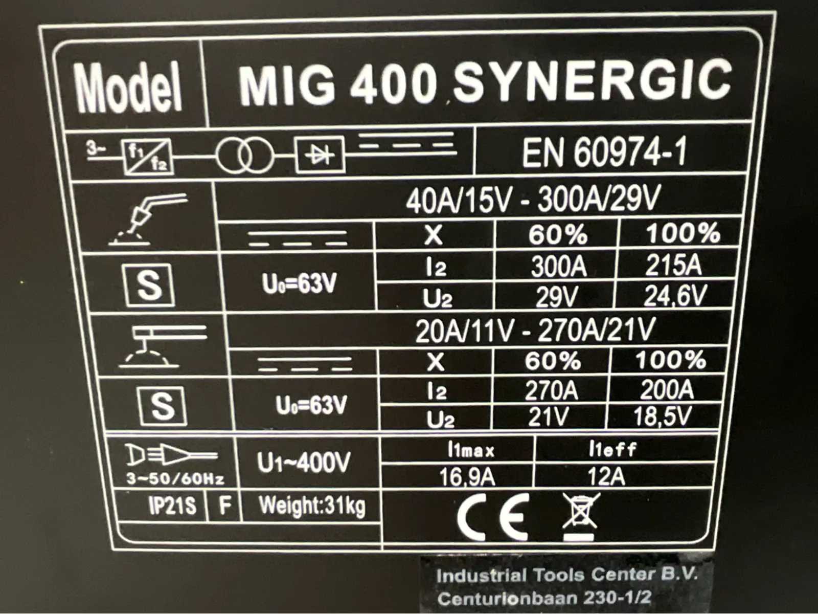 Ongebruikt in de originele verpakking Microprocessor gestuurde MIG/MAG/MMA/TIG Lift inverter multi-proces lasmachine. Ingangsspanning - 3PH 400V Netfrequentie - 50/60 Hz Stroombereik - 20-300A Maximale stroom - 300A @60% DC-stroom - 205A Maximale onbelaste spanning - 63V Maximaal opgenomen stroom - 15A Geabsorbeerde stroom bij 60% - 10A Maximaal opgenomen vermogen - 9 kW Opgenomen vermogen bij 60% - 6,5 kW Vermogensfactor - 0,9 Merk: Hyper Welding Type: MIG-400 Bouwjaar: 2026 Mig type: true Ampère belasting: 400A Digitale uitlezing: true Aansluiting: 220V Handboek aanwezig: true