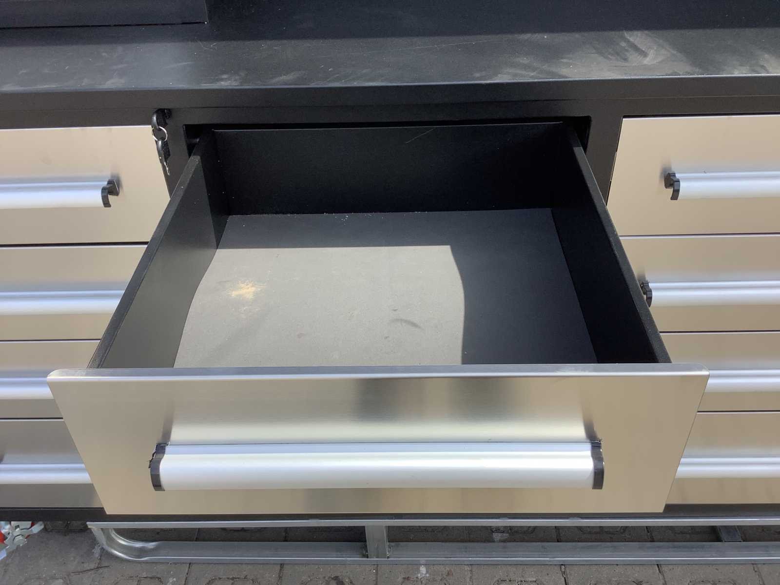 Modulair, 2-delig, verrijdbaar: voorzien van metalen werkblad, achterwand, 2 kasten, 30 schuifladen, onderste 20 laden afsluitbaar (2 sleutels mee inbegrepen) Merk: Field Model: H10FT-30D-01C Breedte: 2840mm Lengte: 585mm Hoogte: 1900mm Materiaal: RVS / Stainless steel