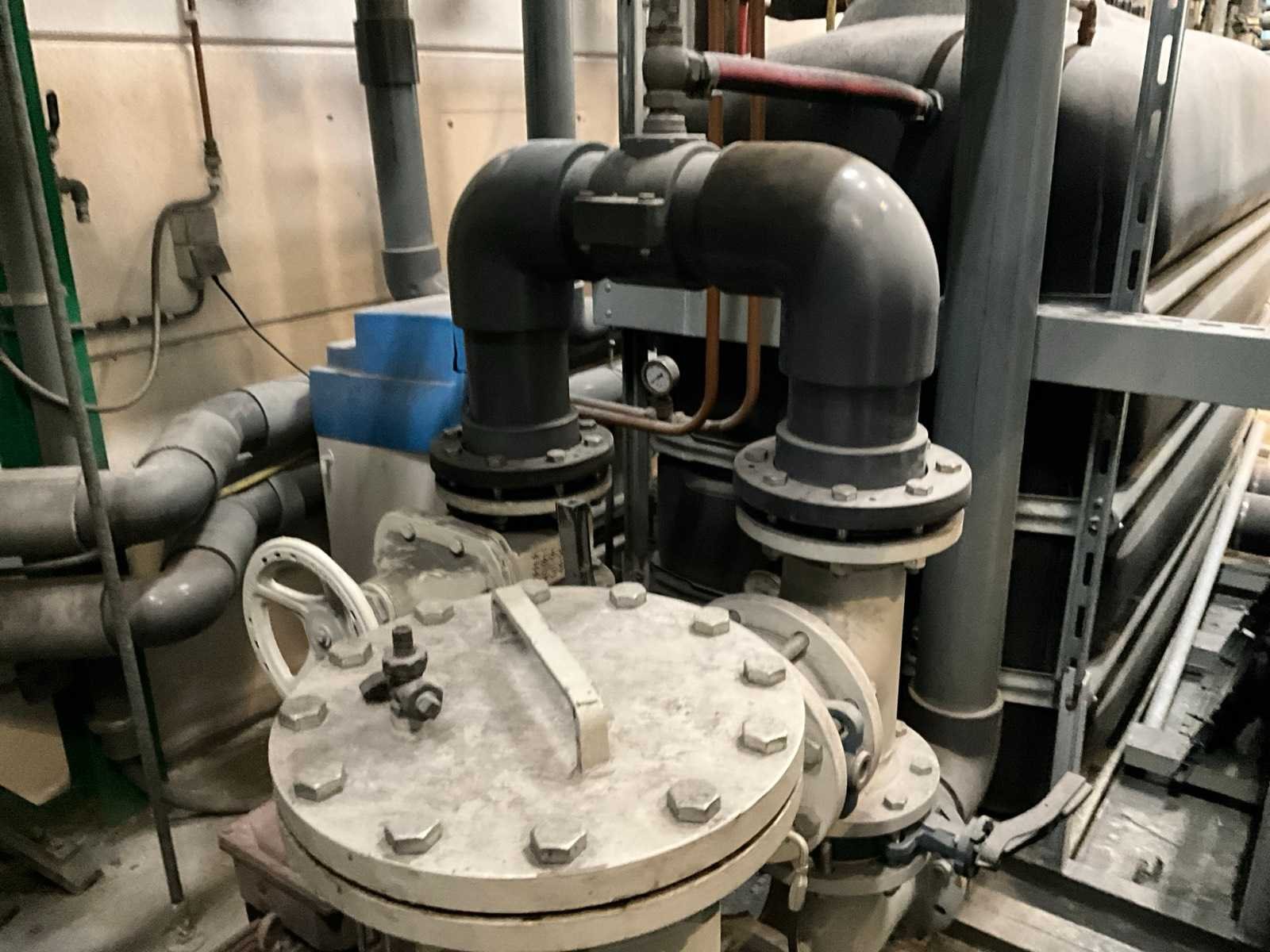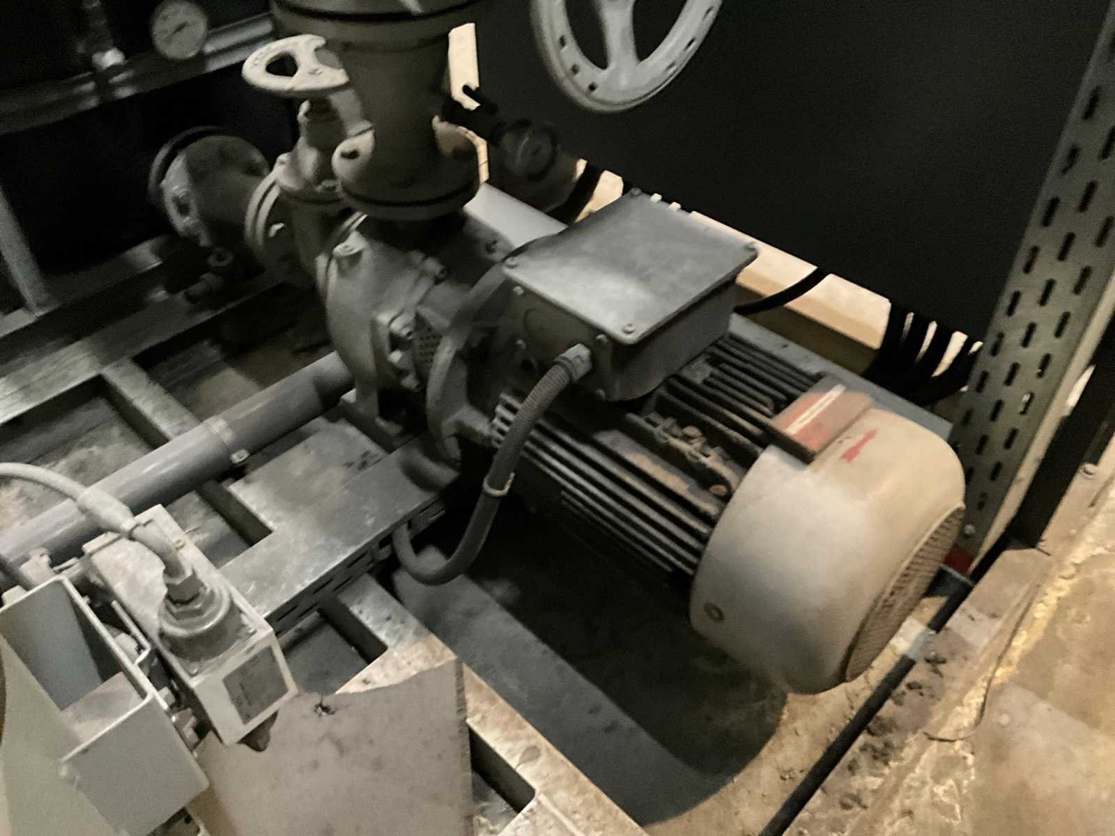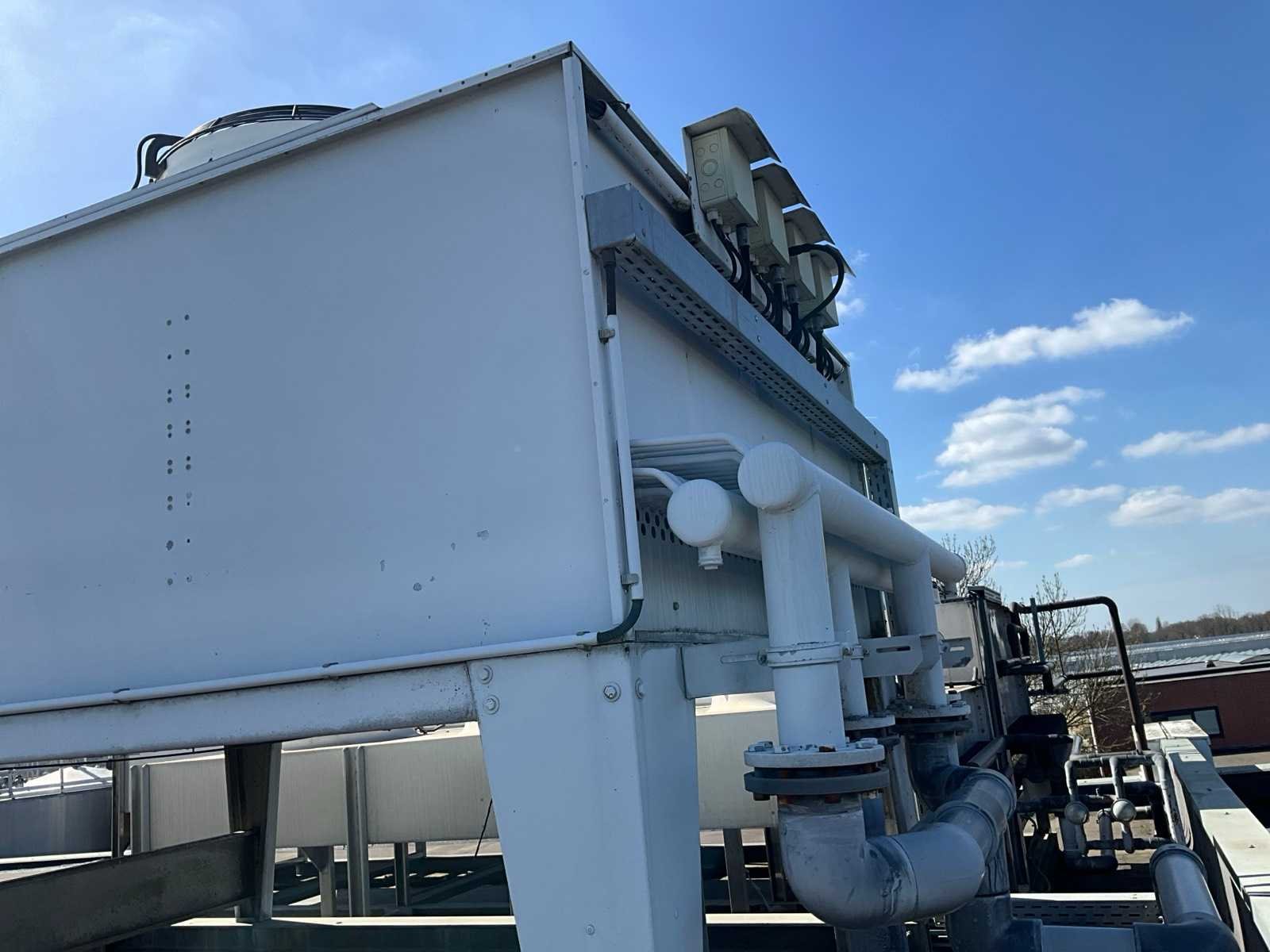 Bestaande uit 1x koelwater pompunit, voorzien van 2x 3000 ltr koelwater tanks, 2x circulatie pomp, besturingskast, vloeroppervlakte 3700x2400 mm, 1x condensor op het dak, gemonteerd op stalen frame, voorzien van 12x ventilator, condensor afmeting (LxWxH) 12300x2400x3000 mm, water verneveling, Let op! afhalen op afspraak, leidingwerk niet inbegrepen, koudemiddel is reeds afgetapt Merk: GWK Aansluiting: 400V Vermogen: 57kW Serienummer: 221360-07-01 Bouwjaar: 2007